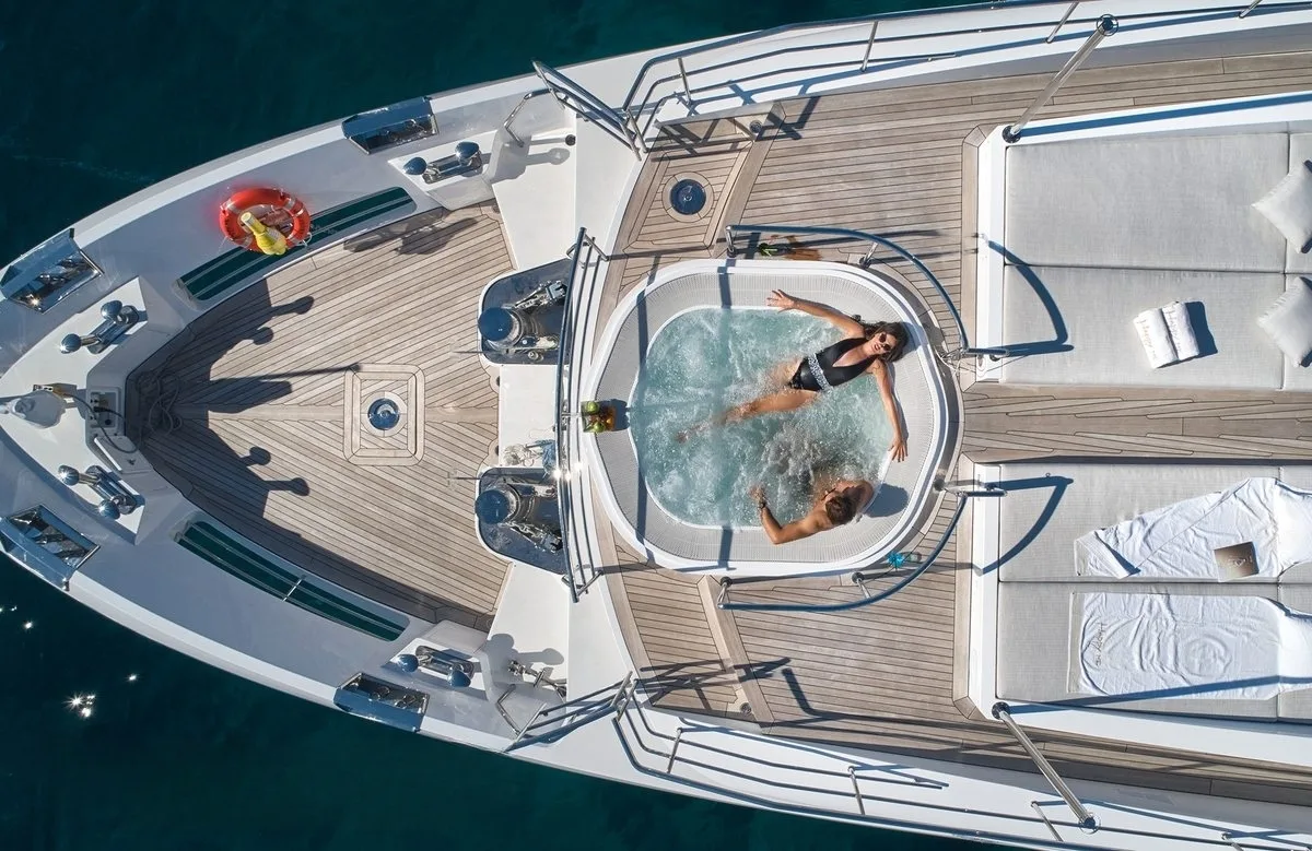 Life aboard Happy Me is a symphony of comfort and relaxation. Picture yourself unwinding in the bubbling jacuzzi or maintaining your fitness routine in the state-of-the-art gym, with the ocean as your backdrop. The yacht’s massage room offers a sanctuary for the senses, while the seamless Wi-Fi keeps you connected to the world if you so choose. As daylight fades, gather with friends for an al fresco dinner prepared on the BBQ, followed by an evening of entertainment with satellite TV and karaoke. The sophisticated interior, curated by designer Zuretti, provides an elegant setting for every occasion.