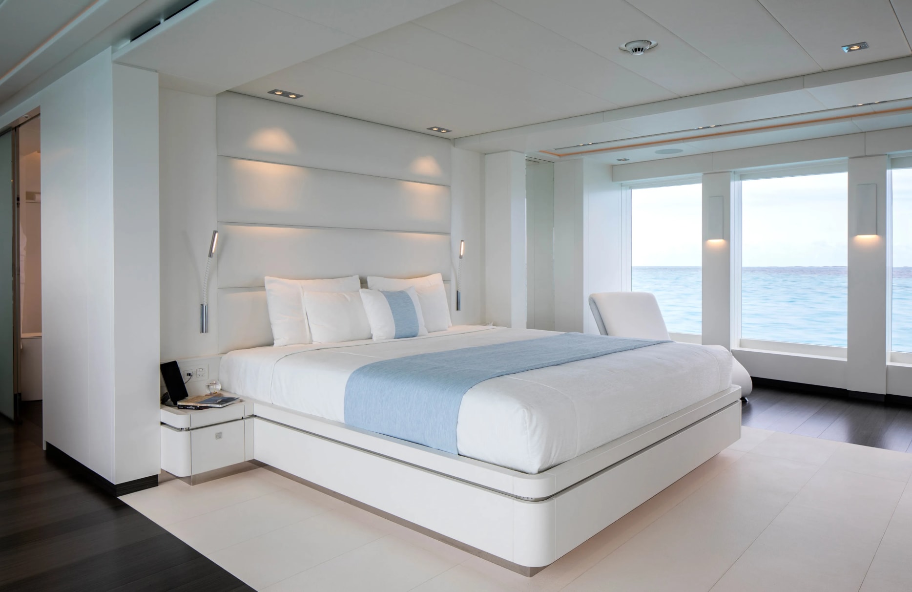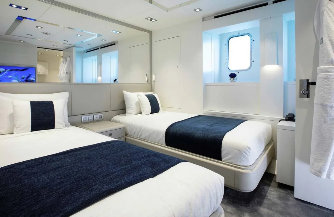 The accommodations aboard ‘Home’ are a testament to refined comfort and elegance, hosting up to 12 guests in six beautifully appointed suites. Imagine waking up in the master suite on the main deck, where the morning light gently filters through to greet you. Each cabin, whether the inviting double or the versatile twin, is a haven of tranquility, offering plush bedding and meticulous attention to detail. With a configuration that includes king and queen beds, as well as singles for versatility, every guest is assured a restful night’s sleep, lulled by the gentle sway of the sea.
