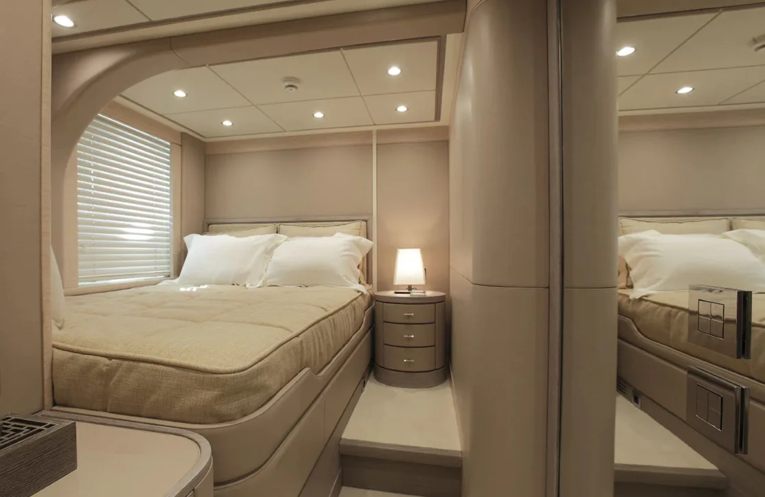 Accommodations aboard ‘In Love’ are as versatile as they are exquisite, designed to welcome up to eight guests in four beautifully appointed cabins. Each morning, awaken to the gentle lull of the sea in the master suite or the inviting VIP cabin, both offering serene privacy and comfort. Two additional cabins, a double and a twin, ensure that families or groups of friends can tailor their sleeping arrangements to suit their needs. With a crew of five attending to every detail, your stay is marked by seamless service and unparalleled comfort.