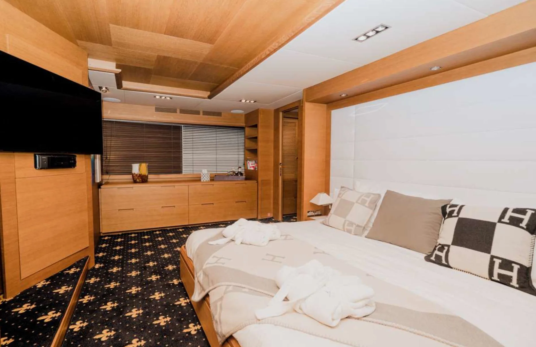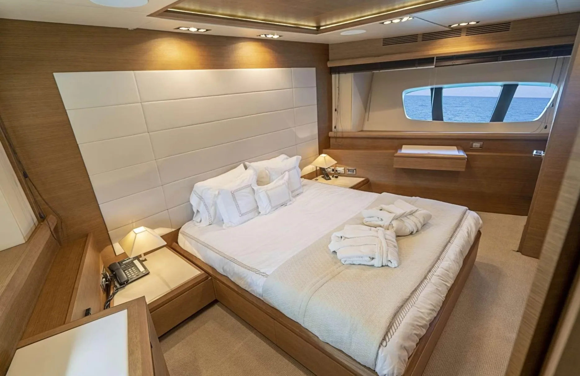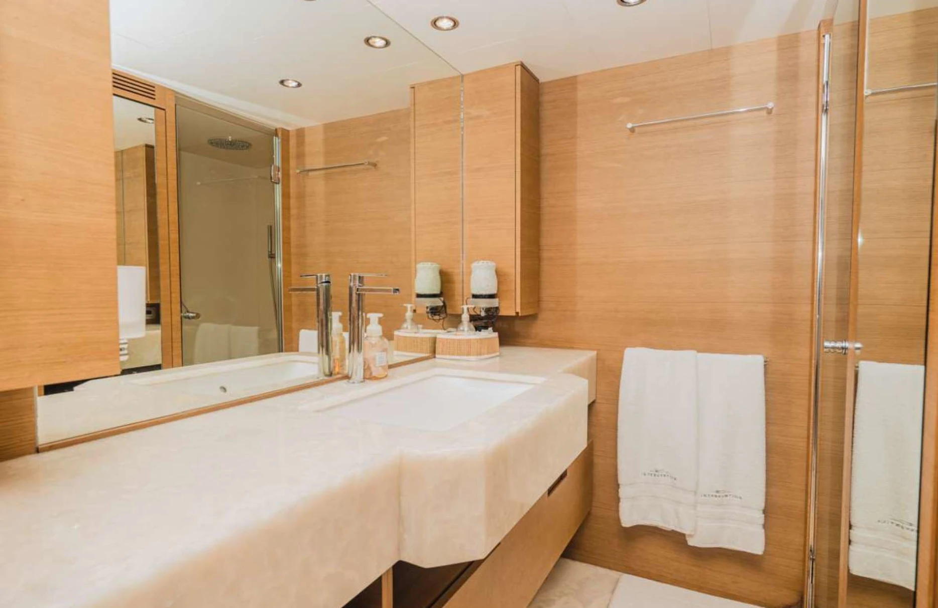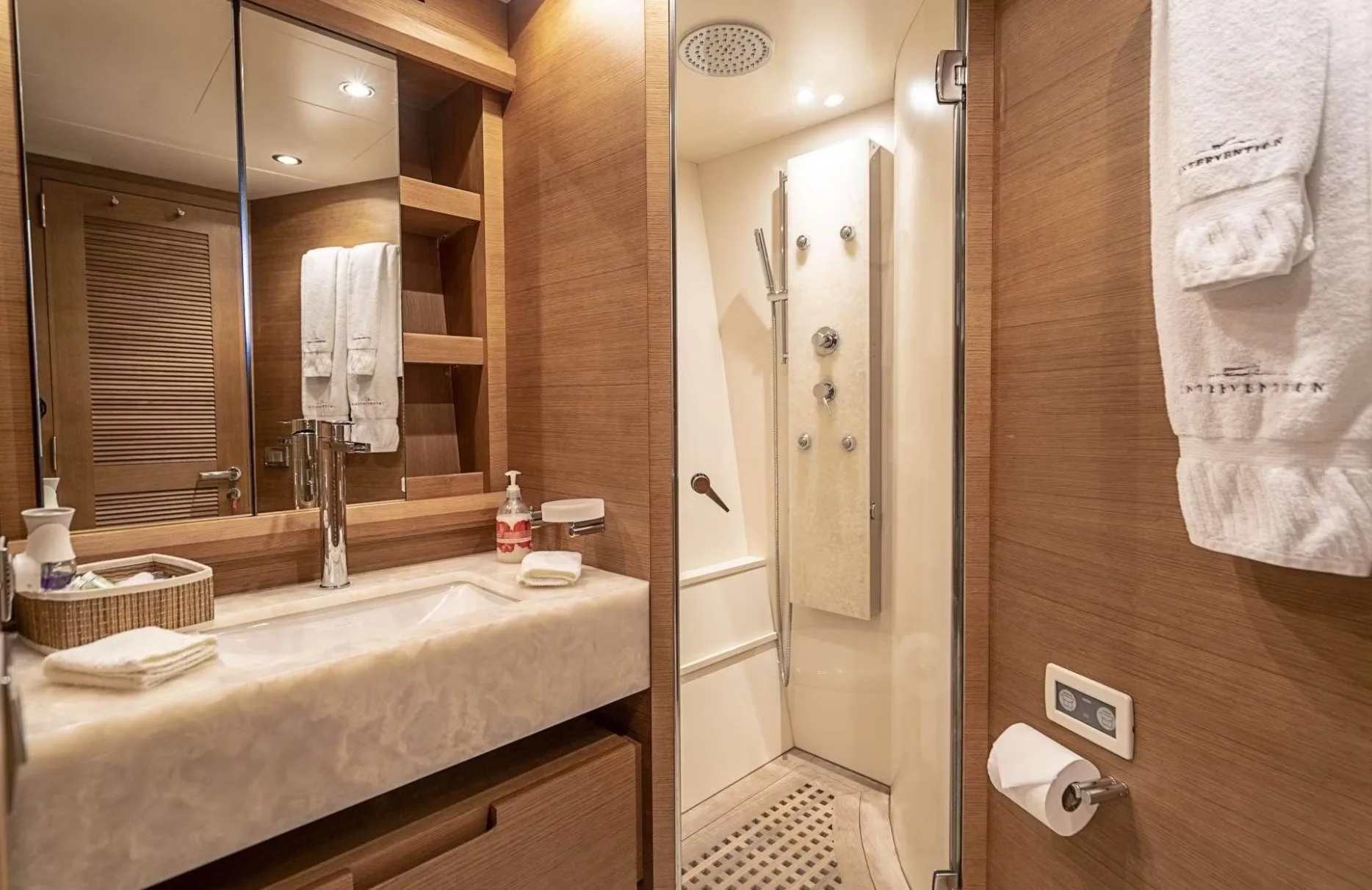 Aboard Intervention, each moment is infused with tranquility and pleasure. The spacious sundeck is an ideal locale for sun-drenched afternoons, where sunpads invite you to bask in warmth, while the deck jacuzzi offers a refreshing respite. As evening falls, the underwater lights cast a mesmerizing glow, setting the stage for intimate gatherings. With Wi-Fi to keep you connected and air-conditioned interiors providing respite from the heat, every detail is curated for comfort. At-anchor stabilizers ensure a serene experience even when the yacht is stationary, making your time aboard effortlessly enjoyable.