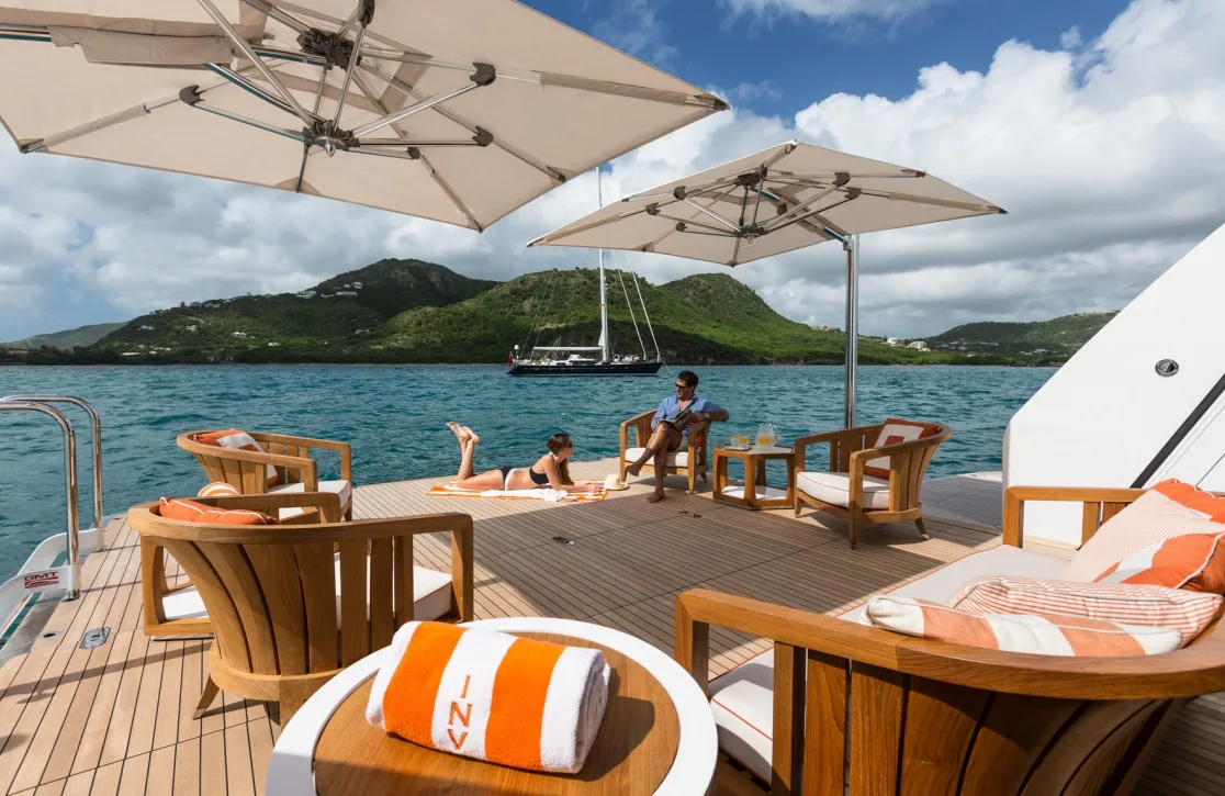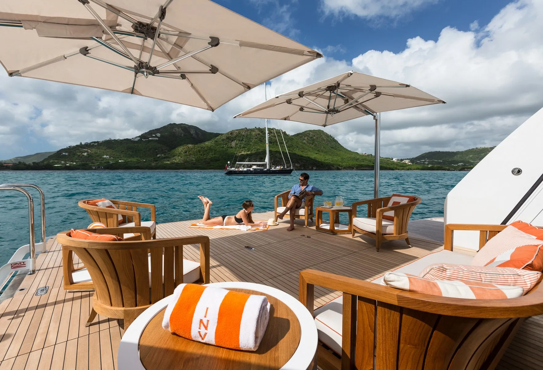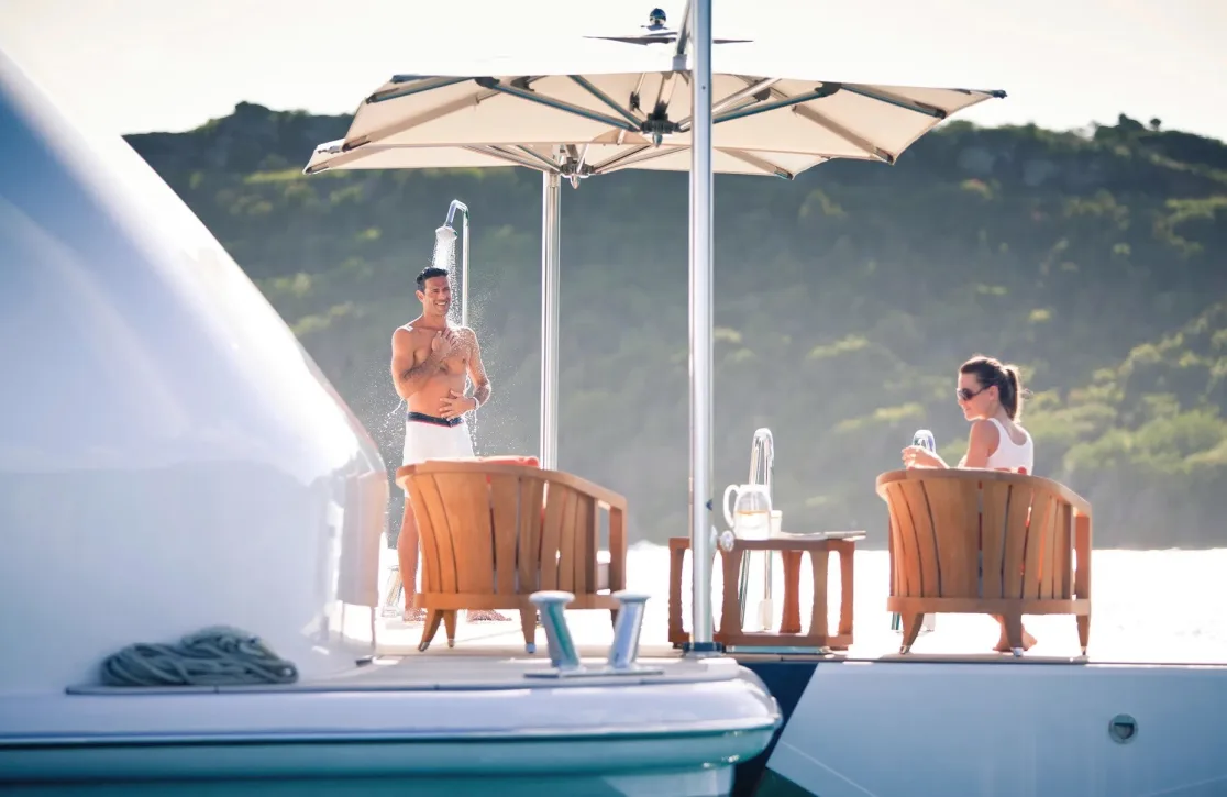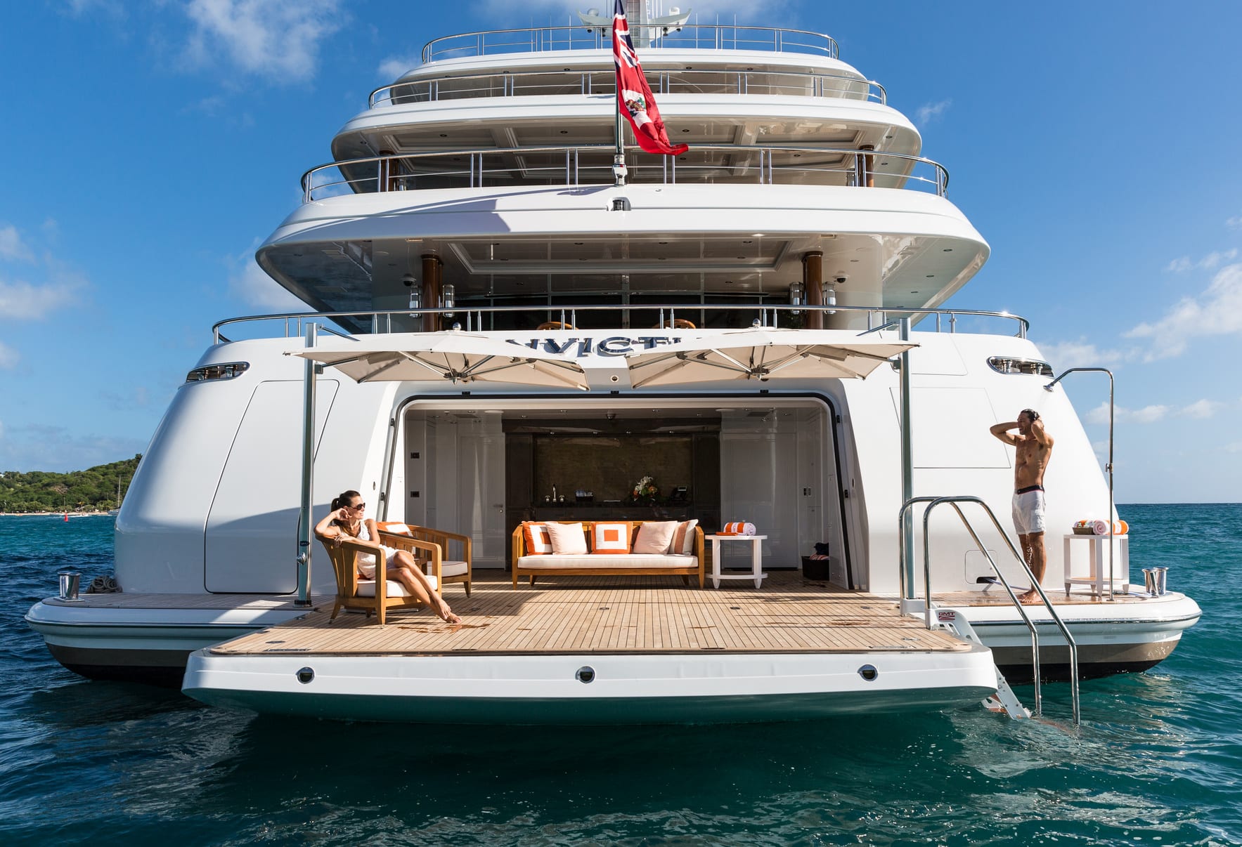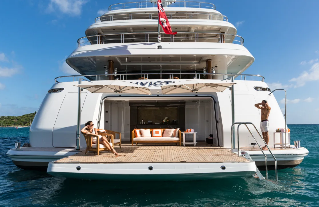 Step into a world where comfort meets tranquility on board Invictus. The yacht’s inviting spaces are designed for leisurely days and vibrant evenings. Picture yourself unwinding in the beach club, where the gentle lap of waves sets a soothing rhythm, or staying active in the state-of-the-art gym with panoramic views. As the sun dips below the horizon, the deck jacuzzi beckons for a relaxing soak under a sky full of stars. Inside, the theater promises cinematic evenings with your favorite films, while the elevator ensures all areas of the yacht are easily accessible. Connectivity is seamless, with Wi-Fi and satellite TV ready to keep you in touch with the world.