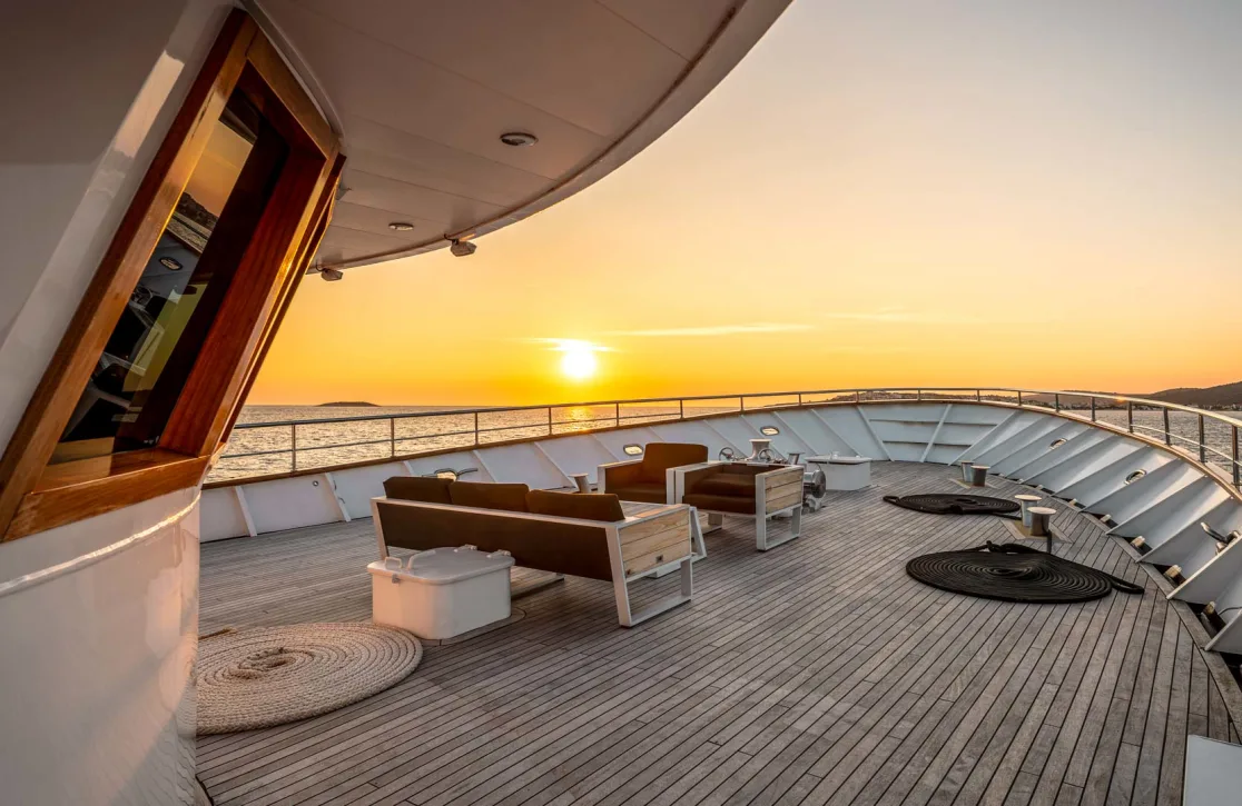 Onboard Karizma, each day unfolds with effortless grace. Begin your morning with a rejuvenating swim off the platform, followed by a serene soak in the deck jacuzzi under the sun’s gentle rays. As the day progresses, retreat to the movie theatre for an intimate film screening, or savor the sunset from the comfort of plush sunpads. Throughout your journey, seamless connectivity keeps you in touch, while the ambiance of air-conditioned interiors offers a cool respite from the day’s adventures.