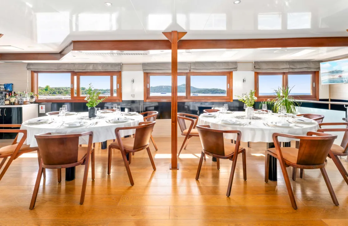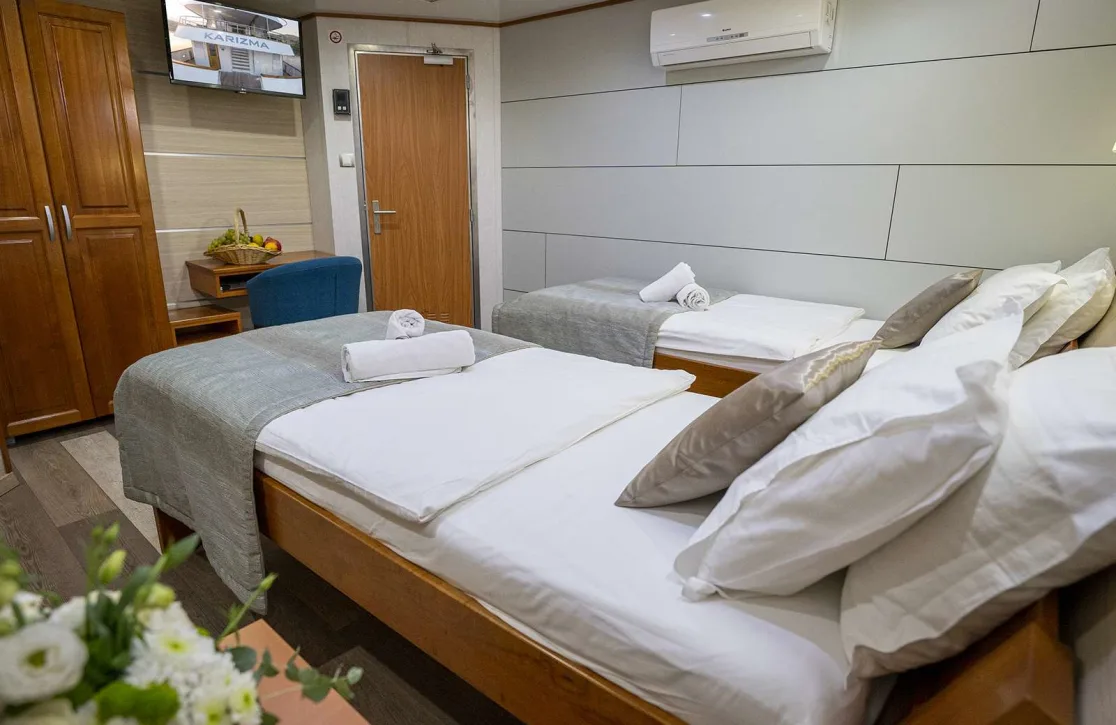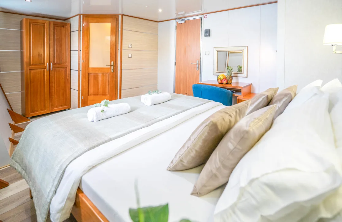 Karizma’s 17 elegantly appointed cabins provide a haven of tranquility for up to 36 guests. Each space is a sanctuary of refined comfort, where waking up to the gentle sway of the sea is a serene experience. Thoughtfully designed interiors ensure restful nights and invigorating mornings, setting the stage for another day of discovery and relaxation.