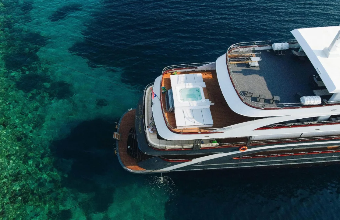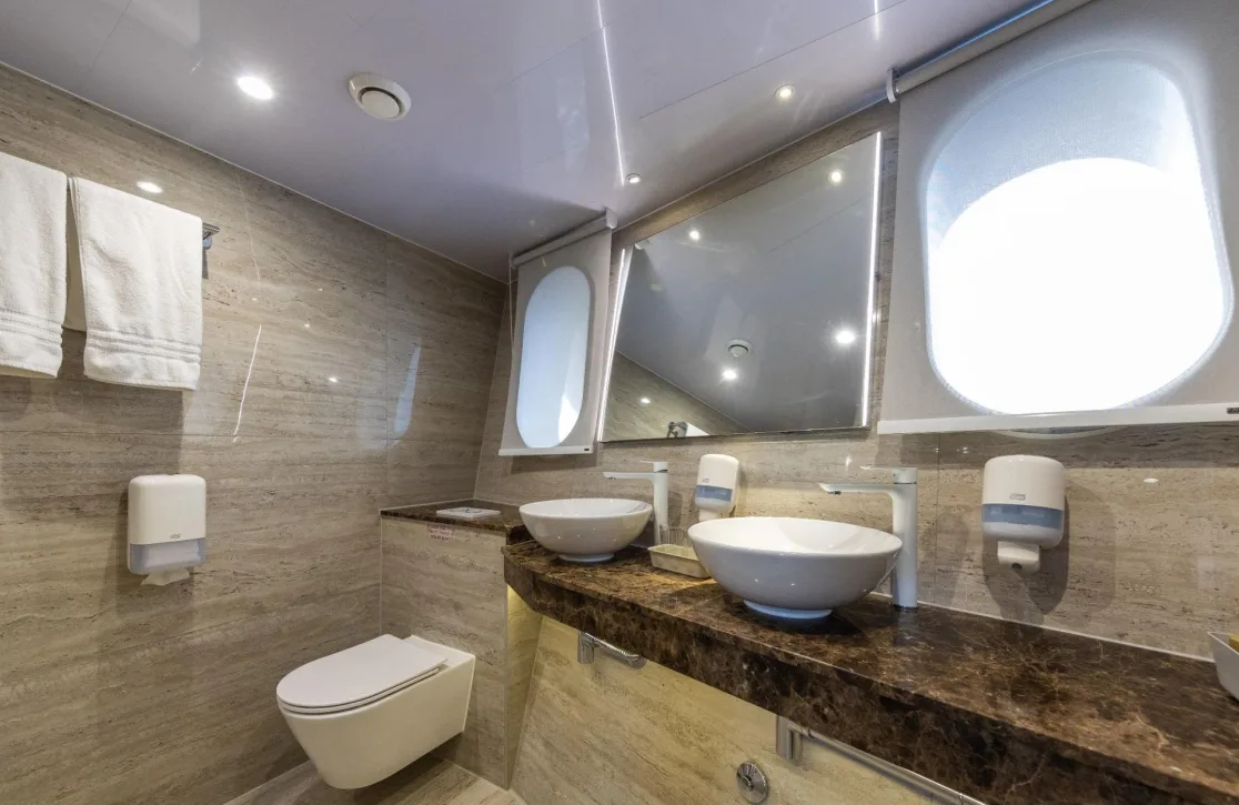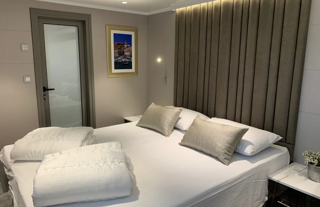 Lady Eleganza redefines the meaning of comfort with her exceptional accommodations, which can host up to 36 guests in 16 tastefully appointed cabins. Each morning, guests awaken to the gentle sway of the ocean in one of the seven VIP suites or the elegant double and twin cabins. Designed with flexibility in mind, the cabins offer both king-sized and single configurations, ensuring a restful night’s sleep. The generous space and serene design of each room invite you to unwind and rejuvenate, while the attentive crew ensures every detail is tailored to your preferences, creating a personal haven on the high seas.