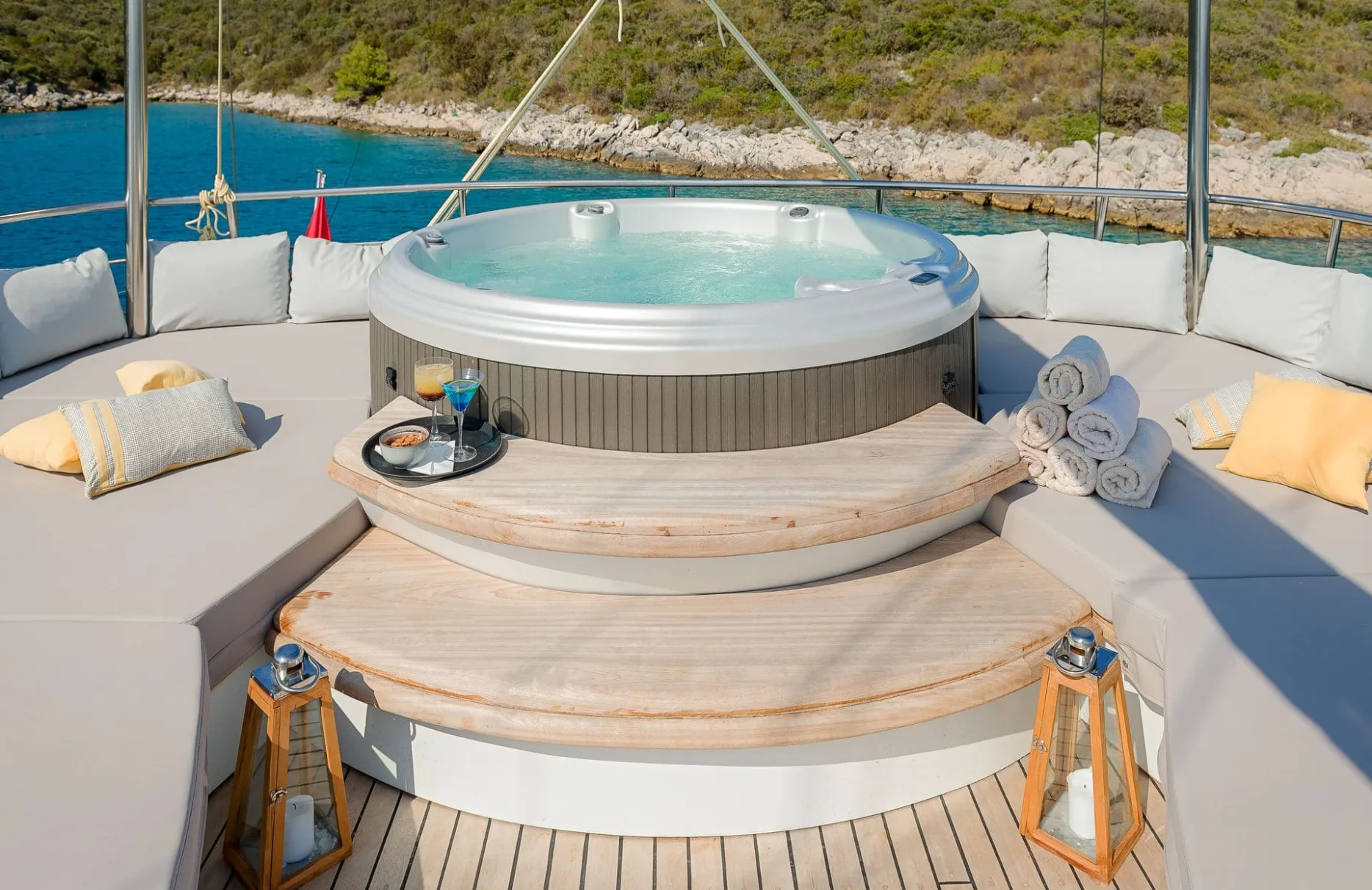 Life aboard Lady Gita is a harmonious blend of refinement and relaxation. Picture yourself basking in the sun on the spacious deck, where sunpads and a Jacuzzi invite you to unwind under the azure sky. Evenings transform into memorable gatherings with a BBQ under the stars, while the air-conditioned interiors offer a cool respite during the day. Stay connected with Wi-Fi as you enjoy the latest entertainment via satellite TV, ensuring every moment aboard is tailored to your desires.