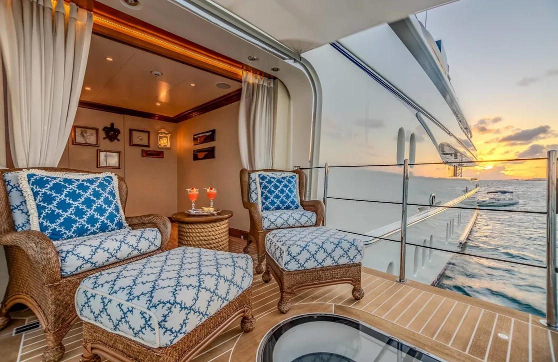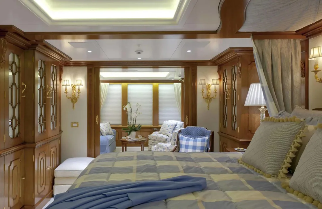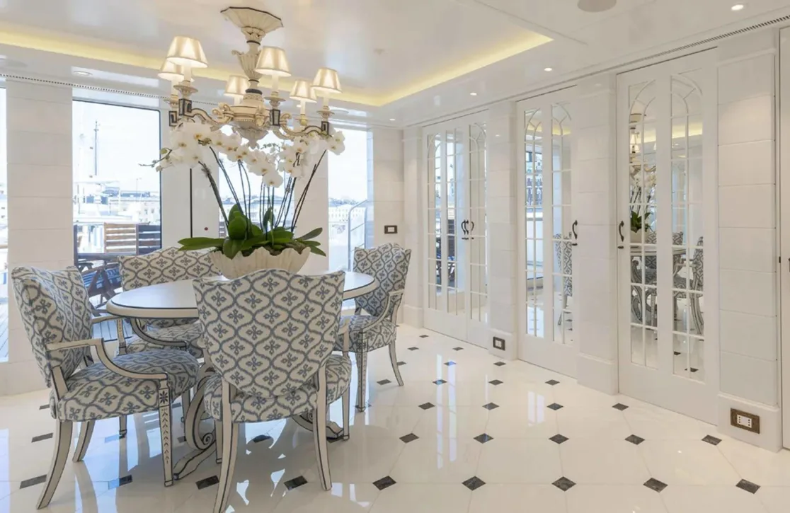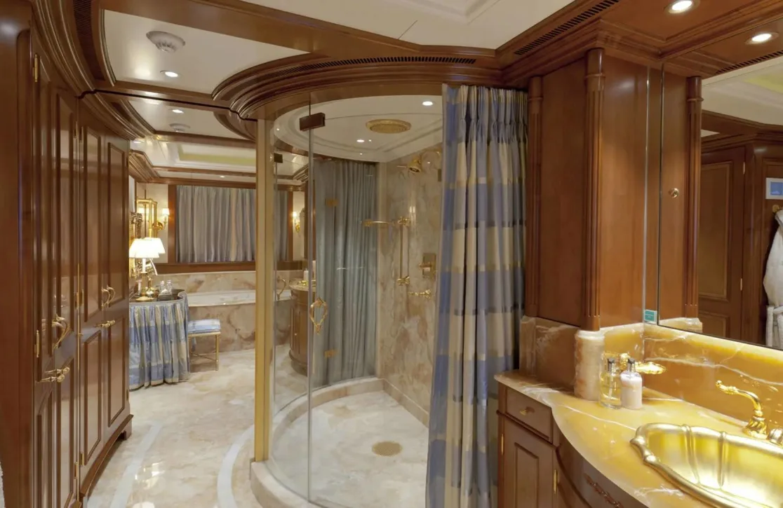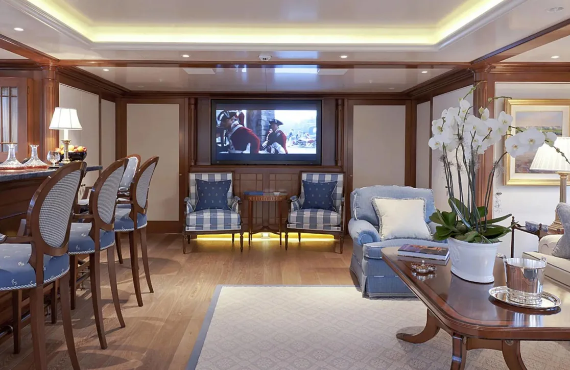 Onboard Lady Kathryn V, the days are filled with moments of pure relaxation and invigorating activity. Begin your morning with a rejuvenating session in the steam room or sauna, melting away the stresses of the everyday. As the sun climbs higher, the deck jacuzzi beckons with its promise of bubbly respite. Fitness enthusiasts will appreciate the state-of-the-art gym, while the expansive sun deck offers the perfect spot for sunbathing or enjoying a refreshing cocktail from the exterior bar. As evening falls, gather in the elegantly appointed interior spaces, where satellite TV and video on-demand provide endless entertainment options, complemented by the warmth of refined social settings.