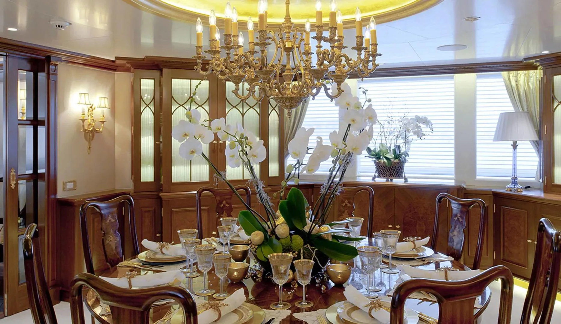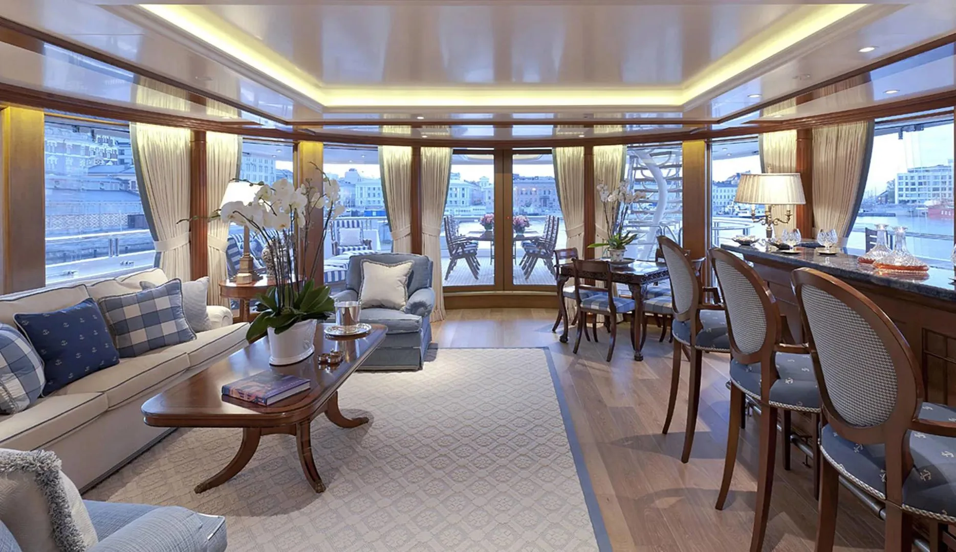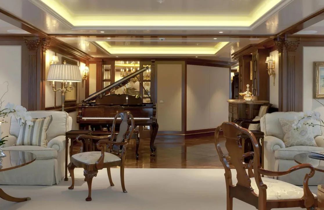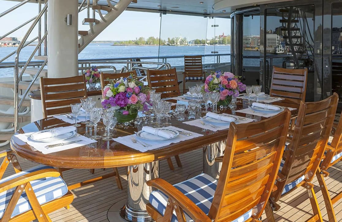 Onboard Lady Kathryn V, the days are filled with moments of pure relaxation and invigorating activity. Begin your morning with a rejuvenating session in the steam room or sauna, melting away the stresses of the everyday. As the sun climbs higher, the deck jacuzzi beckons with its promise of bubbly respite. Fitness enthusiasts will appreciate the state-of-the-art gym, while the expansive sun deck offers the perfect spot for sunbathing or enjoying a refreshing cocktail from the exterior bar. As evening falls, gather in the elegantly appointed interior spaces, where satellite TV and video on-demand provide endless entertainment options, complemented by the warmth of refined social settings.
