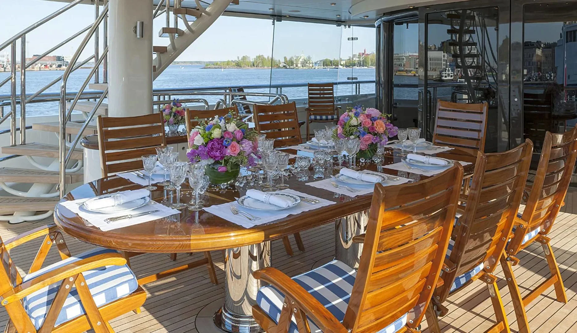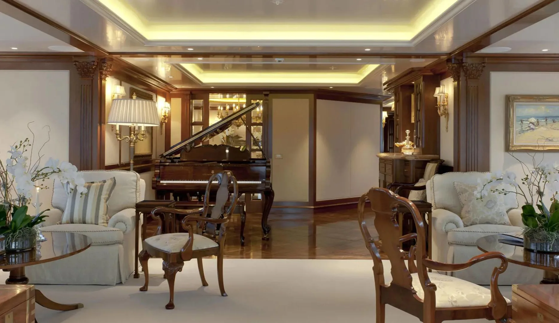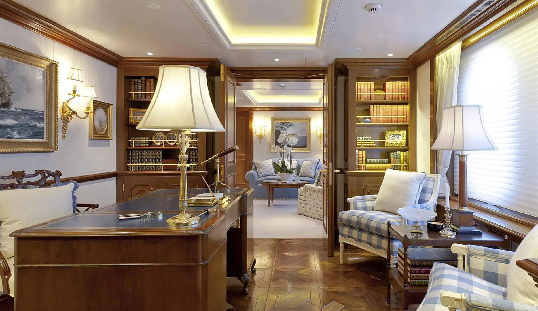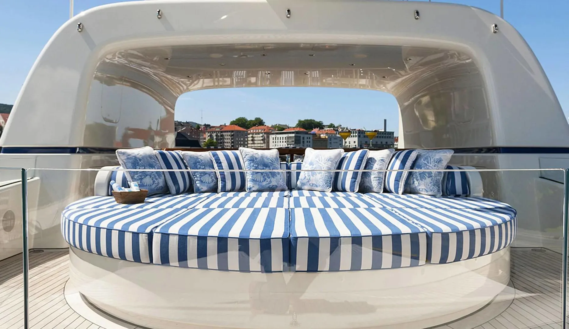 Onboard Lady Kathryn V, the days are filled with moments of pure relaxation and invigorating activity. Begin your morning with a rejuvenating session in the steam room or sauna, melting away the stresses of the everyday. As the sun climbs higher, the deck jacuzzi beckons with its promise of bubbly respite. Fitness enthusiasts will appreciate the state-of-the-art gym, while the expansive sun deck offers the perfect spot for sunbathing or enjoying a refreshing cocktail from the exterior bar. As evening falls, gather in the elegantly appointed interior spaces, where satellite TV and video on-demand provide endless entertainment options, complemented by the warmth of refined social settings.