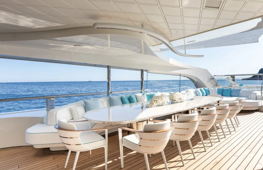 Aboard Lady S, each day unfolds with a new chapter of indulgence and relaxation. Bask in the sun by the shimmering pool, or find solace in the tranquil embrace of the sauna and steam room after a day spent on the water. As evening descends, the outdoor cinema offers an unparalleled viewing experience under the starlit sky, while the movie theatre inside invites you to lose yourself in cinematic wonders. For those seeking to maintain their fitness regime, a state-of-the-art gym awaits, promising rejuvenation and vitality. The expansive deck spaces invite both solitude and togetherness, with the helipad ensuring that every arrival and departure is as breathtaking as the journey itself.