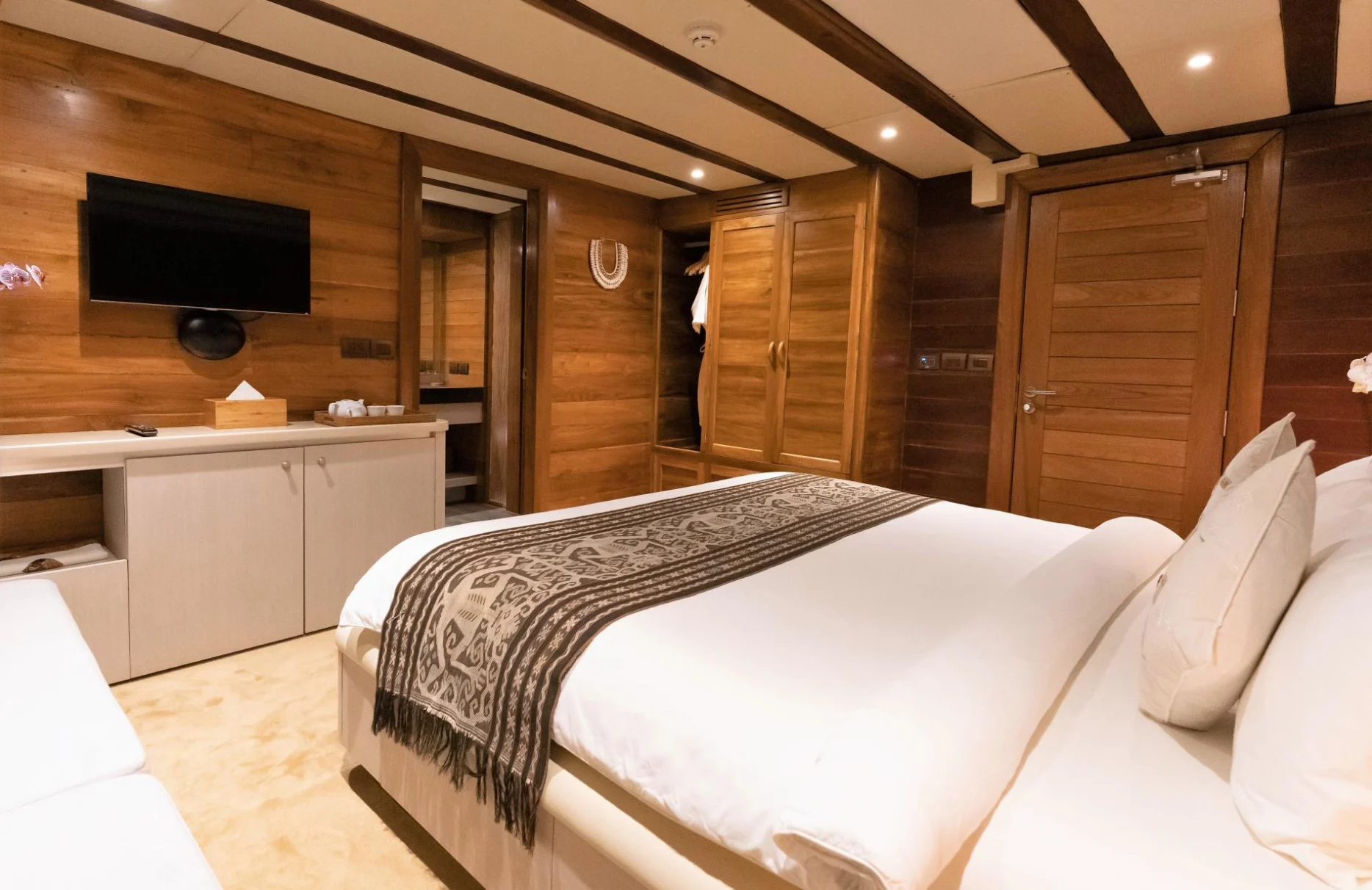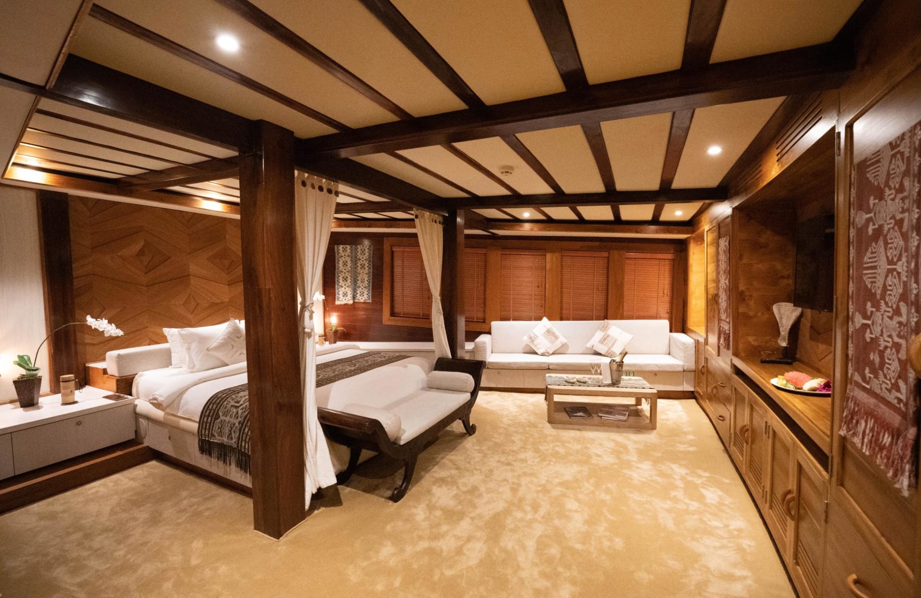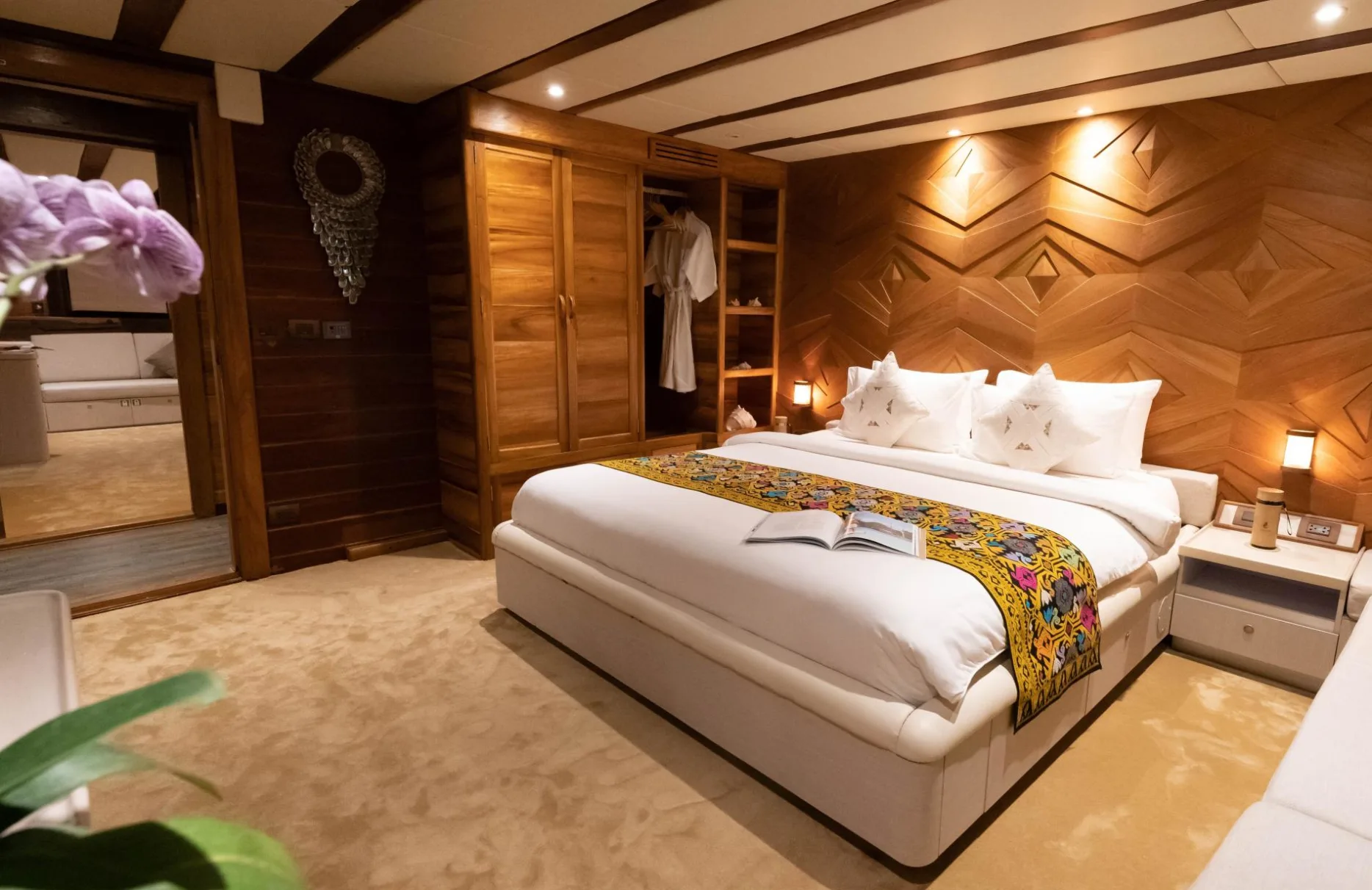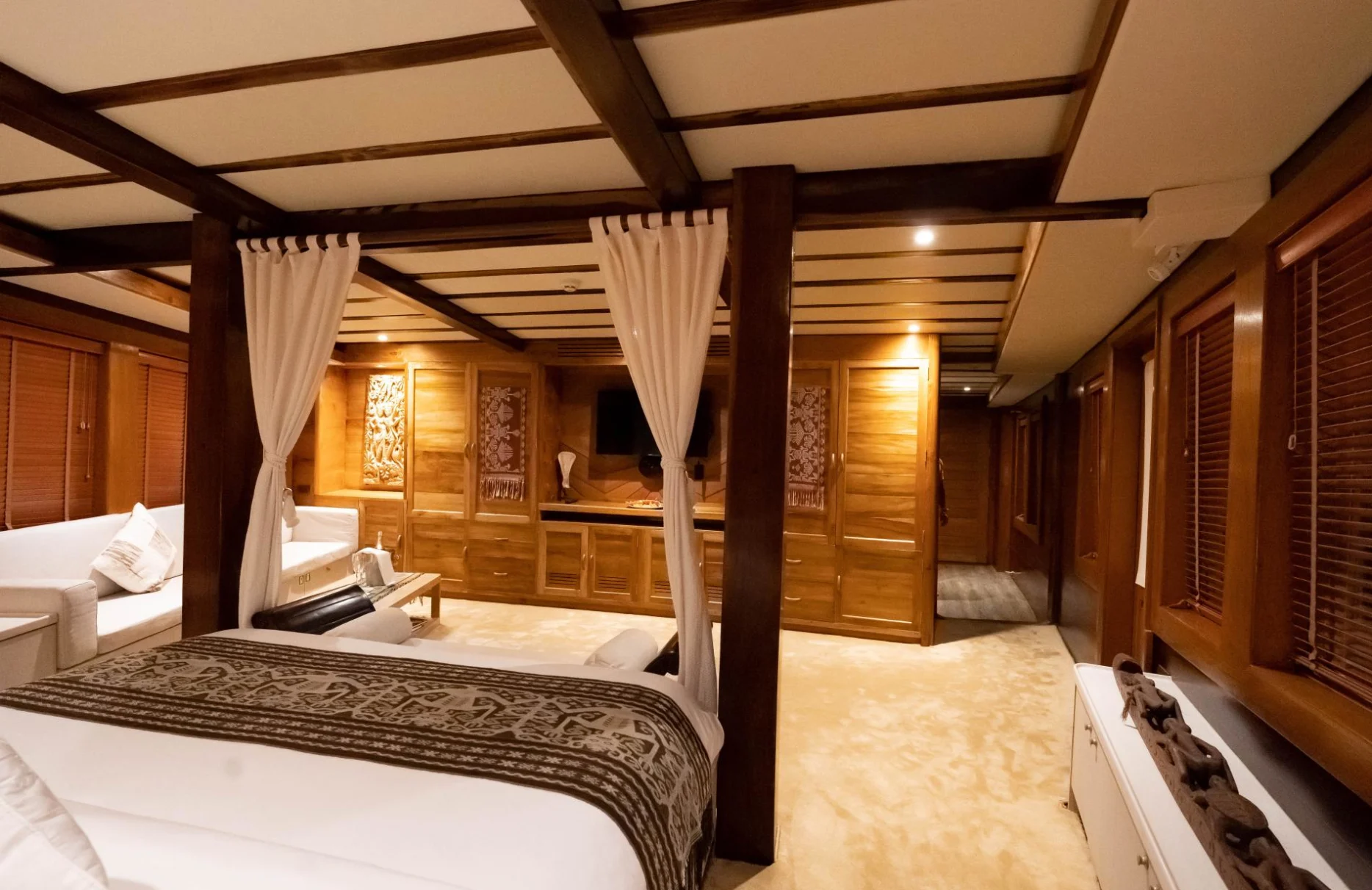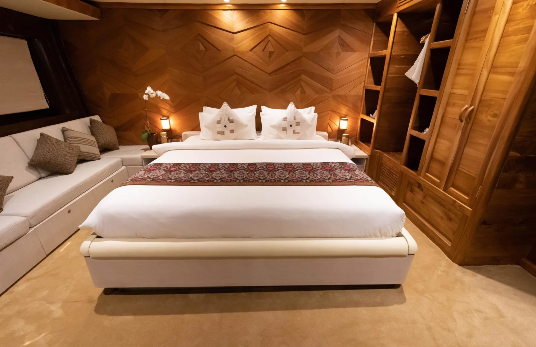 Accommodating up to fourteen guests, Lamima offers seven beautifully appointed cabins that serve as your personal retreat. Each room is thoughtfully designed with Oriental-style furnishings, creating a harmonious blend with the yacht’s exotic destinations. The master suite, with its private entrance to the exterior deck, stands out for its luxurious amenities and unique artworks. As dawn breaks, wake up to the gentle sound of the sea and the promise of another day filled with exploration and relaxation.
