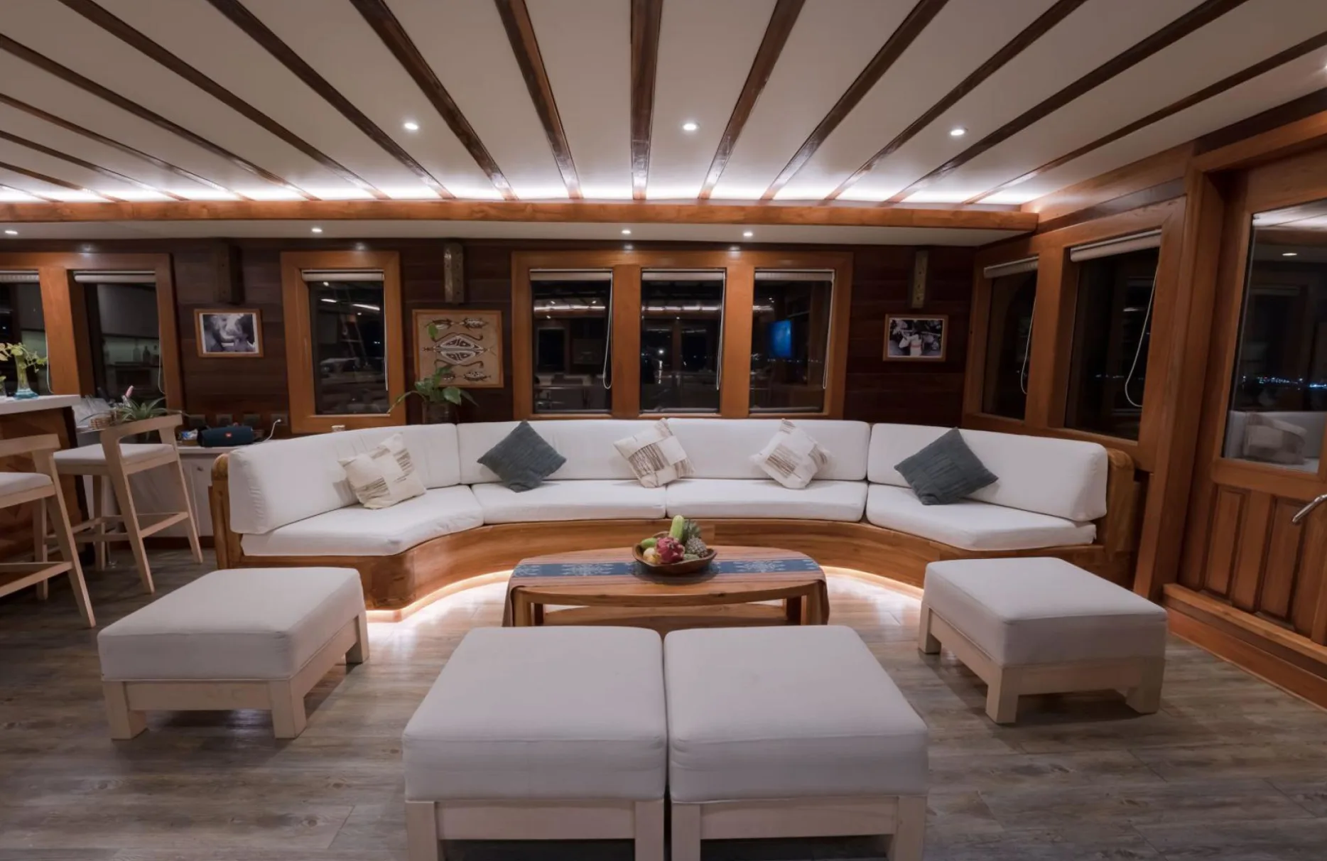 On Lamima, every corner is crafted to enhance your experience. The open-plan main salon, with its central bar and backlit panels, offers a perfect setting for evening gatherings or a quiet drink. State-of-the-art air conditioning ensures comfort in every room, while Wi-Fi keeps you connected to the world, should you so choose. Whether relaxing in one of the cozy seating areas or enjoying a film on the integrated television, life aboard Lamima feels both indulgent and effortless.