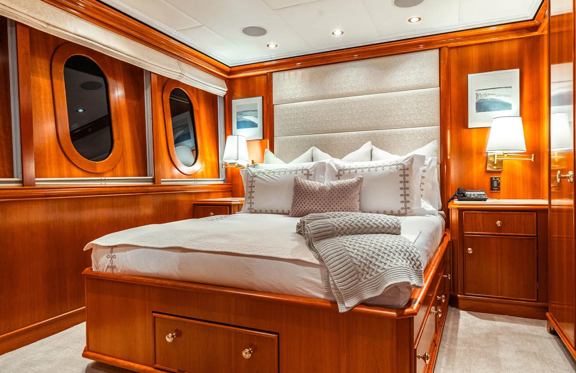 Leverage accommodates up to 10 guests within its five beautifully appointed cabins, each a sanctuary of comfort and style. The master suite, with its full-beam design, offers a private study and a sense of grandeur, setting the stage for restful nights and rejuvenating mornings. Three additional double cabins and a flexible twin-to-double cabin ensure that each guest experiences the epitome of relaxation. As the gentle sway of the yacht lulls you to sleep, you awaken to the promise of another day filled with discovery and delight.