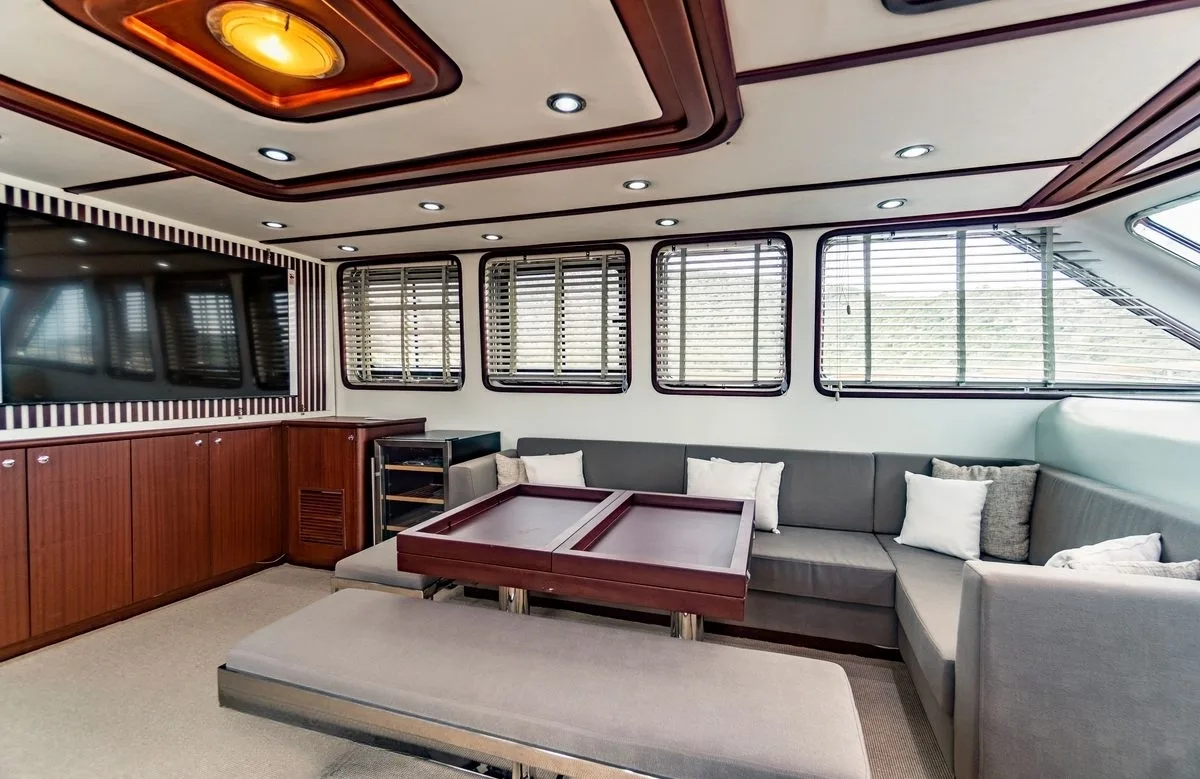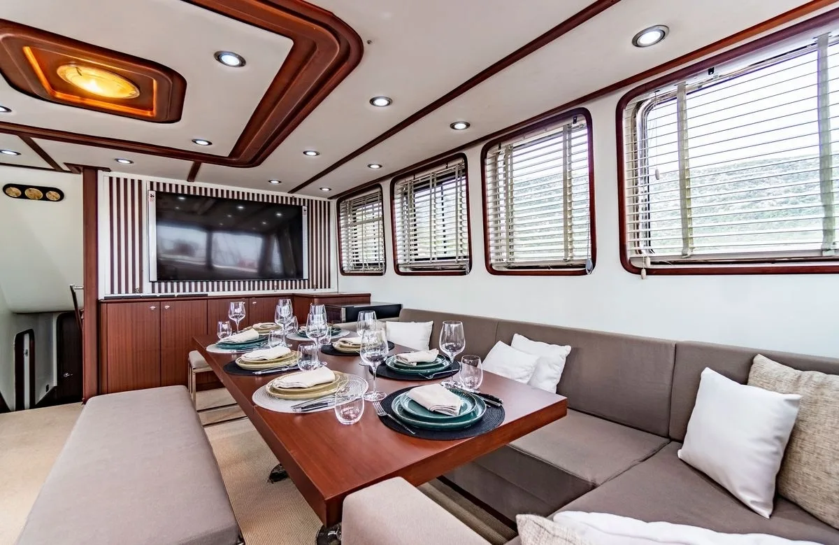 Life aboard Luja is one of serene indulgence, where each detail is crafted for your utmost comfort and delight. Feel the gentle breeze on the sun-drenched deck as you recline on plush sunpads, or retreat to the cool comfort of the air-conditioned interior spaces. Stay connected with the world, if you choose, through the yacht’s integrated Wi-Fi, or disconnect entirely to immerse yourself in the rhythmic lull of the ocean. The swimming platform offers the perfect gateway for a refreshing dip in azure waters, ensuring that leisure is always within arm’s reach.