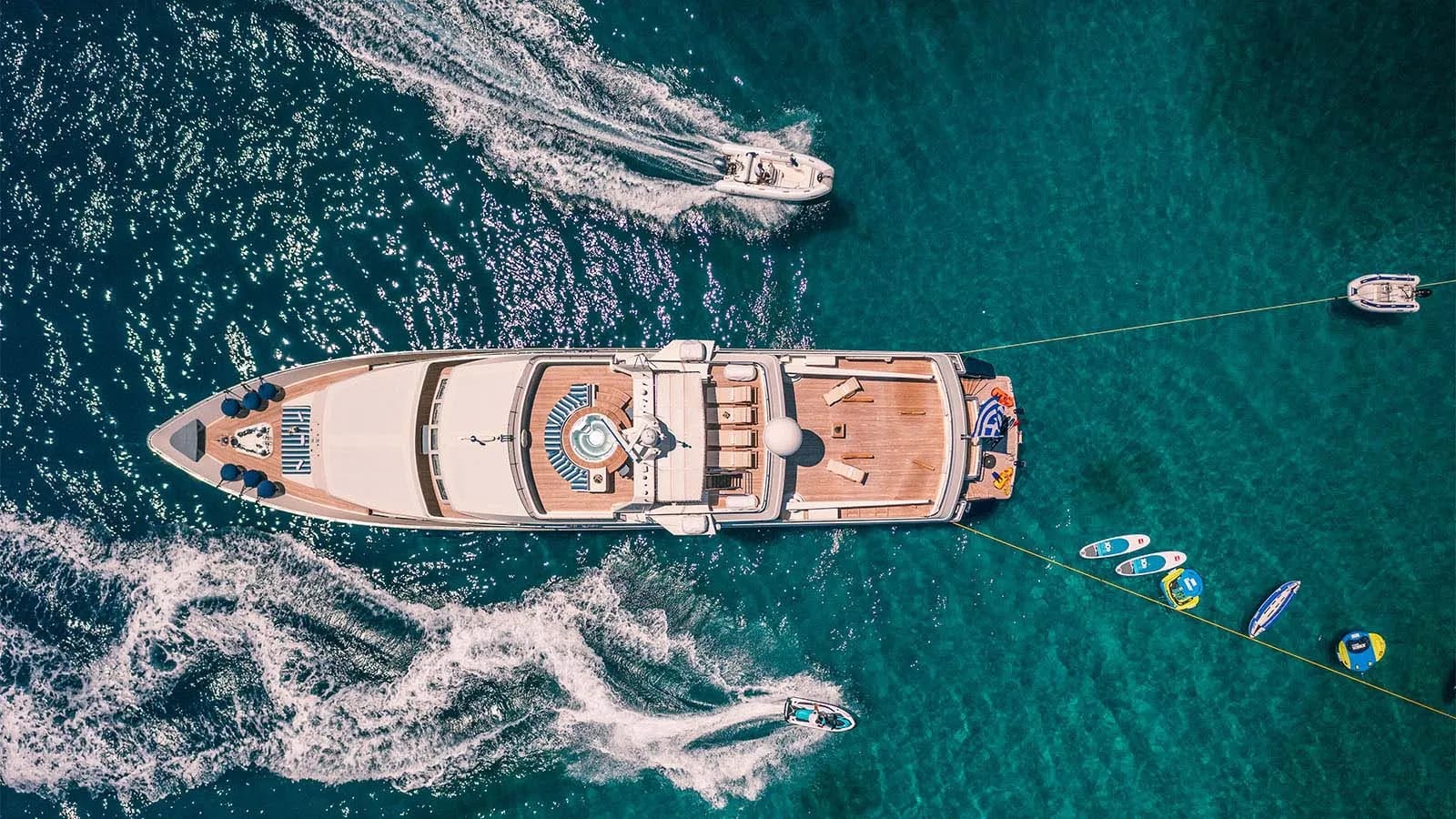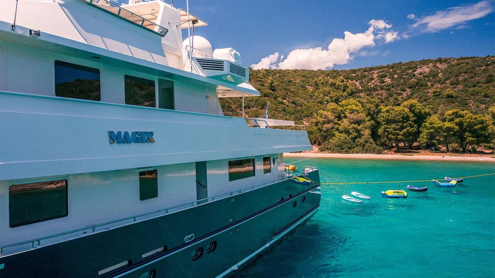 Aboard Magix, each day unfolds with possibility. Picture yourself spending sun-soaked afternoons lounging in the deck jacuzzi, where panoramic vistas stretch as far as the eye can see. As evening descends, the yacht transforms into a haven of tranquility, offering intimate spaces for gathering with family or friends, or simply enjoying a reflective moment under the stars. With a dedicated crew of seven attending to every detail, the experience aboard Magix is as seamless as it is enchanting, ensuring your journey is not just a vacation, but an unforgettable escape.