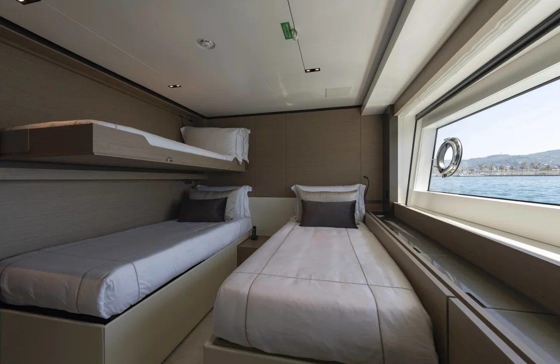 Retreat to the serene sanctuaries of Maria Theresa’s five exquisite cabins, where restful slumber awaits. Accommodating up to eleven guests, the yacht features a sumptuous main deck master suite, accompanied by three double cabins and a twin cabin, each offering a haven of tranquility. Awaken to the gentle lull of the sea and the promise of a new day, where each cabin is thoughtfully designed with neutral tones and contemporary furnishings, creating an ambiance of understated elegance and comfort.