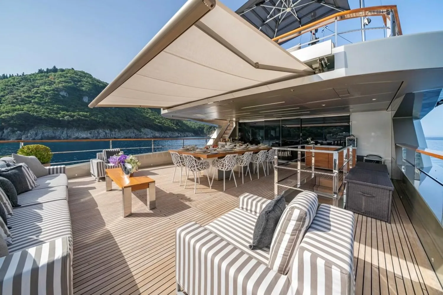 Life aboard Maverick is a symphony of comfort and sophistication, with every detail curated for your delight. Imagine mornings spent lounging in the sun on expansive sunpads, or evenings beneath a canopy of stars in the outdoor cinema. The jacuzzi offers a soothing retreat, while the beach club provides a perfect space for leisurely afternoons. With modern air conditioning ensuring your comfort, Maverick is a sanctuary where days drift seamlessly between relaxation and adventure.