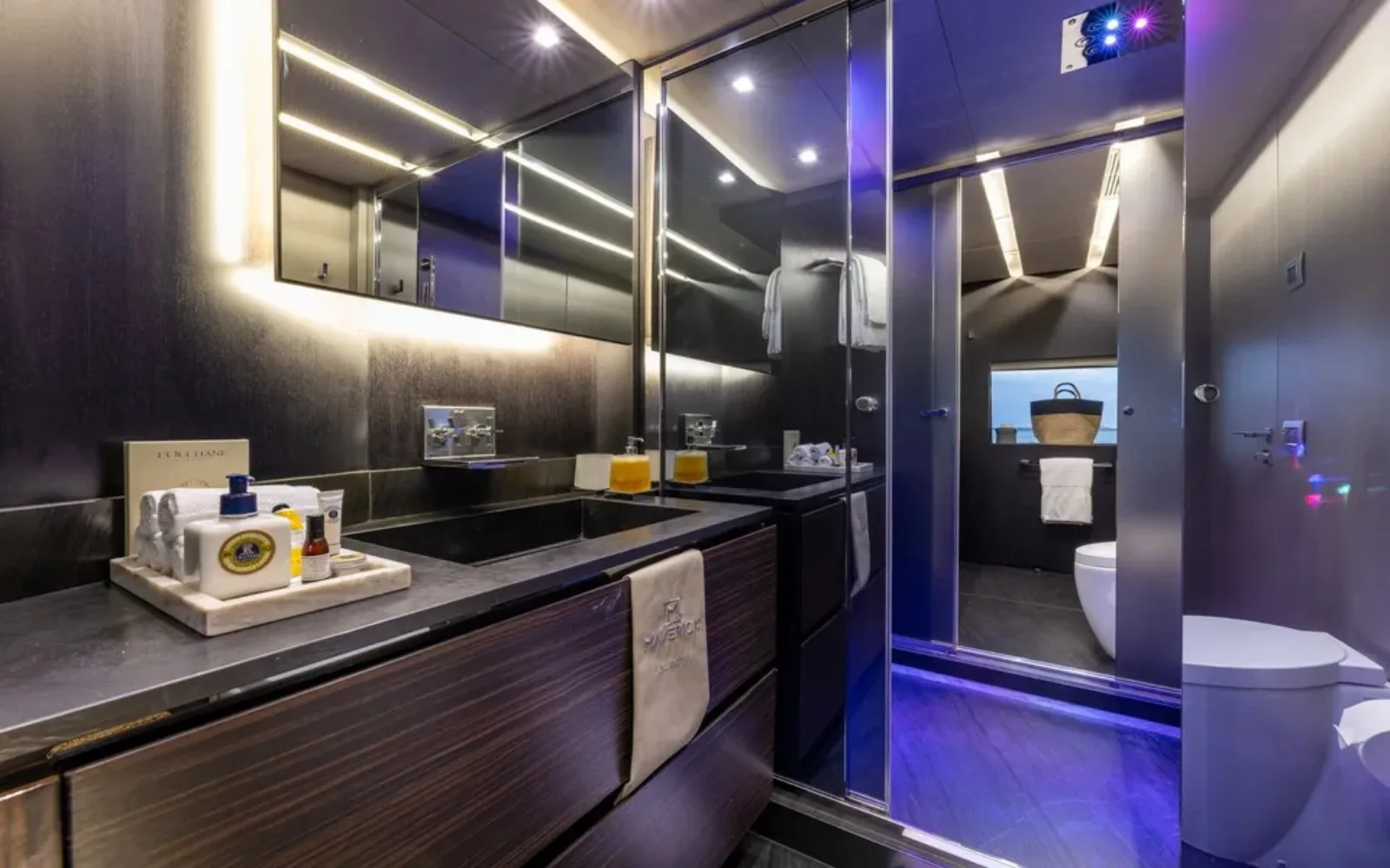 Maverick’s guest accommodations redefine marine comfort, with five elegantly designed cabins that envelop you in warmth and tranquility. Hosting up to 11 guests, the yacht features three VIP cabins, a twin cabin, and a single cabin, offering a restful haven after a day of exploration. Wake to the gentle sway of the sea in plush queen or single beds, and let the serene ambiance of your surroundings envelop you in peace and rejuvenation.