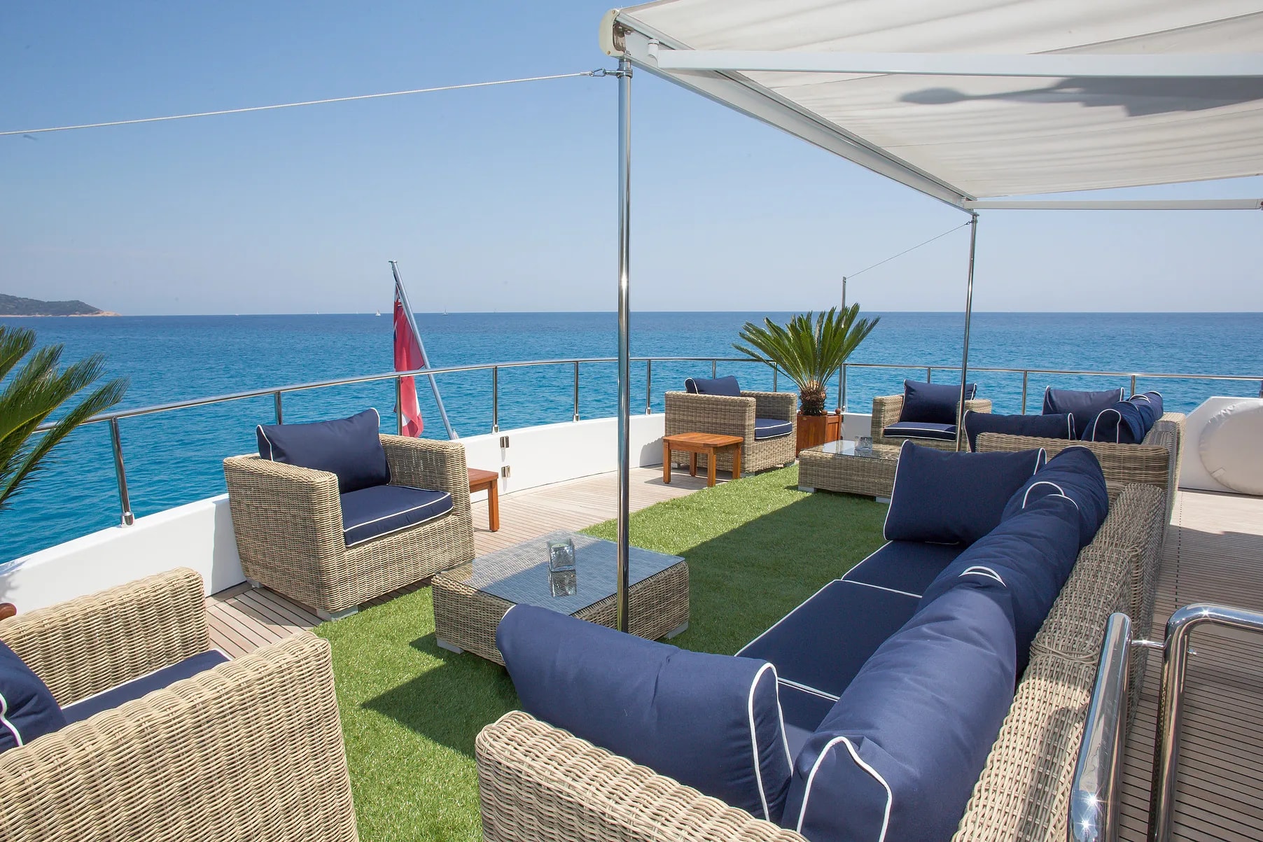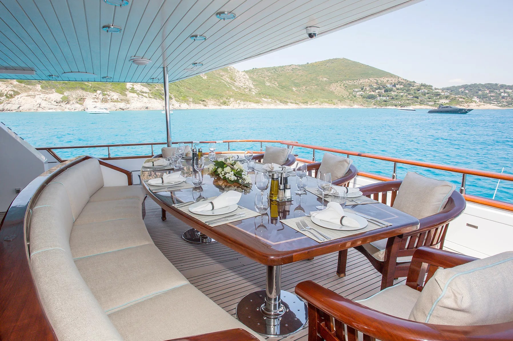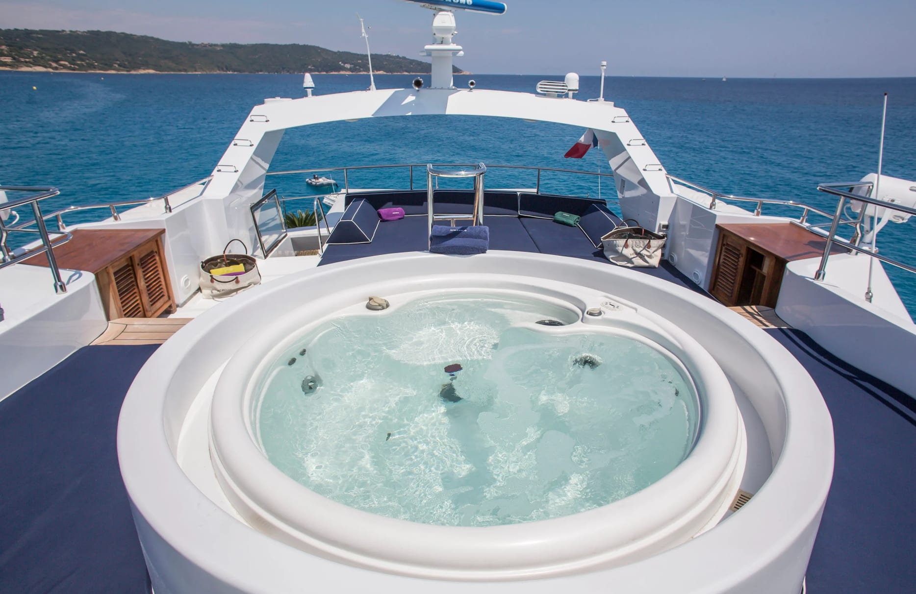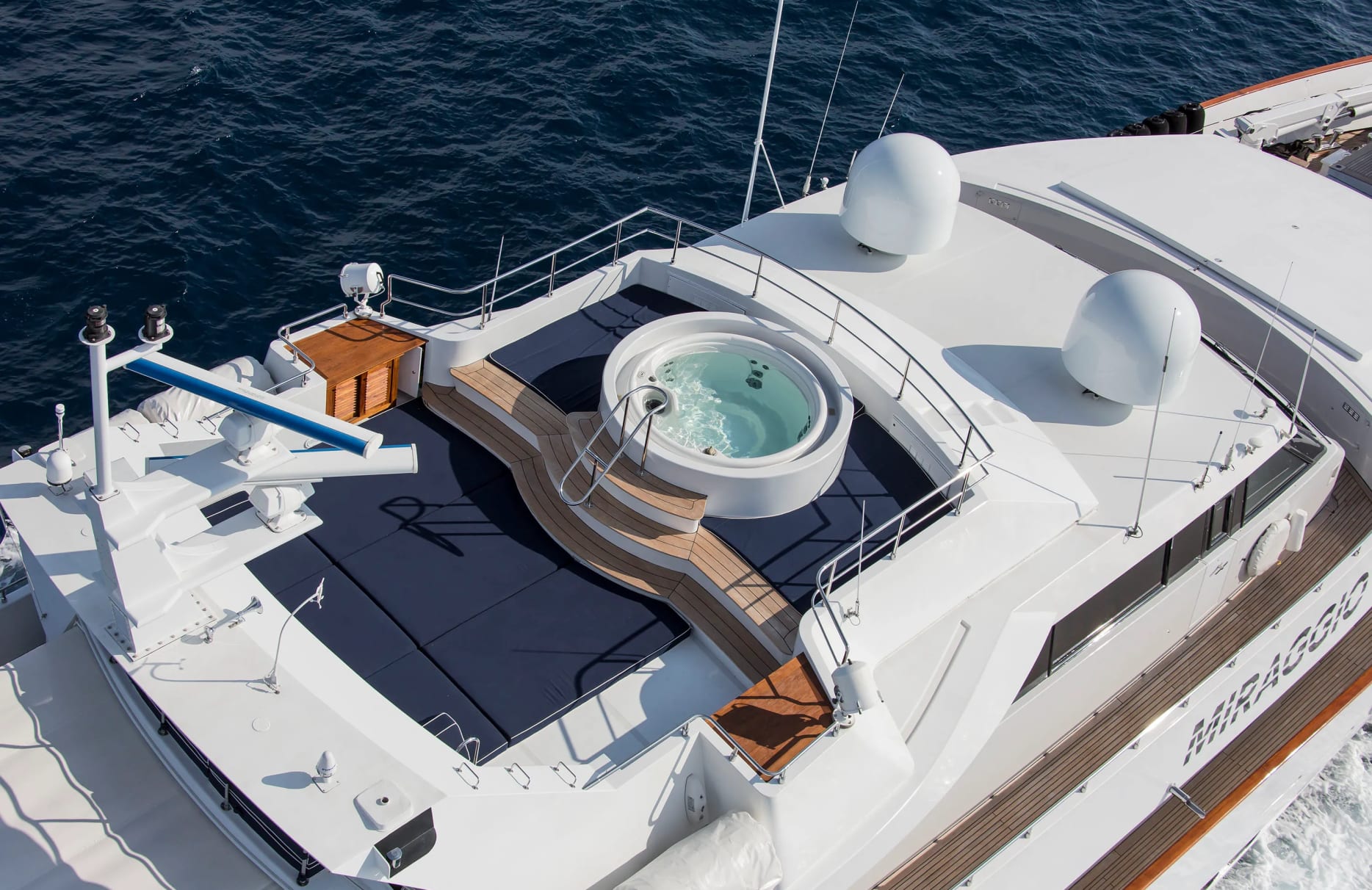 Onboard Miraggio, every moment is designed for indulgence and relaxation. The refreshing embrace of the Jacuzzi beckons after a day of exploration, while the air-conditioned interiors ensure comfort no matter the weather. As the sun sets, gather on the expansive deck for an evening under the stars, perhaps with a movie playing through the yacht’s entertainment system, all while seamless Wi-Fi keeps you connected. Whether socializing in elegant common areas or enjoying a quiet corner with a book, Miraggio caters to every mood and desire.