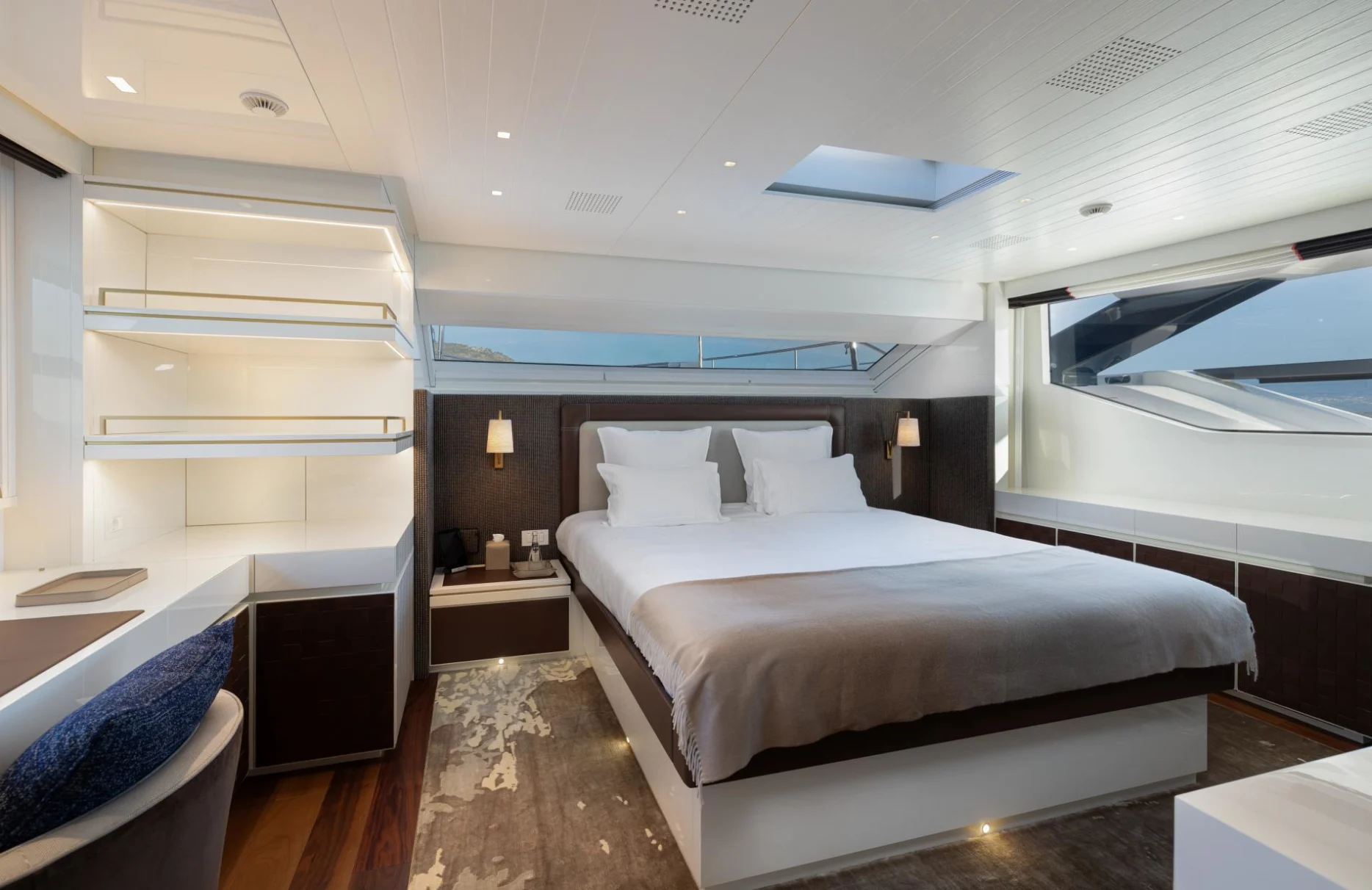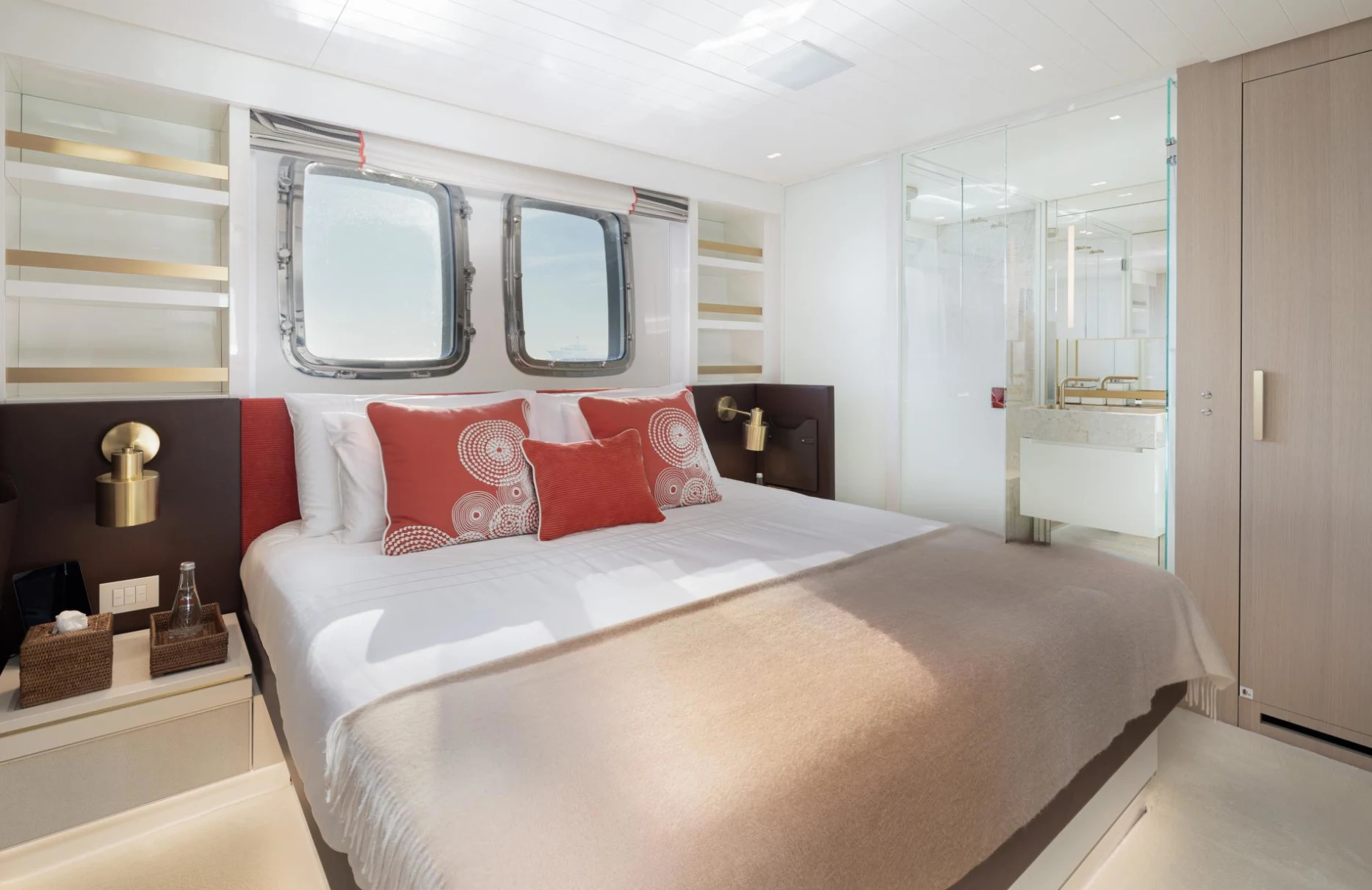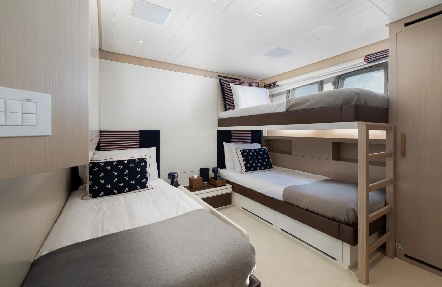 Accommodating up to ten guests, Monte-Cristo provides a sanctuary of privacy and comfort with its five elegantly appointed cabins. The full-beam master suite, complete with a spacious dressing room, offers a serene retreat. Two VIP cabins, along with a double and a single cabin, ensure every guest enjoys a restful night’s sleep, waking up refreshed to the gentle sway of the sea. Each room is a testament to sophisticated design and meticulous attention to detail, inviting you to unwind in style.