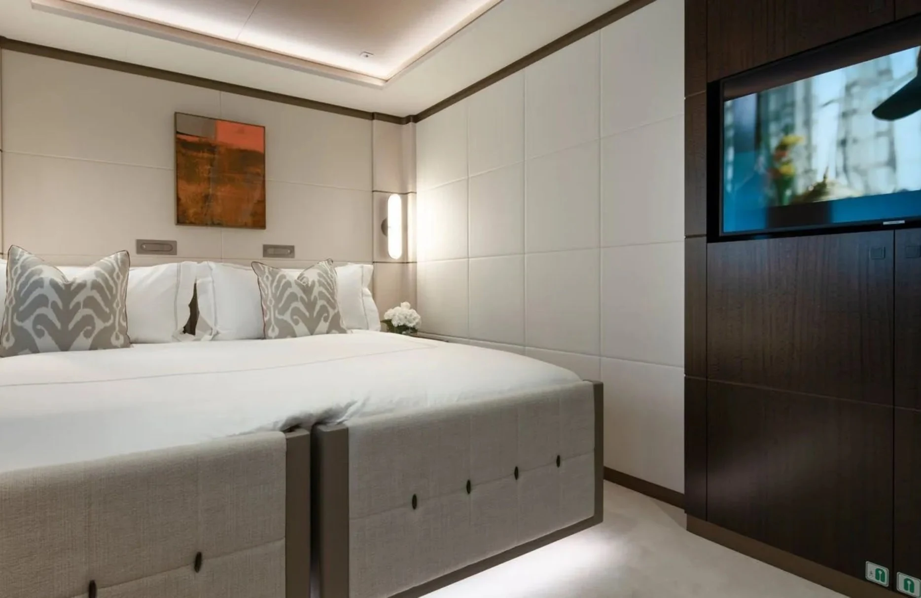 Moskito’s accommodations are a testament to refined comfort, offering a sanctuary for up to 12 guests across six beautifully appointed cabins. The master suite, positioned on the main deck, is a retreat of privacy and indulgence, featuring a his-and-hers bathroom arrangement. Each morning, guests awaken to the gentle motion of the sea, framed by the elegance of the yacht’s sophisticated interiors. The layout, with its VIP, double, and twin cabins, caters to both families and groups, ensuring that every guest experiences the ultimate in comfort and serenity.