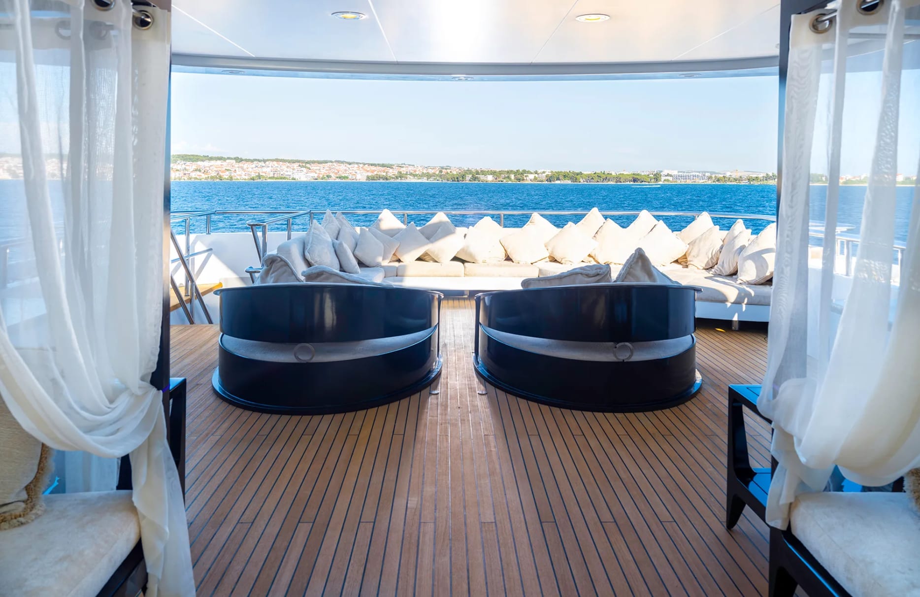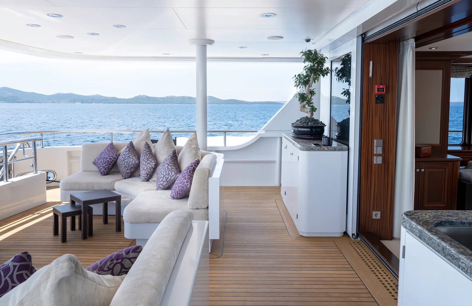 Life aboard My Little Violet is a symphony of comfort and style. Begin your morning with a refreshing dip in the deck jacuzzi, surrounded by panoramic views of the sea. Inside, the climate-controlled interiors offer a seamless escape from the midday sun, while high-speed Wi-Fi keeps you connected to the world at your leisure. As evening falls, gather with friends and family in the elegant salon, where conversation flows as effortlessly as the fine wines served. The yacht’s advanced stabilization system ensures that every moment, whether anchored or underway, is one of pure tranquility.