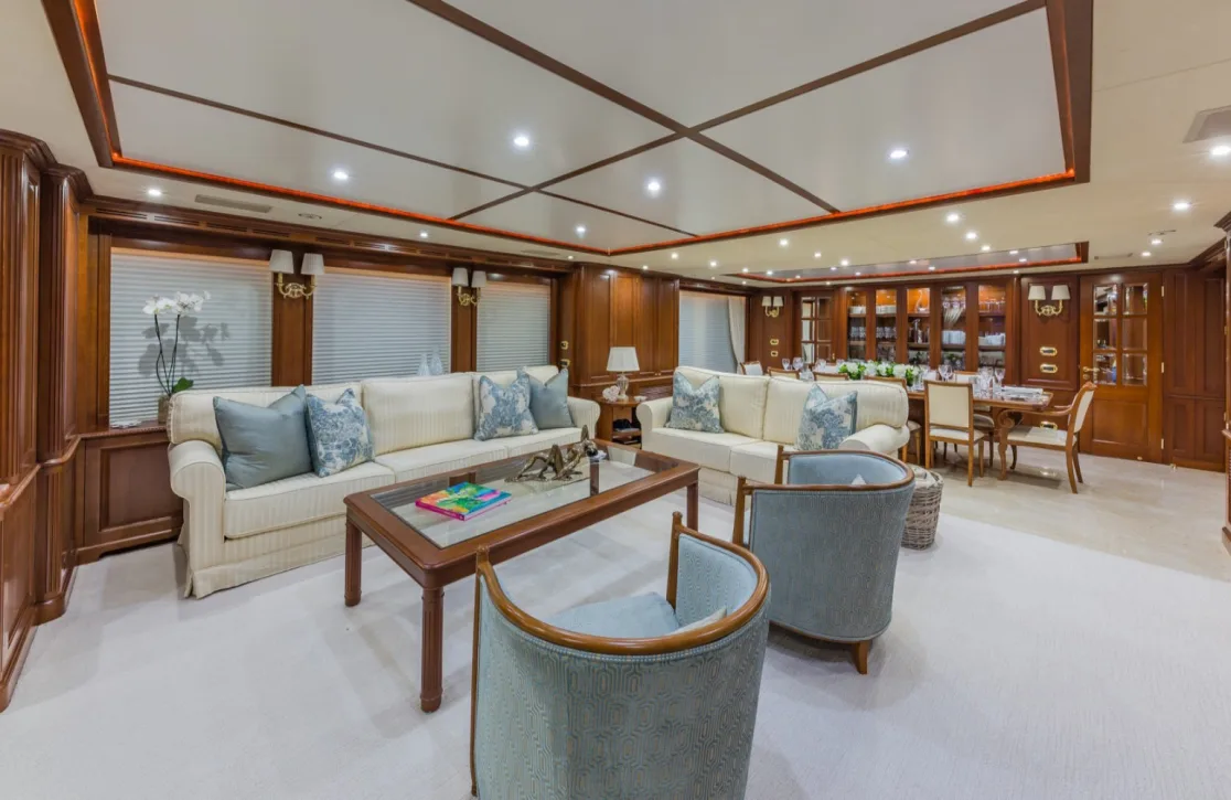 Retreat to the serene quarters of Namaste, where comfort meets elegance. The yacht accommodates up to 10 guests in five exquisitely appointed cabins, each a haven of relaxation. The master suite, located on the main deck, is a private sanctuary complete with a study and a luxurious his-and-her bathroom. Two additional double cabins and two twin cabins offer flexible sleeping arrangements, ensuring each guest finds their perfect retreat. Waking up to the gentle sway of the sea and the promise of a new adventure is a luxury in itself, making each morning aboard Namaste a delightful beginning.