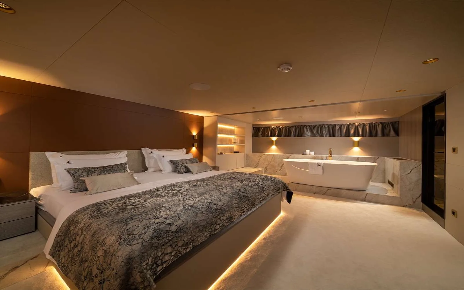 The ambiance aboard Nocturno is one of refined relaxation, where every detail is crafted to enhance your journey. Unwind in the deck jacuzzi, where panoramic views accompany moments of pure tranquility, or find solace on sun-drenched sunpads. Stay effortlessly connected with Wi-Fi throughout the yacht, while the refreshing comfort of air conditioning provides a welcome respite on balmy days. Every space invites you to savor the art of living well, whether you’re enjoying a quiet morning or an evening gathering under the stars.