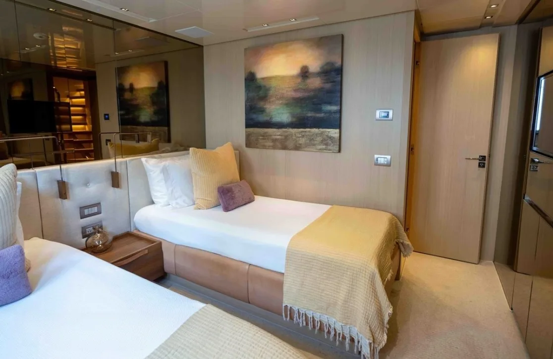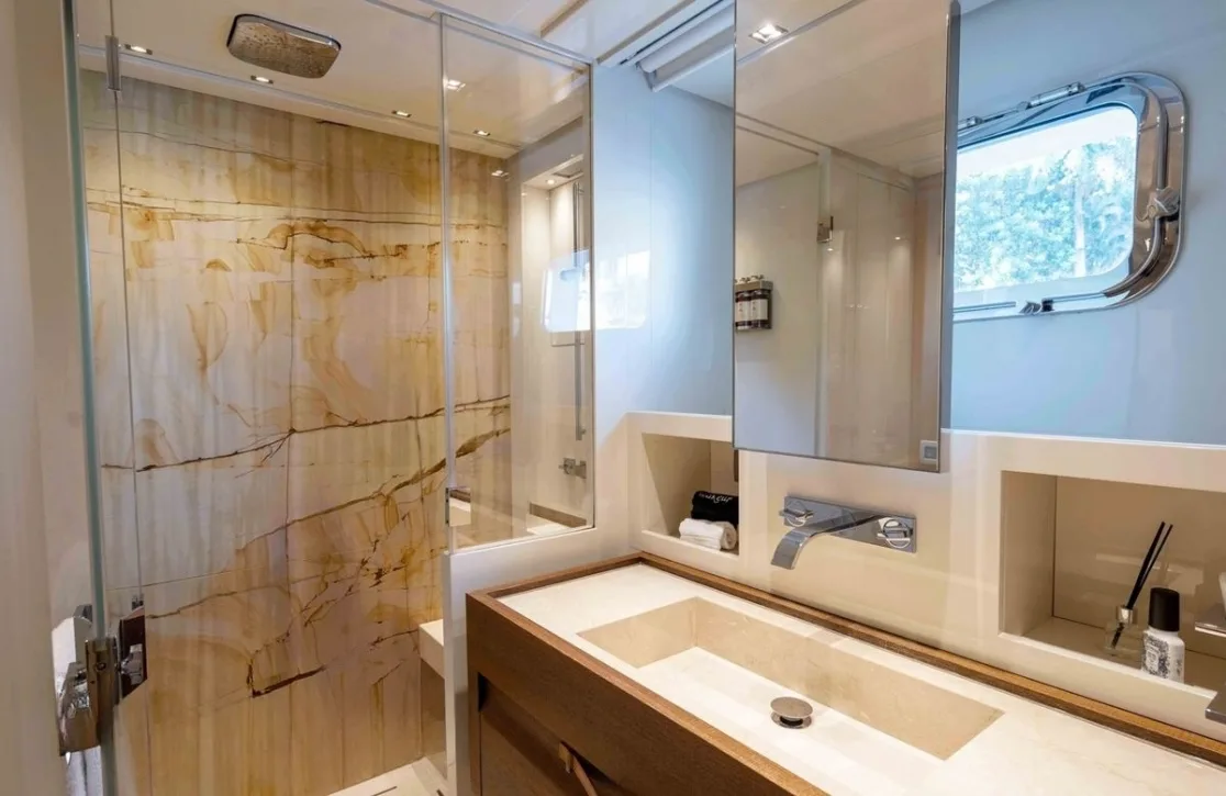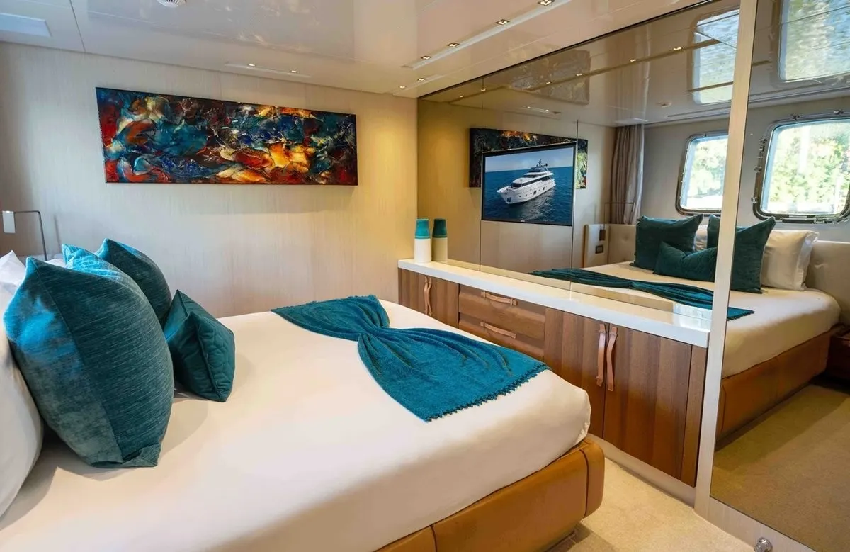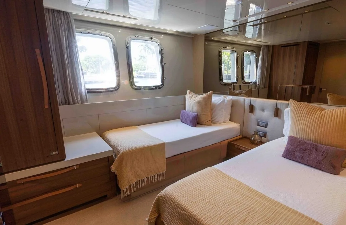Notorious accommodates up to ten guests across five impeccably designed cabins, each a sanctuary of tranquility and style. As you awaken to the gentle sway of the ocean, the master suite envelops you in its refined elegance, while the VIP and additional guest cabins offer equally plush retreats. The thoughtful layout ensures that every guest experiences the perfect balance of privacy and comfort, allowing for restful nights and leisurely mornings spent gazing out at endless horizons.