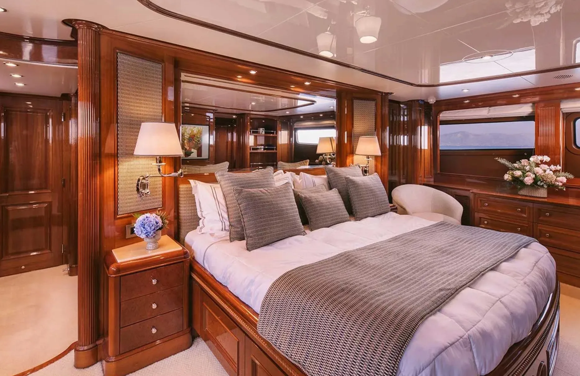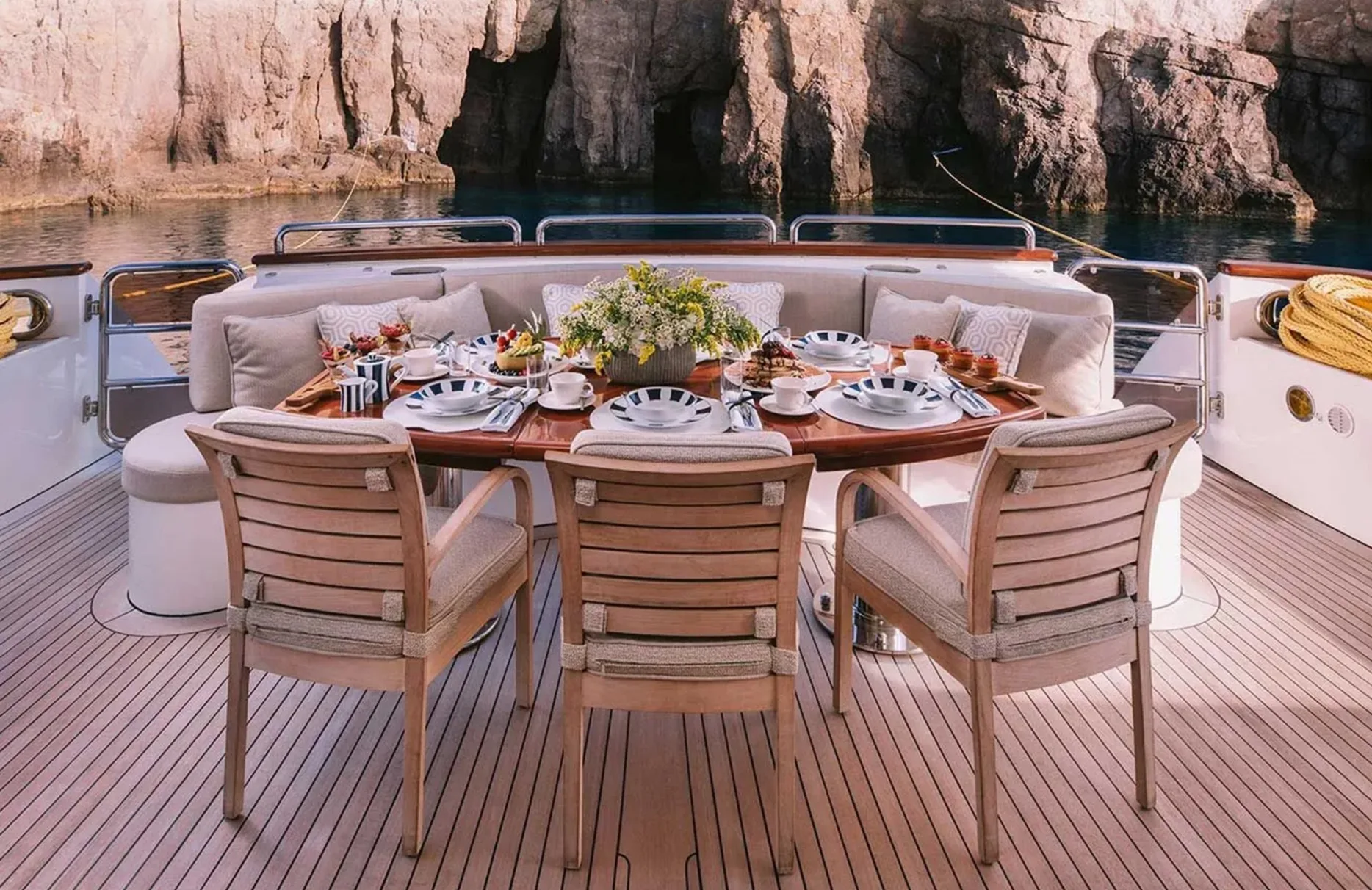 Accommodations on Oak are nothing short of sublime, with space for 11 guests across five elegantly appointed cabins. Wake up to the gentle sway of the ocean in the master suite, or one of the two double or two twin cabins, each designed to offer the utmost in privacy and comfort. The warm, inviting decor by Zuretti enhances the feeling of a personal sanctuary, making each morning aboard a renewal of spirit and each night a peaceful retreat.