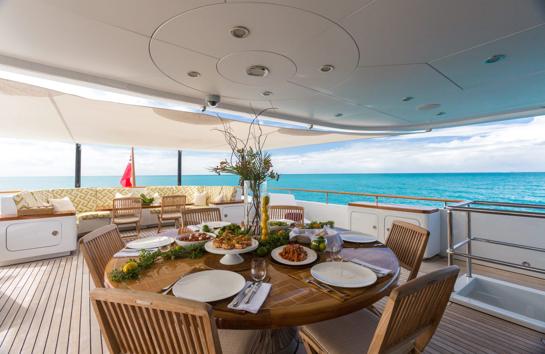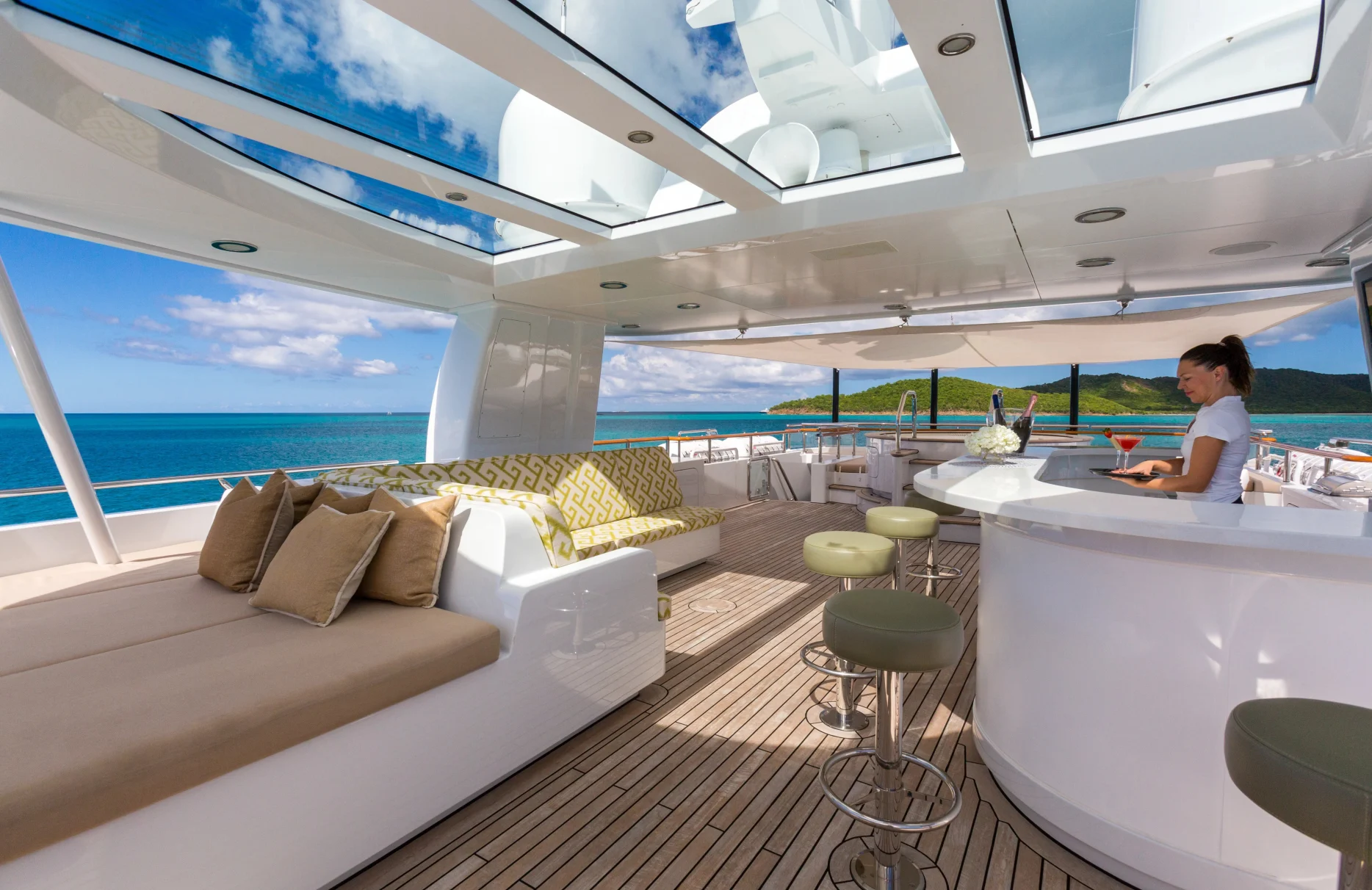 On Ocean’s Seven, each day unfolds with serene elegance and endless possibilities. Start your morning with a refreshing dip in the deck jacuzzi, then savor a gourmet breakfast alfresco on the sundeck, where panoramic views accompany each bite. Afternoon hours are best spent at the exterior bar, where crafted cocktails and engaging conversations flow freely. For those seeking rejuvenation, the gym equipment offers a private wellness sanctuary, while the air-conditioned interiors provide a cool retreat from the midday sun. As night falls, gather around the BBQ for an intimate dining experience, as ocean breezes whisper tales of the day’s adventures.