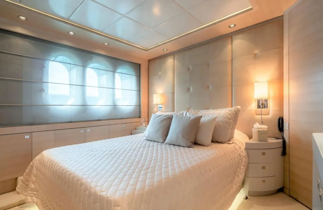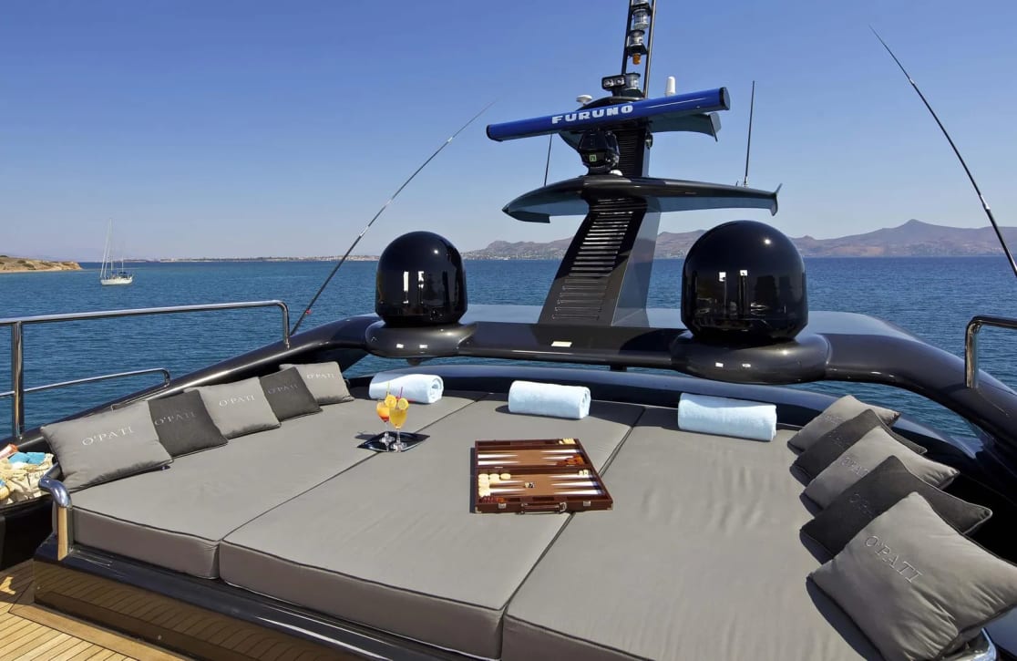 Aboard O’Pati, every moment is crafted for your delight. The yacht’s interiors, designed by Studio Vafiadis, offer a serene haven with Wi-Fi connectivity and air-conditioned comfort that ensures you stay connected while disconnecting from the everyday. Entertainment flows effortlessly with iPod docking stations and game consoles, setting the stage for lively evenings and intimate gatherings alike. From the seamless blend of indoor and outdoor spaces to the attentive service of an eight-member crew, every detail aboard O’Pati is designed to enhance your voyage.