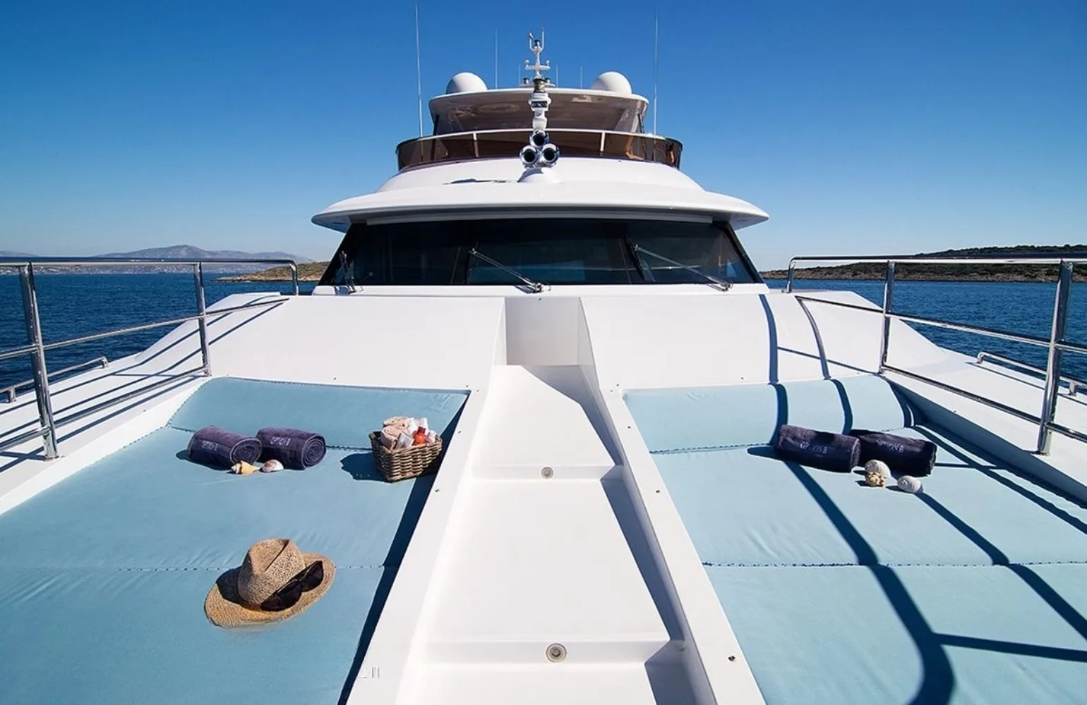 Aboard ‘Option B,’ every moment is crafted for your pleasure. Envision yourself unwinding in the deck jacuzzi, a refreshing drink in hand, as the sun dips below the horizon. The yacht’s interiors offer a serene retreat with soothing air conditioning, while the at-anchor stabilizers ensure your comfort remains undisturbed. Enjoy leisurely afternoons on the sun deck, or retreat to the gym for a revitalizing workout. Whether sharing stories at the exterior bar or lounging on sunpads, life aboard ‘Option B’ is as vibrant or as tranquil as you desire.