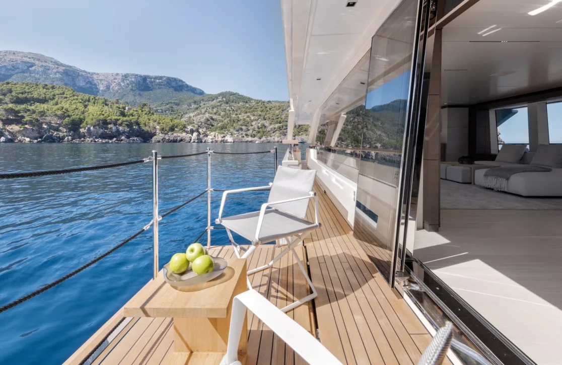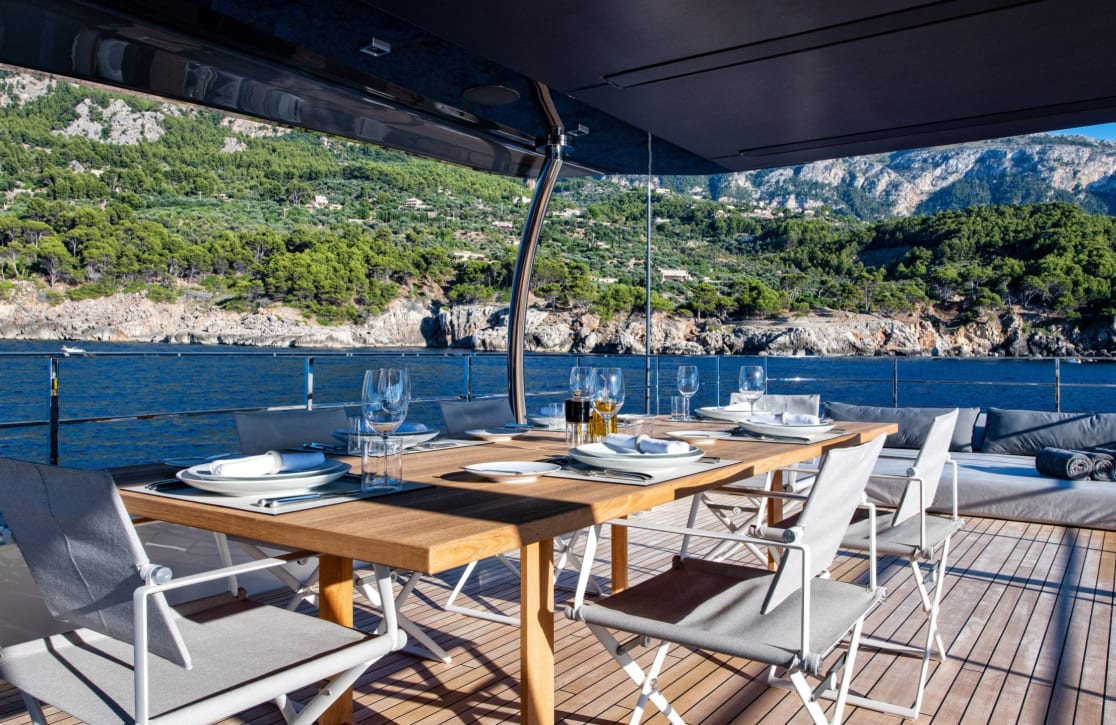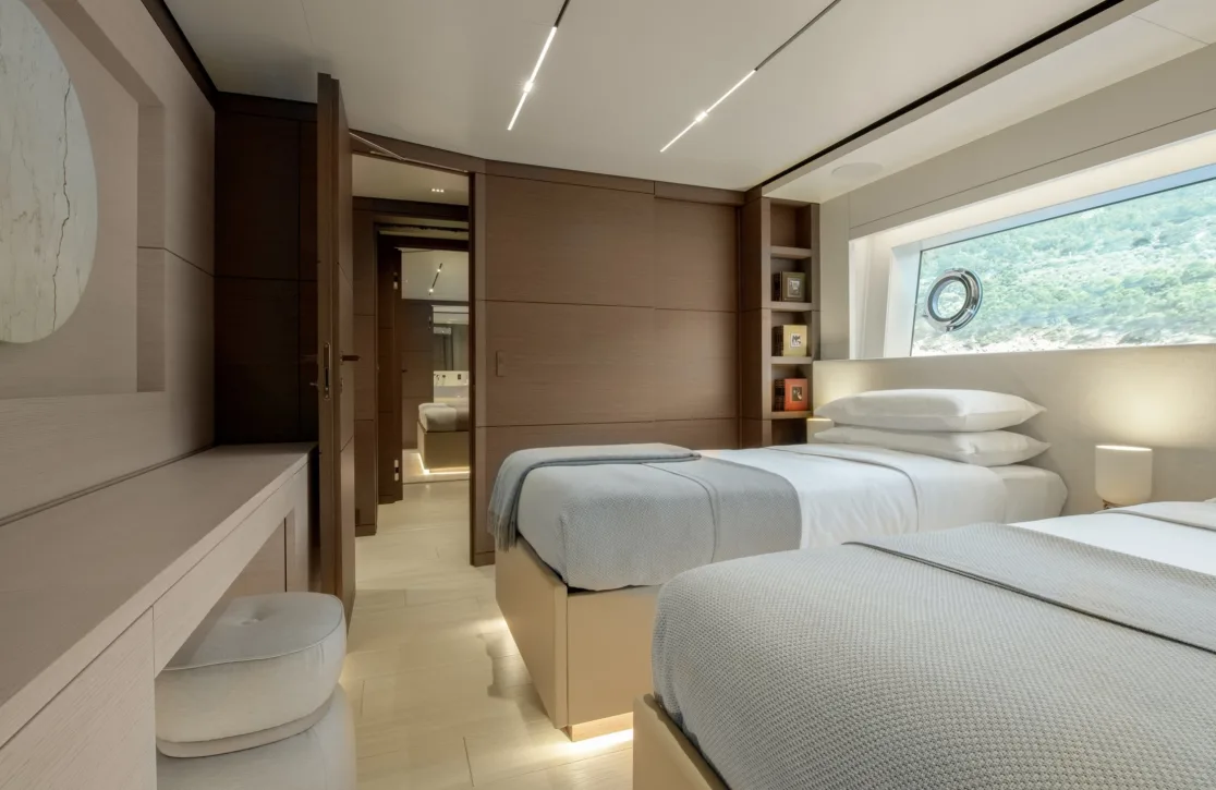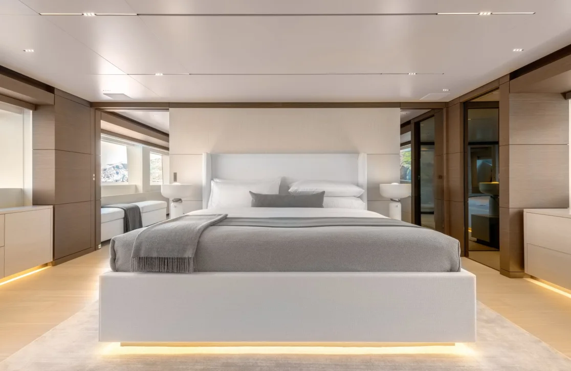 With accommodations for up to 11 guests across five exquisite rooms, Paloma ensures each guest enjoys a sanctuary of comfort and tranquility. The master suite, a full-beam oasis, offers an unparalleled retreat with its own luxurious bathroom facilities. As morning light filters through your cabin’s windows, awaken to the gentle sound of the sea, knowing that each room has been crafted to provide the utmost in privacy and relaxation. Experience the art of hospitality with a dedicated crew of eight attending to your needs.