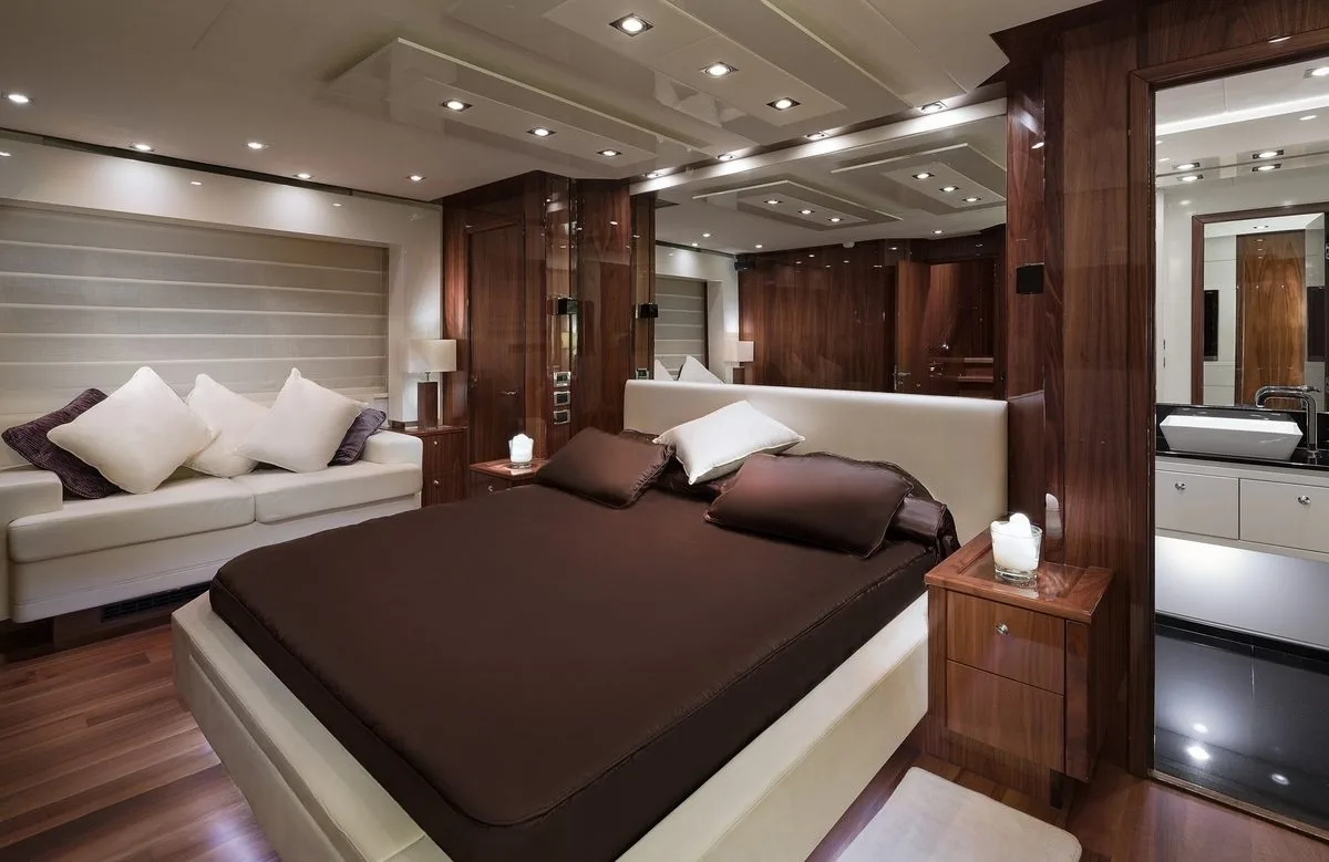 Palumba’s interiors offer an inviting haven with accommodations for up to eight guests. The full-beam master suite, complete with an extensive dressing room, is a sanctuary of tranquility. Each cabin, from the VIP to the double and twin, is thoughtfully designed to provide restful slumbers, ensuring you wake refreshed to the gentle sway of the sea. The understated elegance of the spaces invites relaxation, making mornings aboard Palumba a delightful prelude to the day’s adventures.