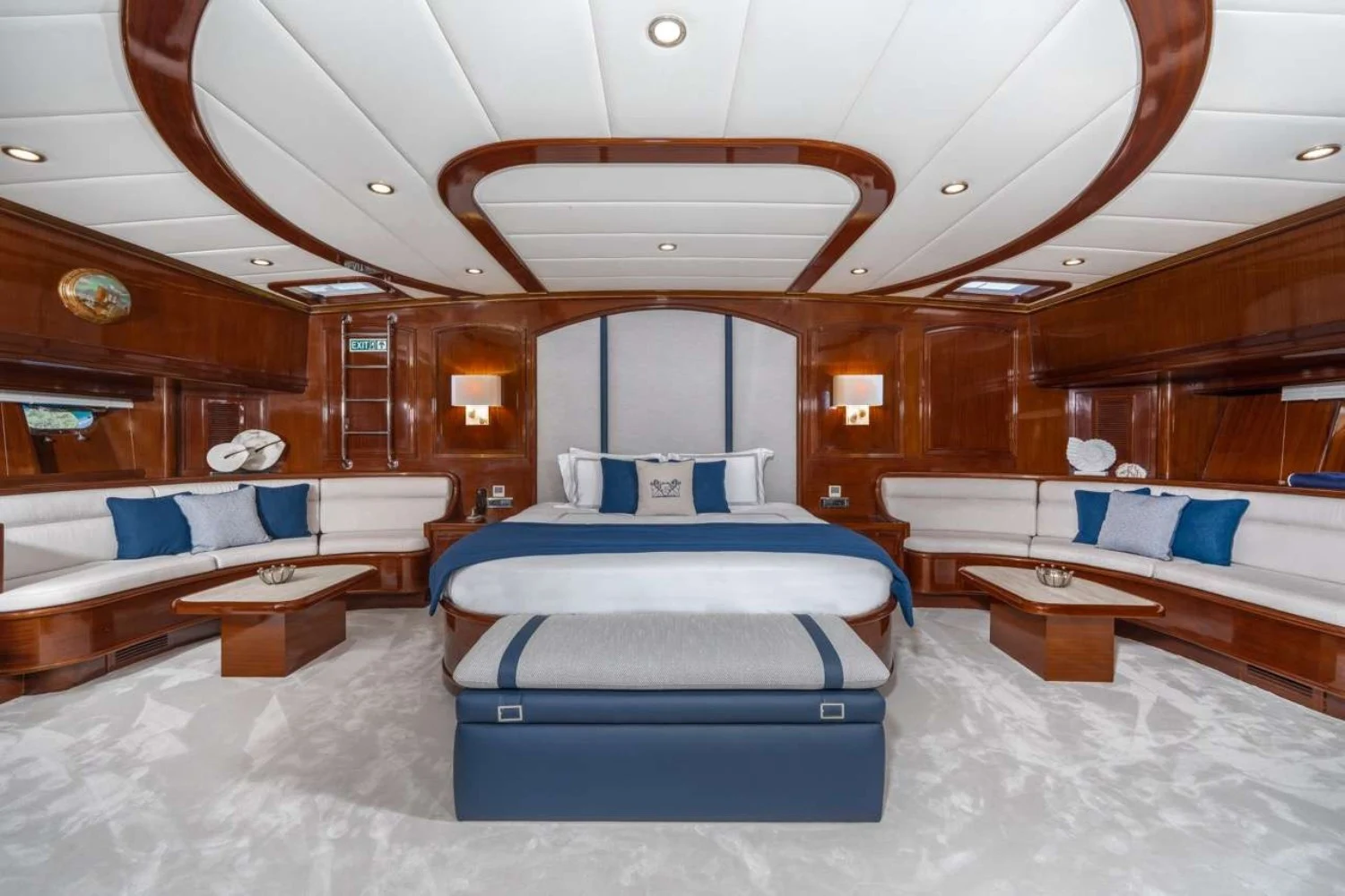 Guests aboard Performance Fee will find themselves enveloped in comfort and style, with accommodations for up to 12 guests in five beautifully appointed cabins. The master suite, along with three double cabins, provides a sanctuary of tranquility, ensuring restful nights and rejuvenating mornings. Each room, with its refined finishes and thoughtful design, offers a serene retreat where the gentle lull of the ocean sets the perfect backdrop for relaxation.
