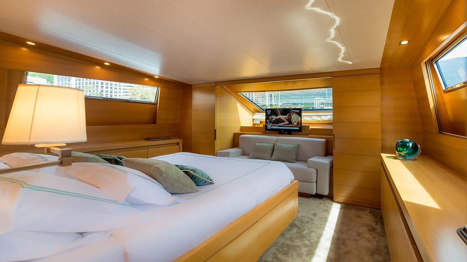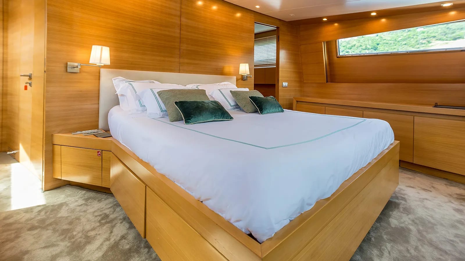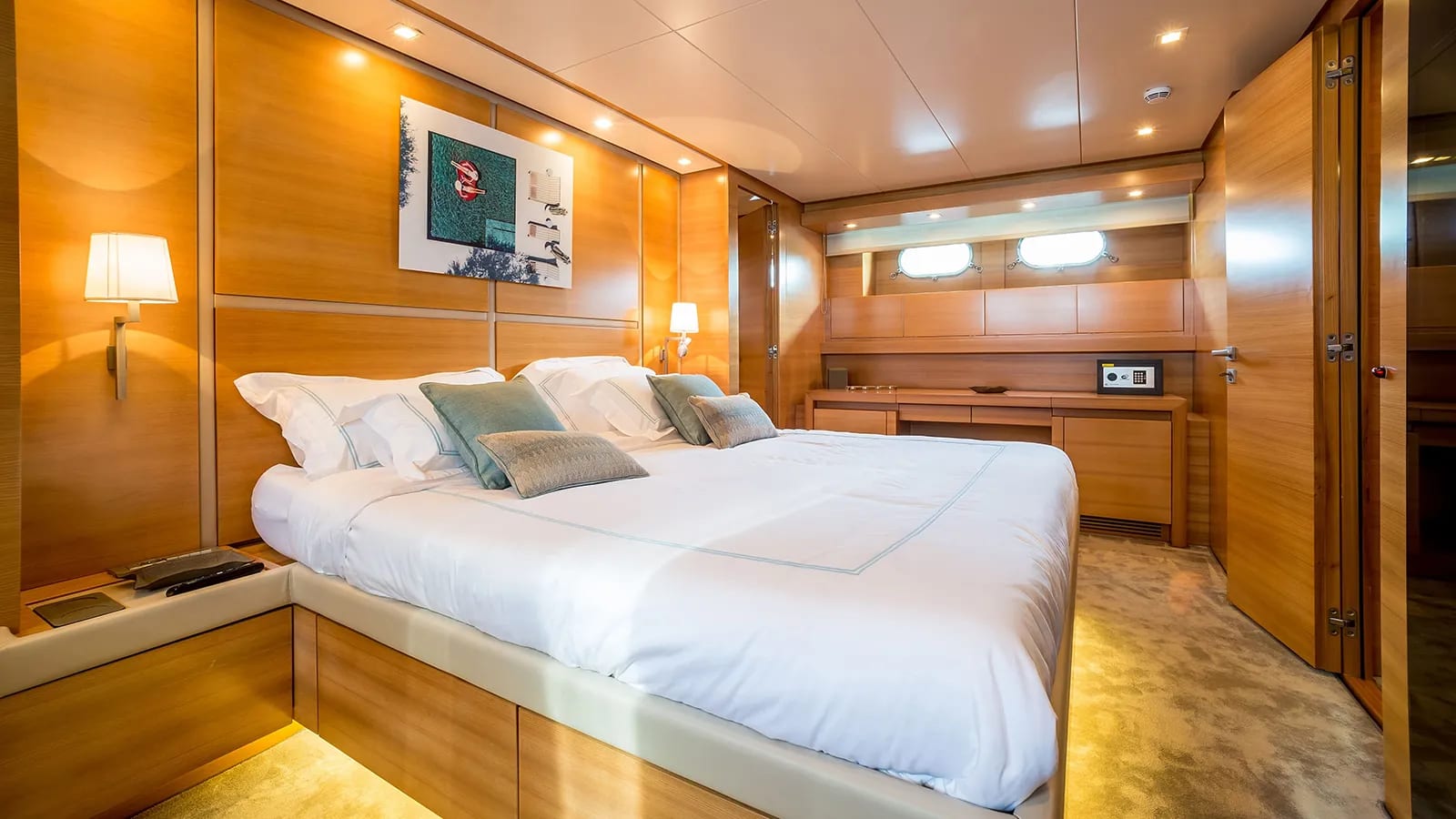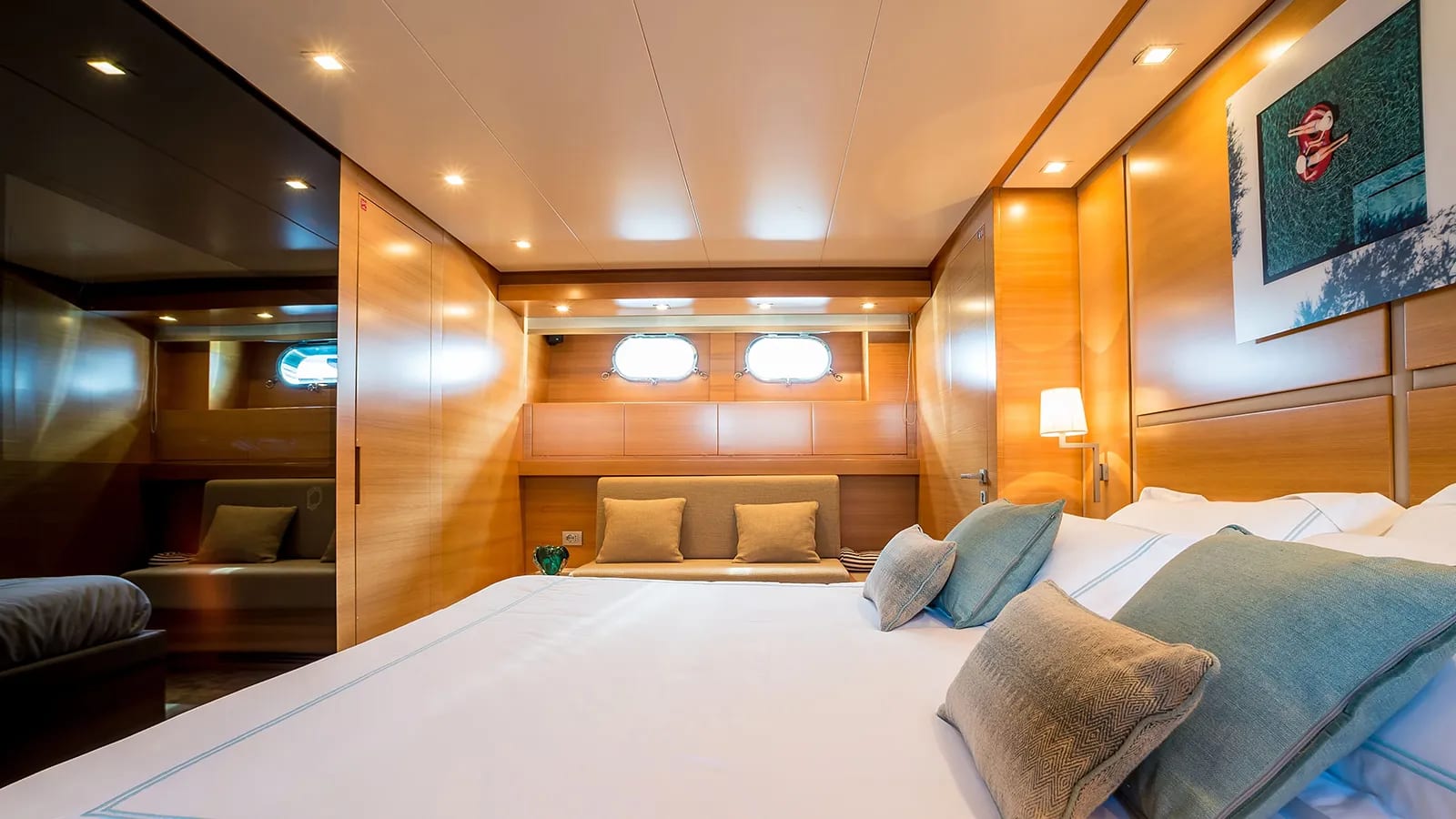 Pertula’s accommodations are a testament to refined comfort, hosting up to eight guests in four beautifully appointed cabins. Each morning, wake to the gentle sound of the sea in the sumptuous master suite, featuring a king-sized bed and panoramic views. The VIP, double, and twin cabins offer equally inviting sanctuaries, each meticulously designed to ensure a restful night’s sleep. With a dedicated crew of five attending to every detail, your stay aboard promises a seamless blend of privacy and attentive service.