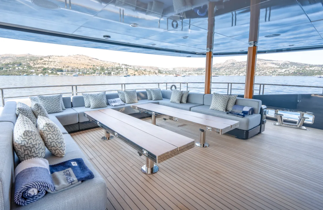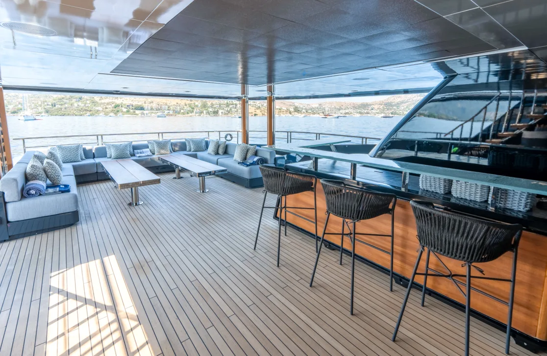 Onboard the Provocateur, every moment is an opportunity for indulgence. Picture yourself unwinding in the calming ambiance of the beach club, or perhaps finding your center in the fully-equipped gym. As the sun sets, the deck jacuzzi becomes an inviting haven under the glow of underwater lights, setting the scene for an unforgettable evening. With Wi-Fi and air conditioning ensuring comfort in every corner, the yacht’s sun deck and outdoor bar offer the perfect backdrop for socializing or simply soaking in the panoramic views.