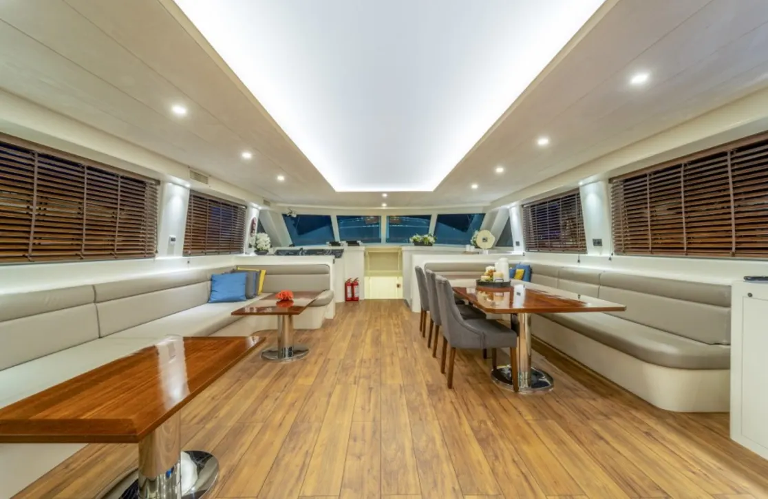 On board the Queen Of Makri, each day unfolds with a gentle rhythm, offering spaces designed for both relaxation and festivity. Envision yourself reclining on the foredeck seating, a perfect spot to enjoy a morning coffee as the world awakens around you. As the day warms, retreat to the sunpads where you can soak in the golden rays, cooled by a gentle sea breeze. Evenings bring the allure of alfresco dining under the stars, with seamless connectivity via state-of-the-art Wi-Fi ensuring you’re never far from those you hold dear. The air-conditioned interiors provide a cool sanctuary, enhancing the comfort and elegance of your journey.