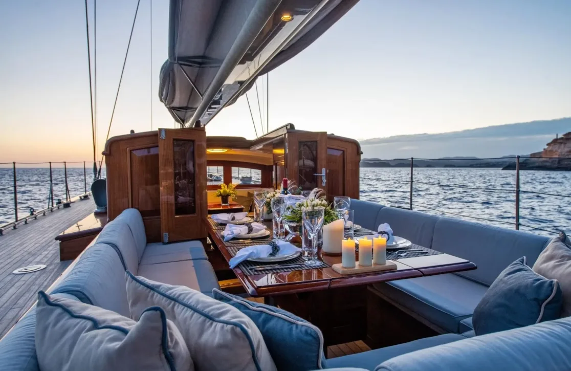 Life aboard Rainbow is a seamless blend of comfort and connection. With Wi-Fi throughout, staying in touch with the world is effortless, yet the tranquil sea setting encourages you to disconnect and unwind. The yacht’s air-conditioned interiors provide a refuge from the midday sun, ensuring comfort at all times. Whether you are lounging in the elegantly appointed salon with its panoramic views or enjoying a quiet evening on the deck, Rainbow offers spaces that invite relaxation and conviviality. Every corner of this vessel is designed to enhance your experience, offering both privacy and the opportunity to gather with loved ones.