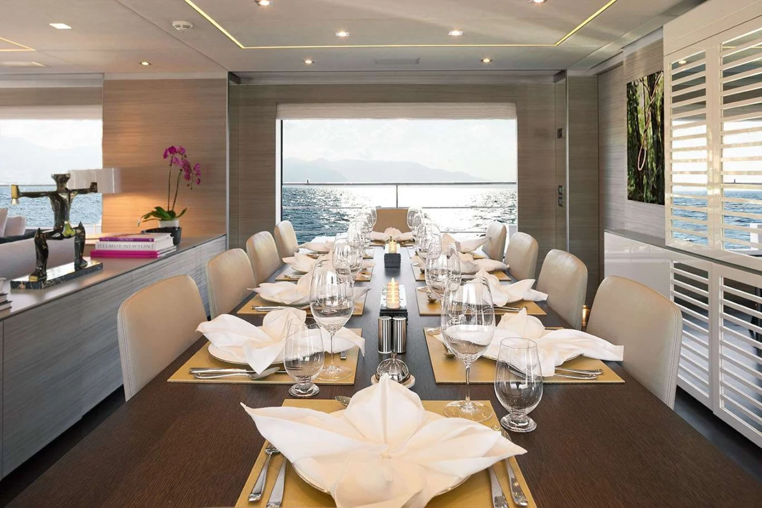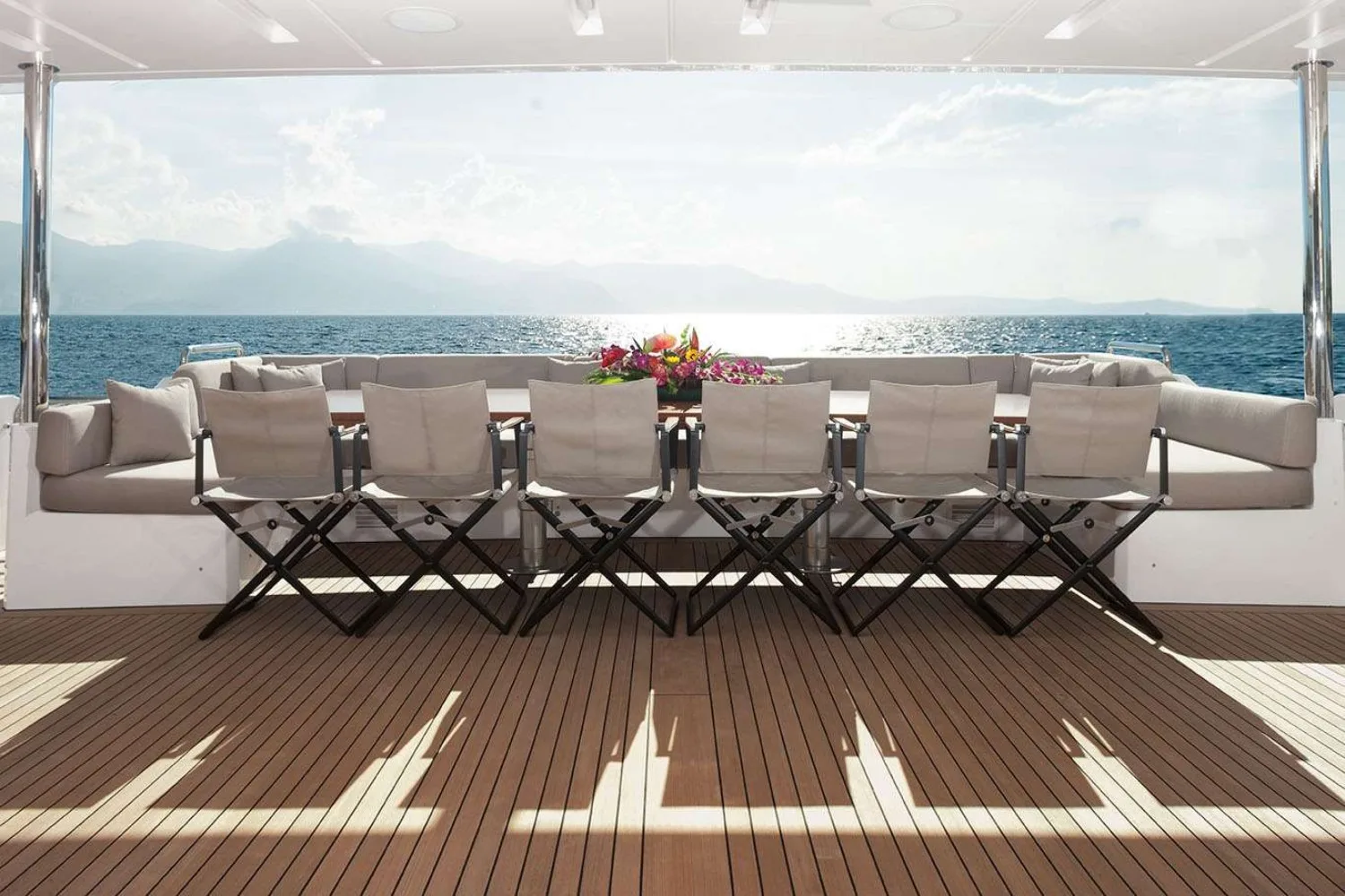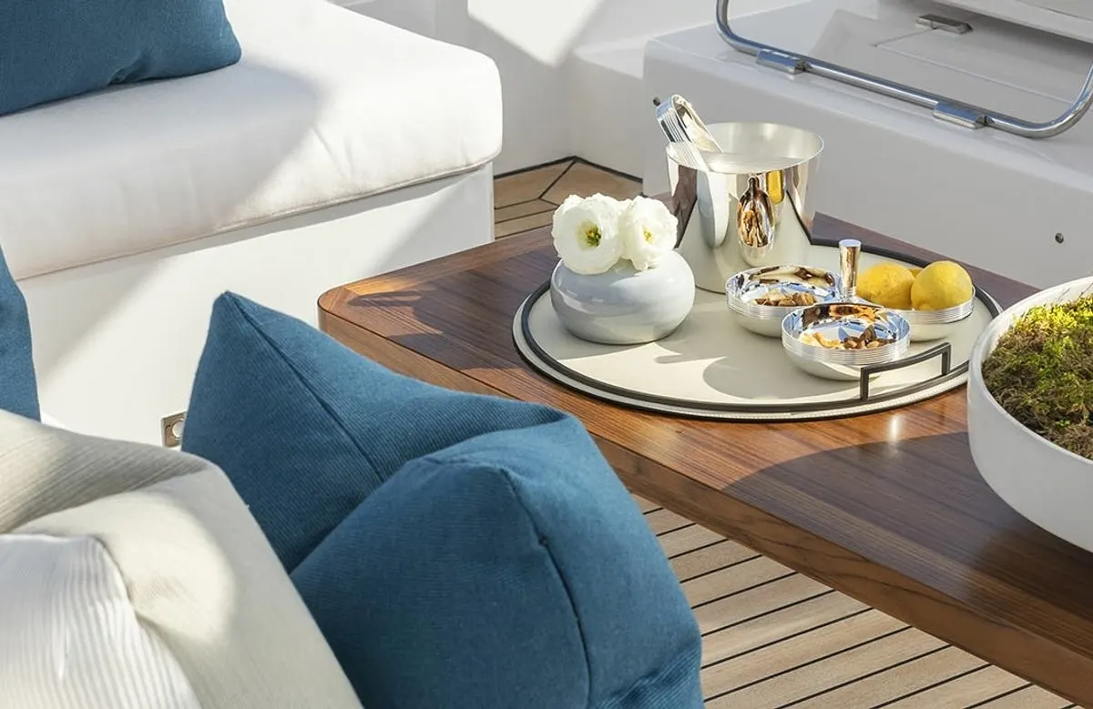 Onboard Rania, each moment is an invitation to indulge in the art of leisure. The sun deck becomes your personal haven, where sunpads invite you to bask in the warmth of the day, and an outdoor bar serves as the perfect setting for evening cocktails under the stars. The foredeck, with its elegant seating and table, offers a serene spot for morning coffee or an intimate dinner with the sea as your backdrop. The beach club, perched at the water’s edge, is a sanctuary of sophistication, inviting you to immerse yourself in the tranquility of your surroundings.