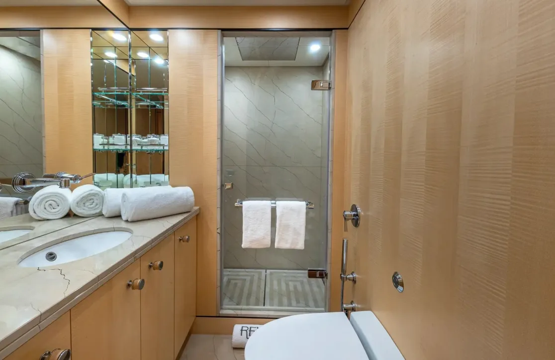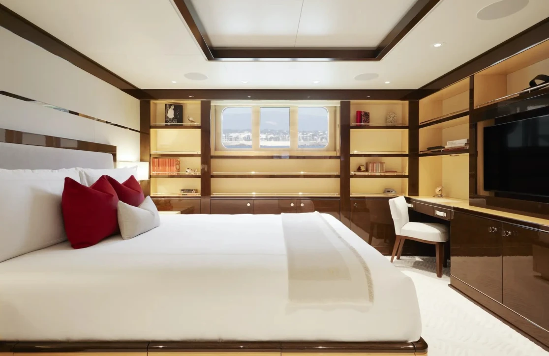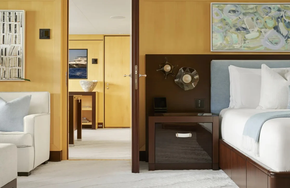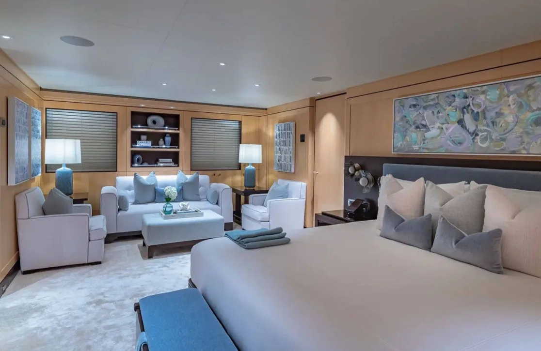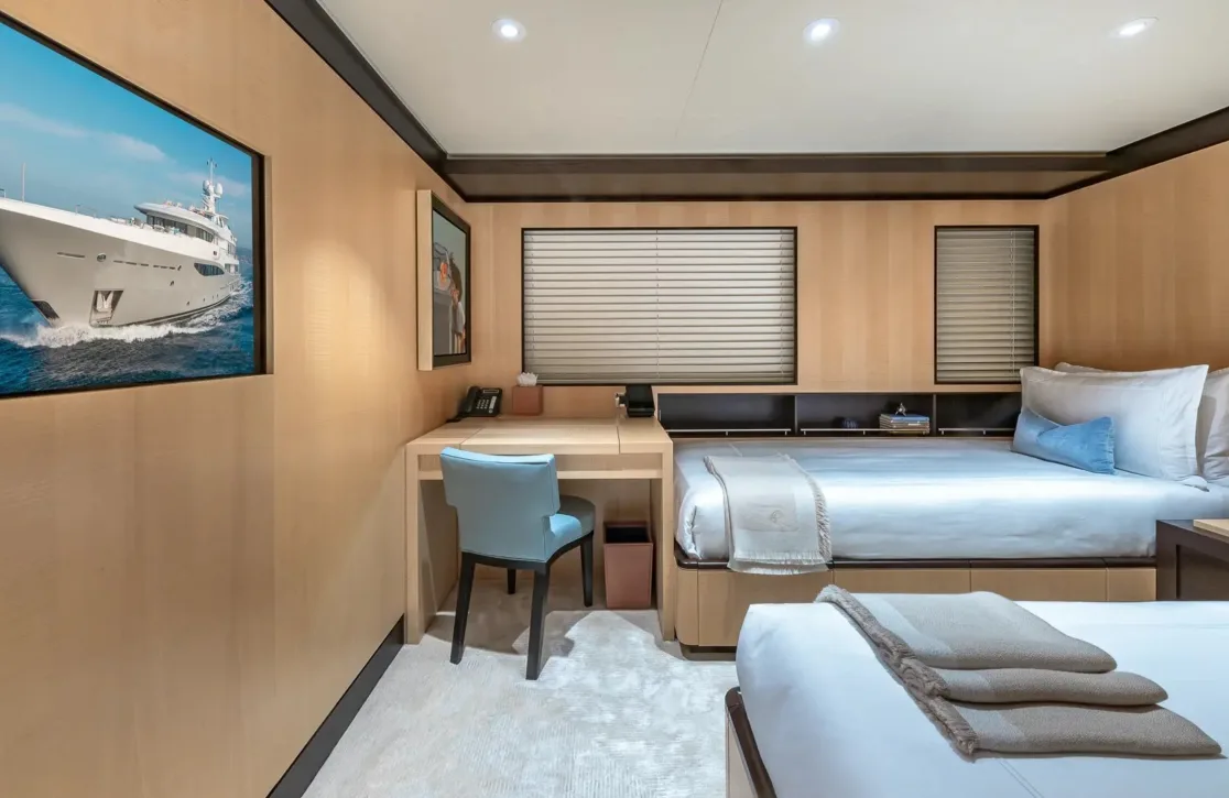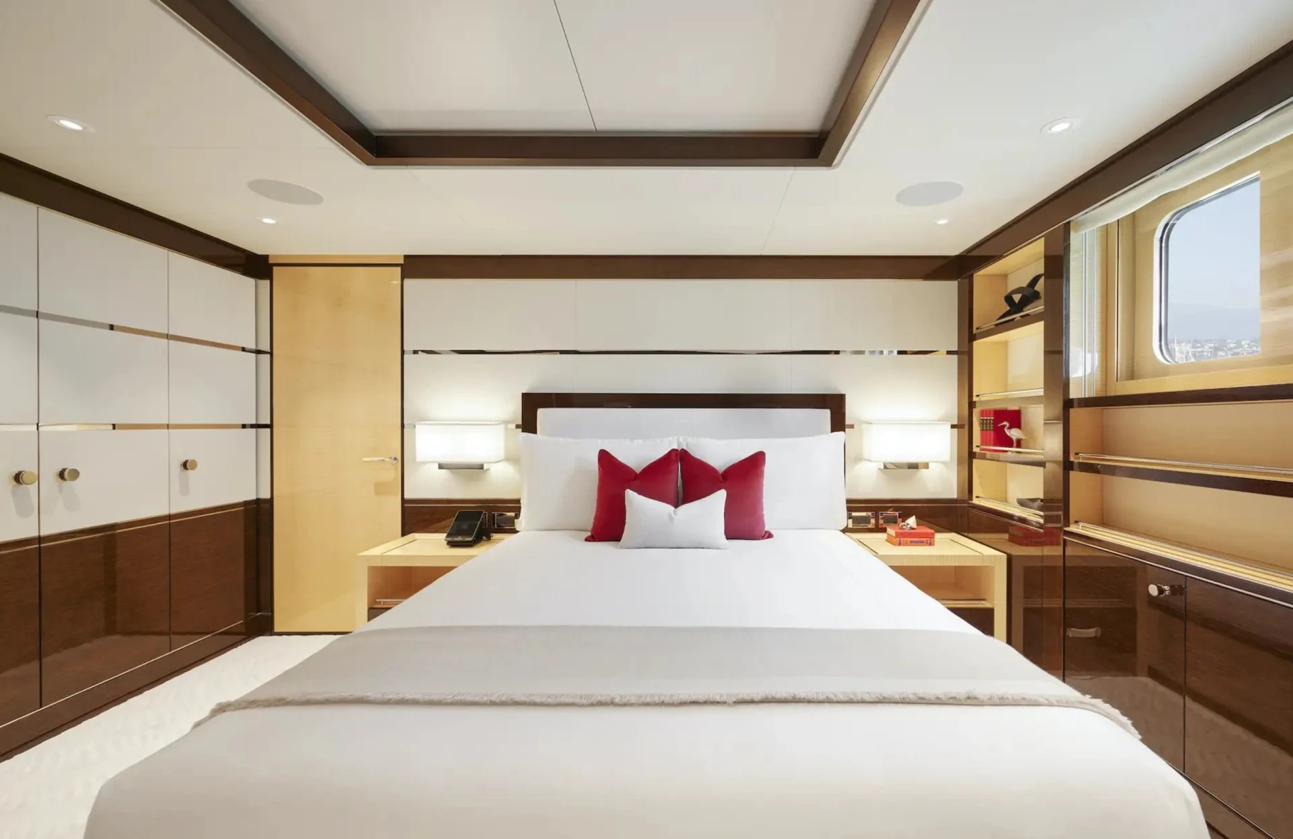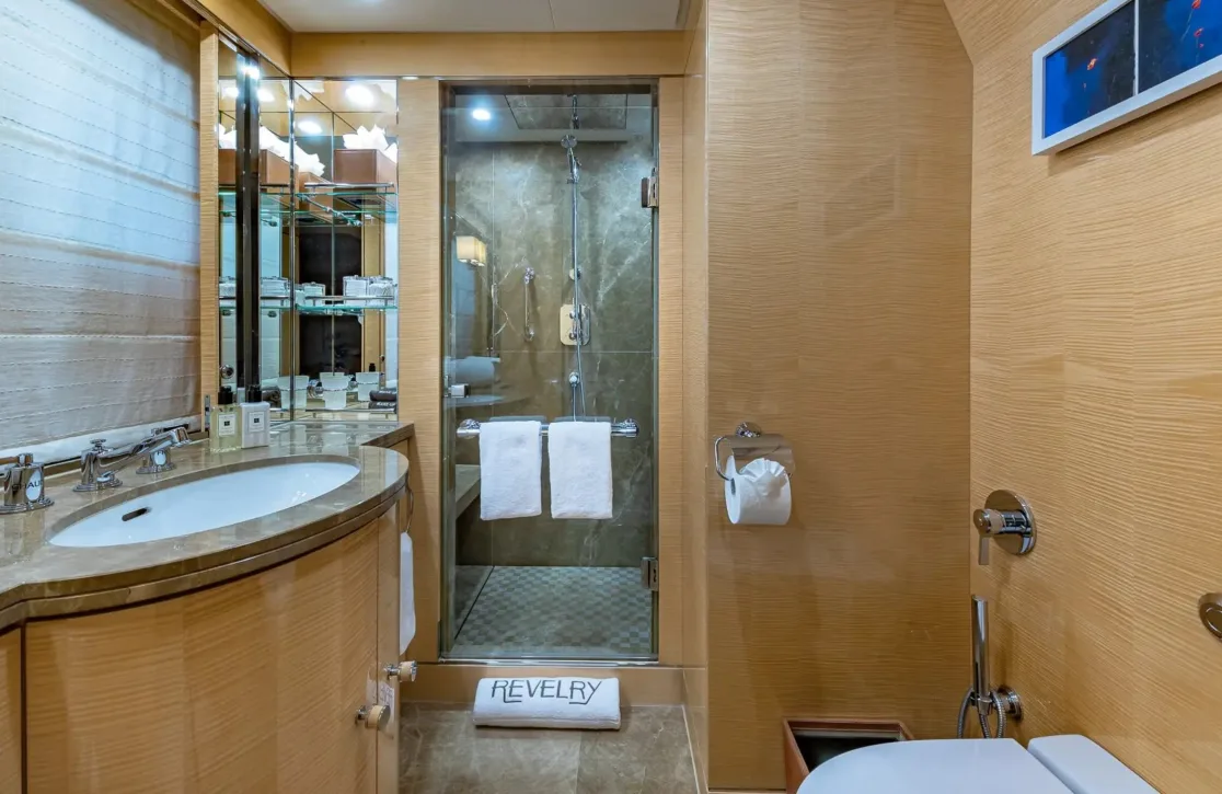 Revelry accommodates up to 12 guests across six opulent cabins, each a sanctuary of comfort and style. The full-beam master suite, with its private lounge, en-suite bath, and walk-in wardrobe, offers a personal retreat. Guests will find restful nights in the VIP stateroom, double cabin, and two convertible cabins with pullman beds, each thoughtfully designed to provide a tranquil haven. Awaking to the gentle sway of the sea, each morning promises a new adventure, with the assurance that the day’s end will bring you back to the refined comfort of your private quarters.