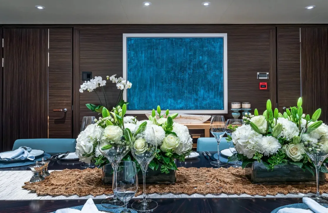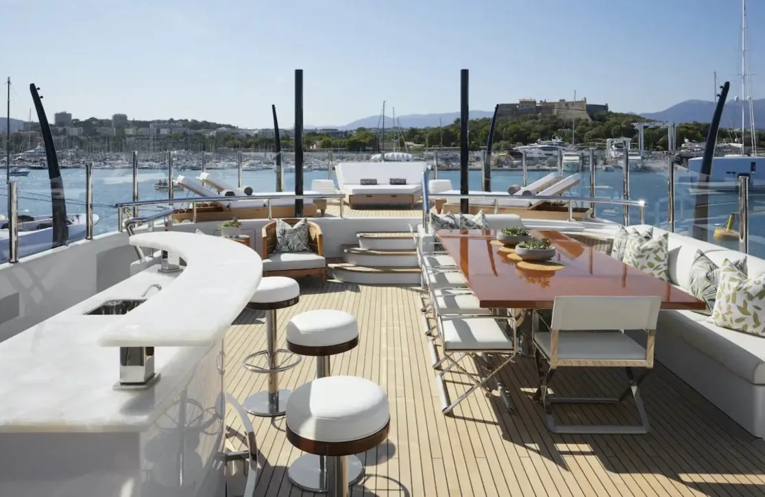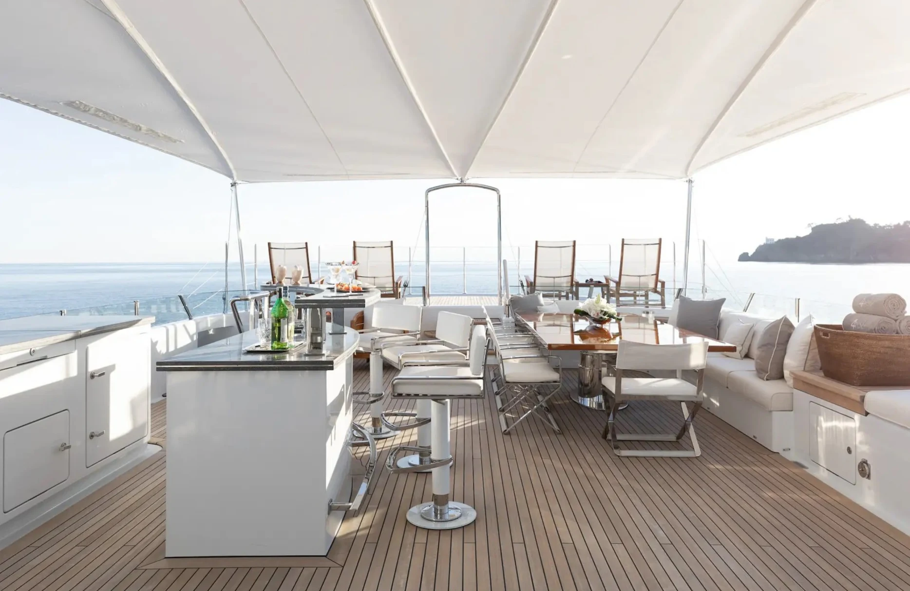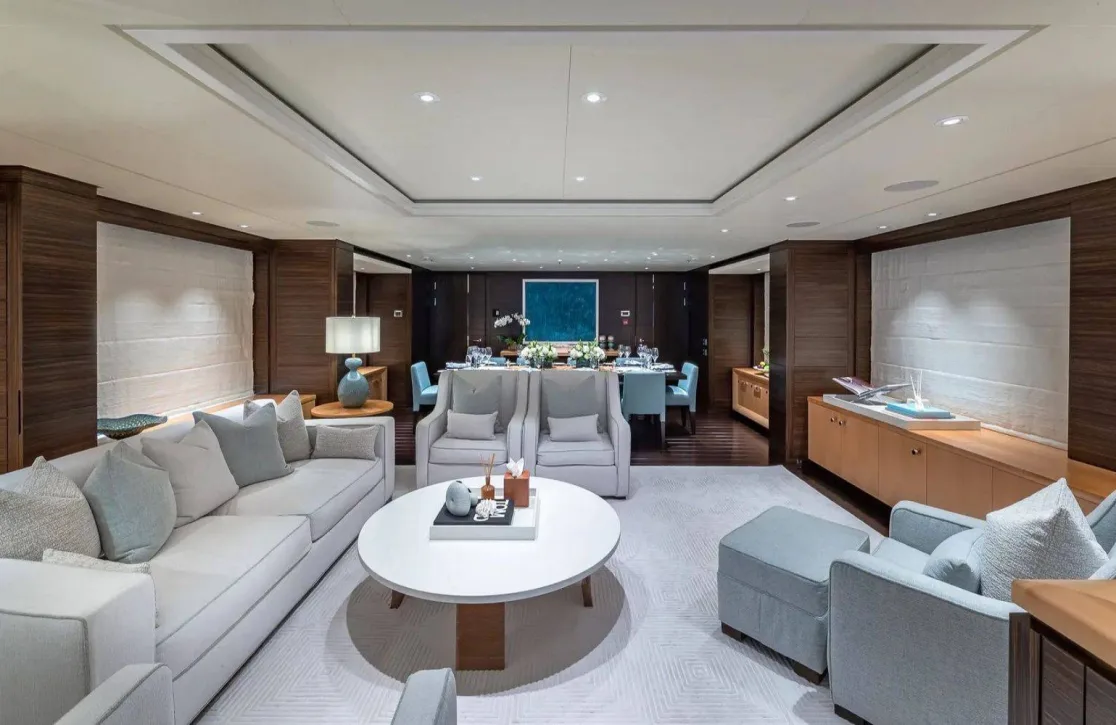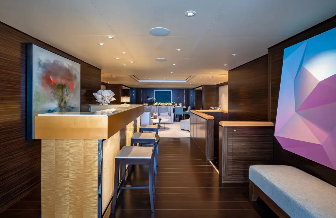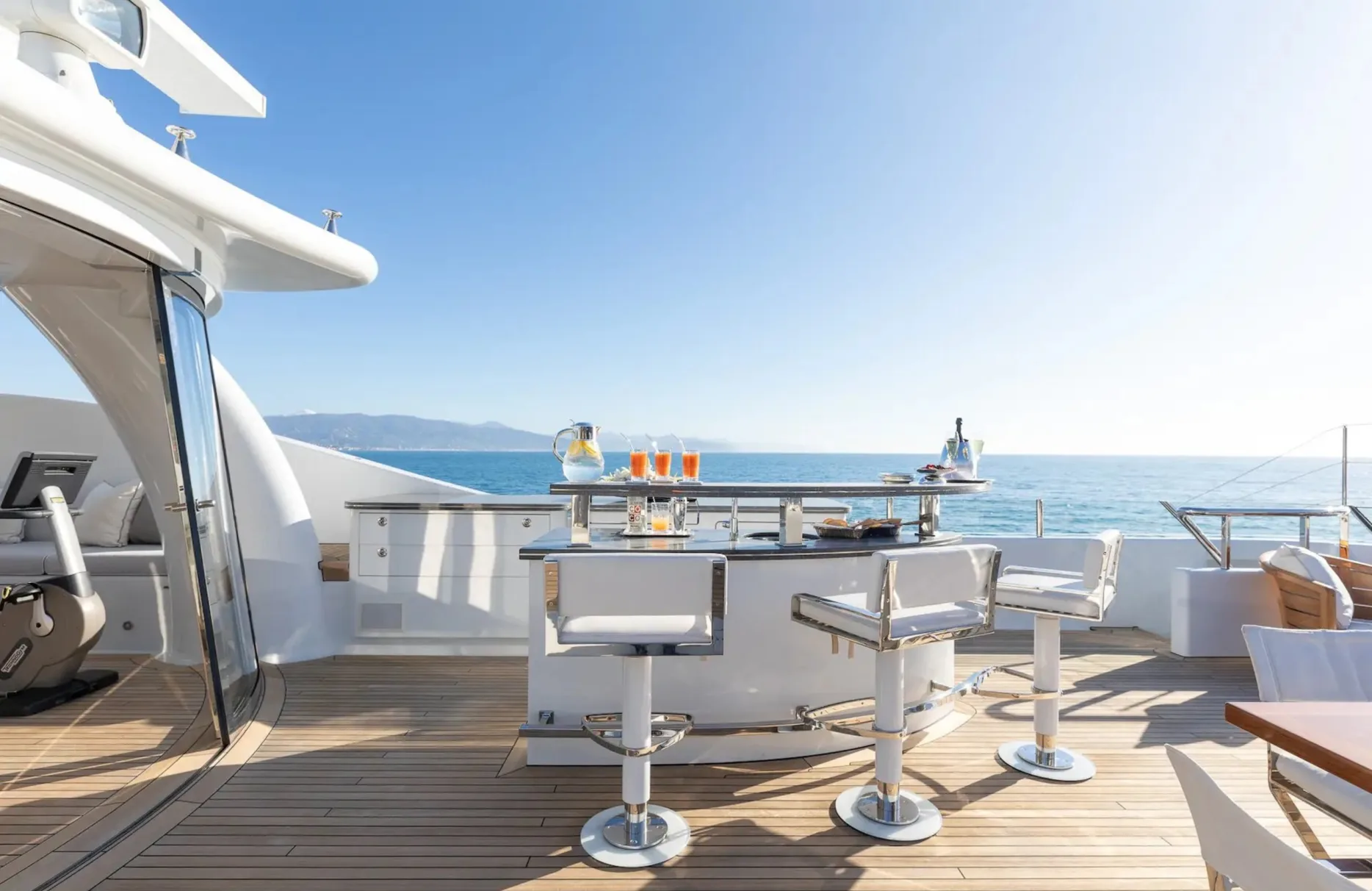 Aboard Revelry, the ambiance is one of serene indulgence, where natural light cascades through large windows highlighting exquisite interiors of light and dark woods, onyx, and marble. Whether enjoying an alfresco meal, lounging on the open-air decks, or unwinding in the jacuzzi, every moment is an invitation to relax and enjoy. The state-of-the-art gym caters to those who seek fitness, while the beach club and swim platform provide direct access to refreshing ocean dips. As evening descends, gather with friends for cocktails under the stars, savoring the seamless blend of indoor and outdoor spaces that Revelry offers.