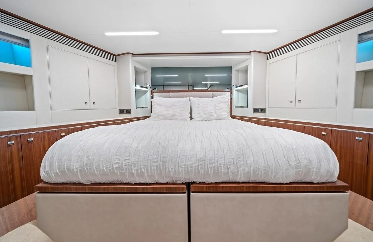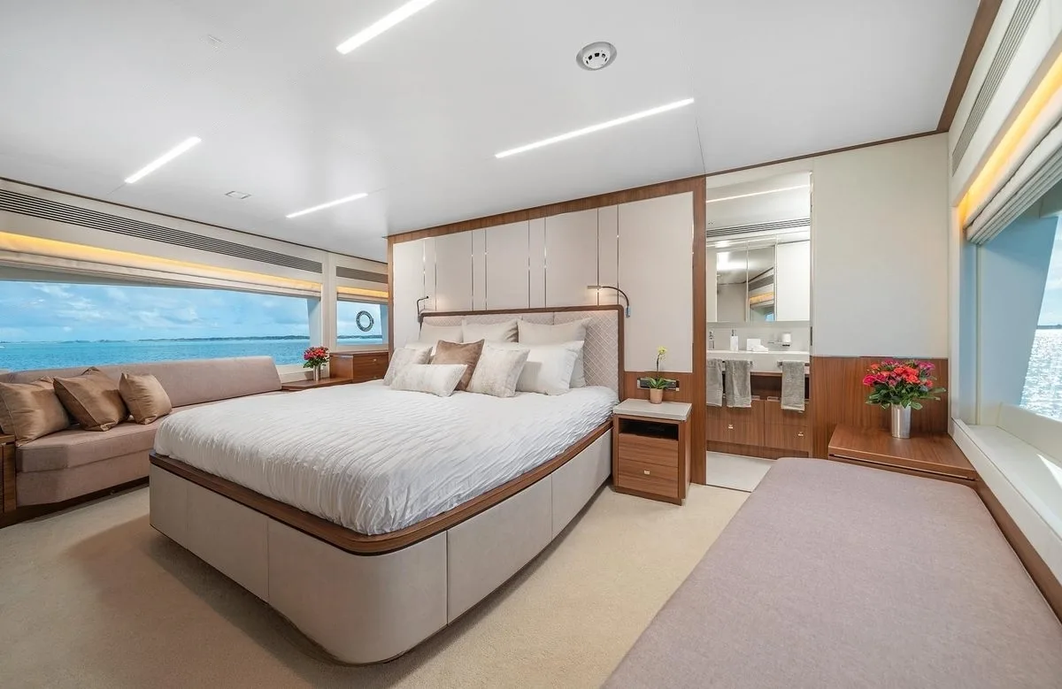 Rio’s accommodations promise serenity and comfort for up to 10 guests across five thoughtfully designed suites. Wake each morning in the full-beam master suite, where the gentle sway of the sea sets a soothing rhythm. Three VIP cabins provide plush retreats, each offering a sanctuary after a day of exploration. An additional cabin can be configured as a twin or double, ensuring flexibility for families or groups. The attentive crew of four ensures every need is met, allowing you to fully immerse in the tranquility of life on the water.
