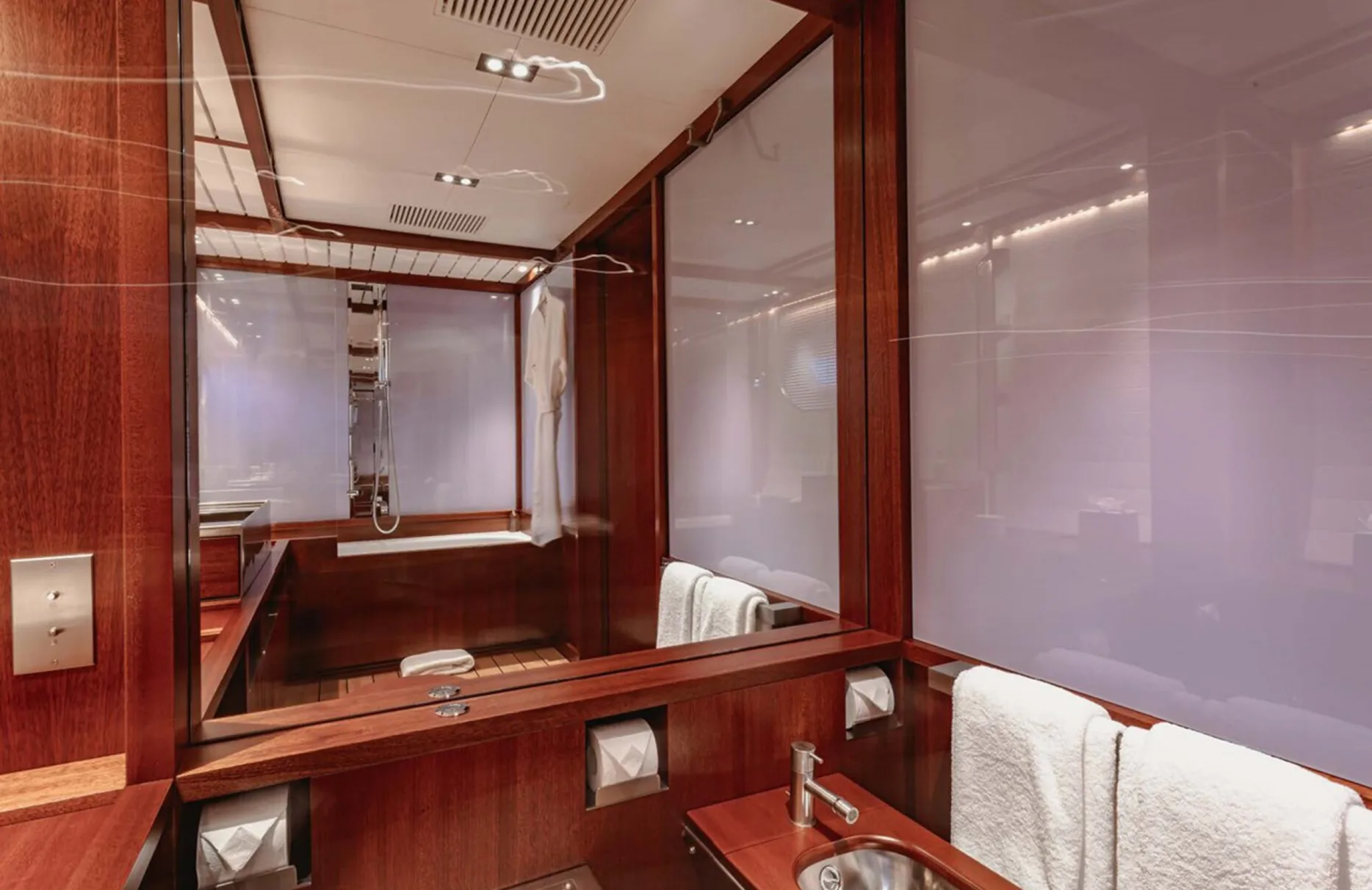 Time aboard Rosehearty is a blend of serene relaxation and vibrant social gatherings. The deck jacuzzi presents a tranquil escape under the stars, while the state-of-the-art gym ensures your wellness routine remains uninterrupted. As the sun dips below the horizon, the yacht transforms into an entertainment haven with video on-demand and iPod docking stations, setting the perfect soundtrack for an evening of refined dining and conversation. Wi-Fi connectivity keeps you connected to the world, should you choose, while air conditioning provides a comfortable retreat from the day’s adventures.