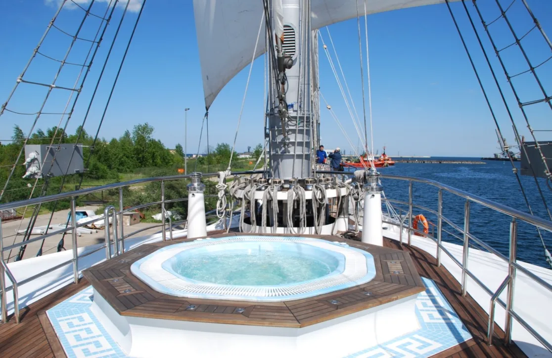 Aboard ‘Running On Waves,’ each day unfolds with exquisite possibilities. Imagine starting your morning with a rejuvenating session in the dedicated spa or maintaining your fitness routine in the well-equipped gym. As the day transitions to evening, gather with fellow travelers in the state-of-the-art movie theatre or unwind in the deck jacuzzi under a canopy of stars. The onboard Wi-Fi keeps you connected, while climate-controlled interiors envelop you in comfort as you explore the yacht’s inviting social spaces.