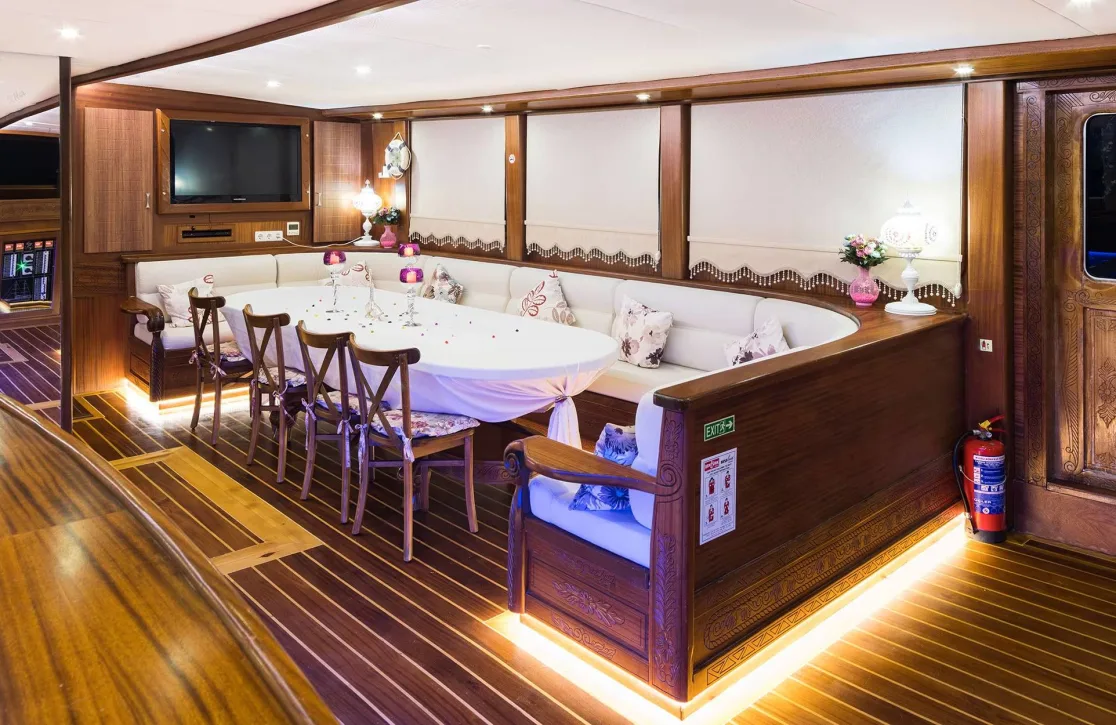 Step aboard the S. NUR TAYLAN and immerse yourself in an environment of seamless indulgence. Whether day or night, the yacht’s spaces offer a harmonious blend of relaxation and entertainment. Enjoy the comfort of climate-controlled interiors courtesy of modern air conditioning, while high-speed Wi-Fi keeps you connected to the world, should you desire. The yacht’s thoughtfully arranged social spaces invite you to unwind in the company of friends or family, offering an ideal setting for lively conversations or quiet reflection under the stars.