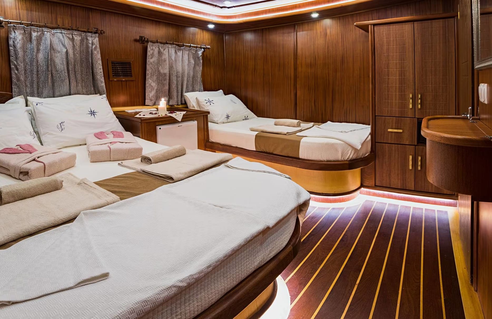 Accommodating up to 16 guests in eight beautifully appointed cabins, the S. NUR TAYLAN promises restful nights and serene mornings. The master suite serves as a tranquil retreat, complemented by five double cabins and two twin cabins, each offering a haven of comfort and privacy. Imagine waking to the gentle sounds of the sea, with sunlight casting a warm glow through your cabin’s windows as you prepare for another day of exploration and relaxation.