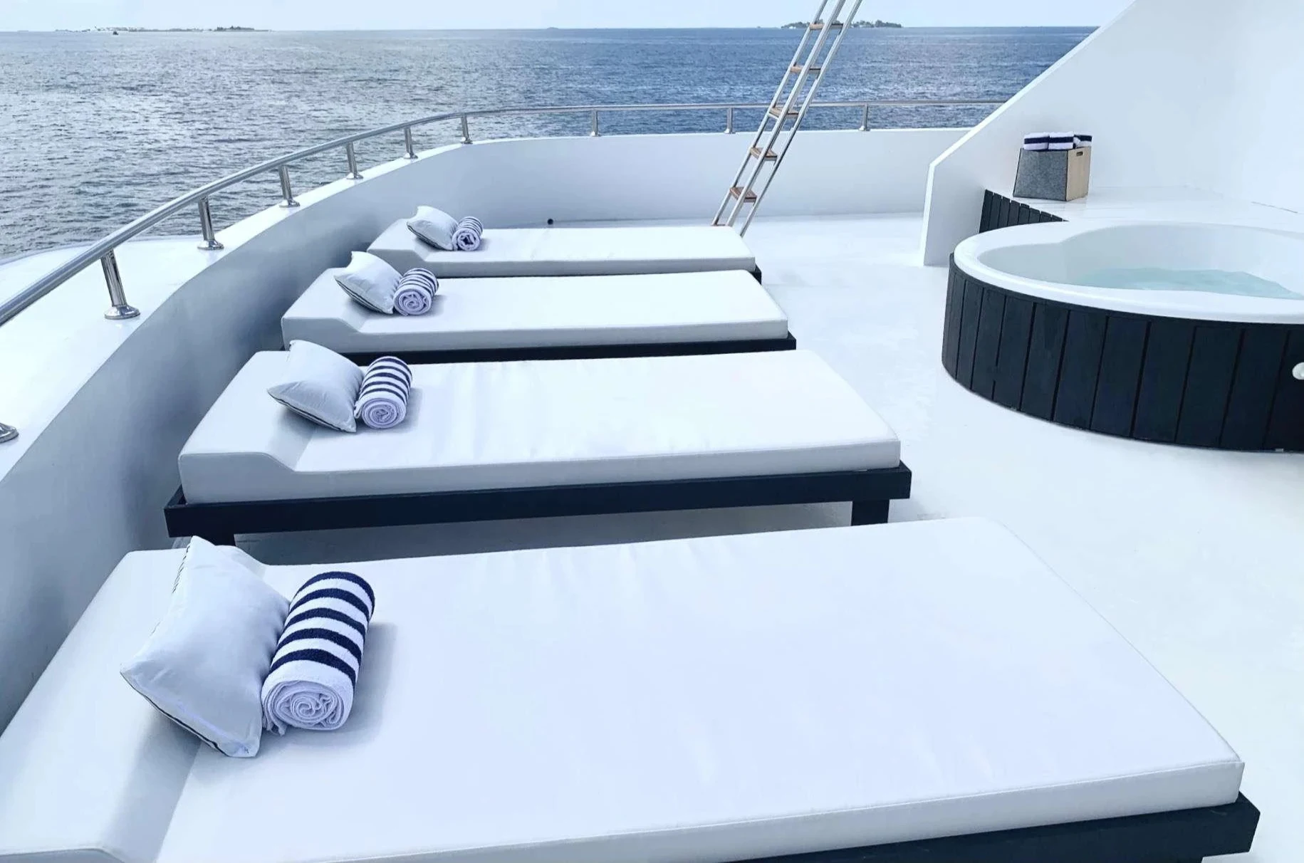 Onboard Safira, every moment is an invitation to indulge in comfort and style. Begin your morning with a refreshing dip in the deck jacuzzi as the sun peeks above the horizon. The open-air deck spaces, adorned with plush sunpads, invite you to lounge under the sun or gather for an evening of stargazing. Throughout your stay, seamless Wi-Fi connectivity ensures you’re never far from the world, unless you choose to be. Meanwhile, the state-of-the-art air conditioning provides a cool escape after a day spent basking in the sun’s warmth.