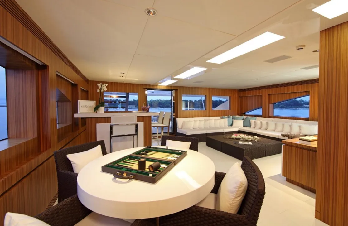 Seashell accommodates up to 10 guests in five exquisitely designed cabins. Wake up to the gentle sway of the waves in the master suite, or choose from two VIP cabins and two twin cabins, each offering a serene retreat. With a variety of sleeping arrangements, including a queen, doubles, and singles, every guest will find their perfect sanctuary. The plush furnishings and thoughtful details create a cozy yet refined atmosphere, ensuring restful nights and rejuvenating mornings as you prepare for another day of exploration.