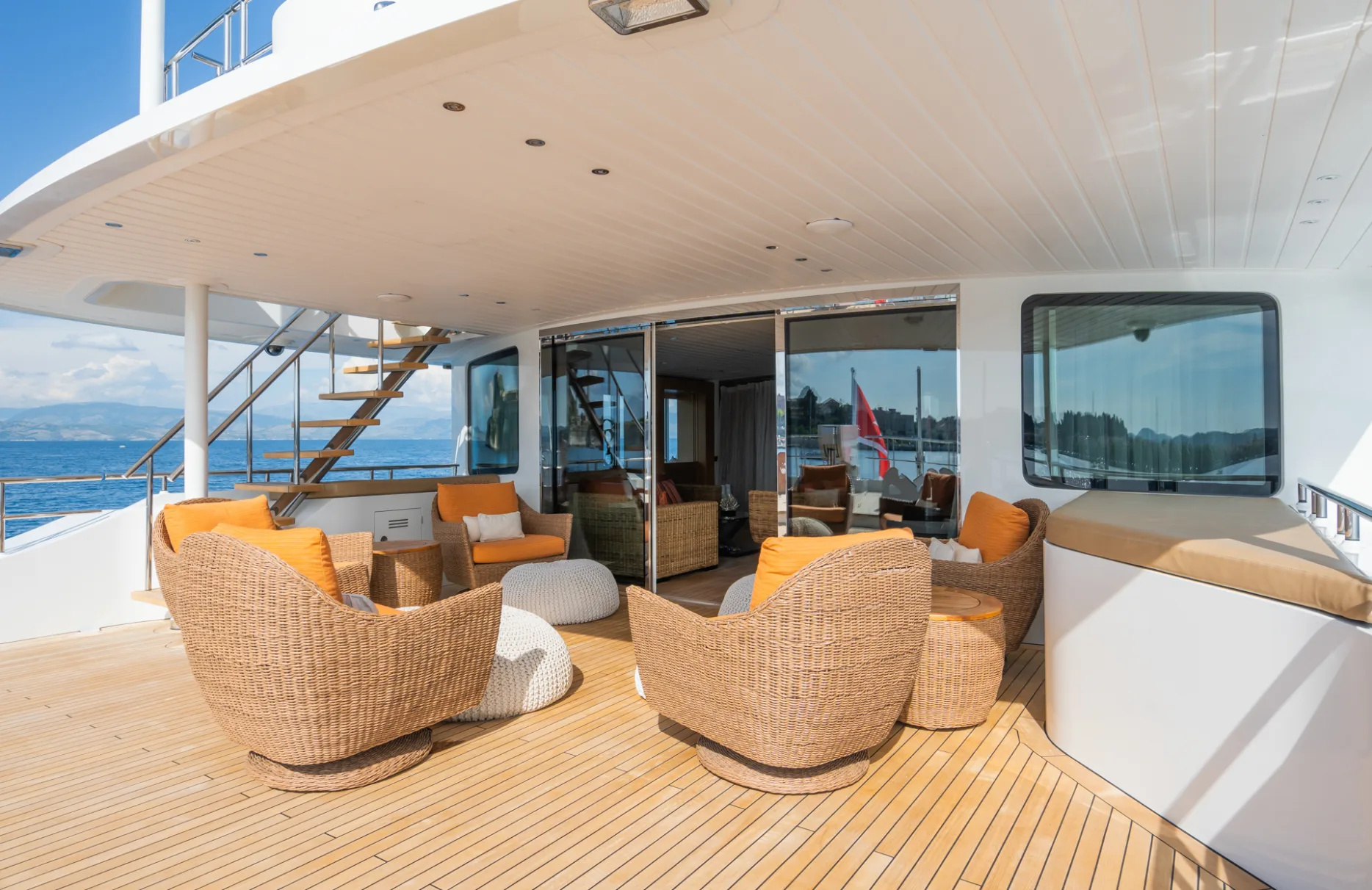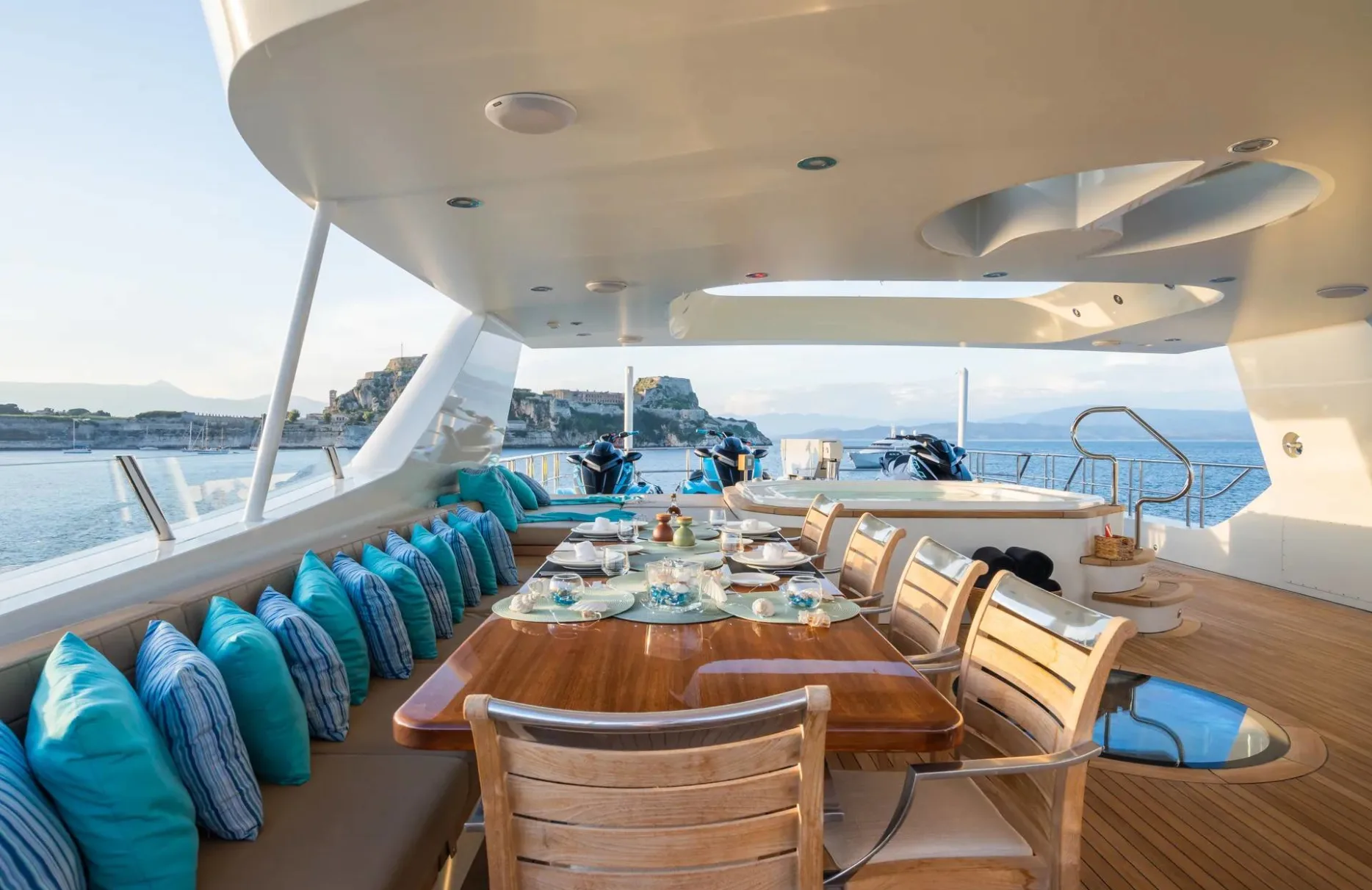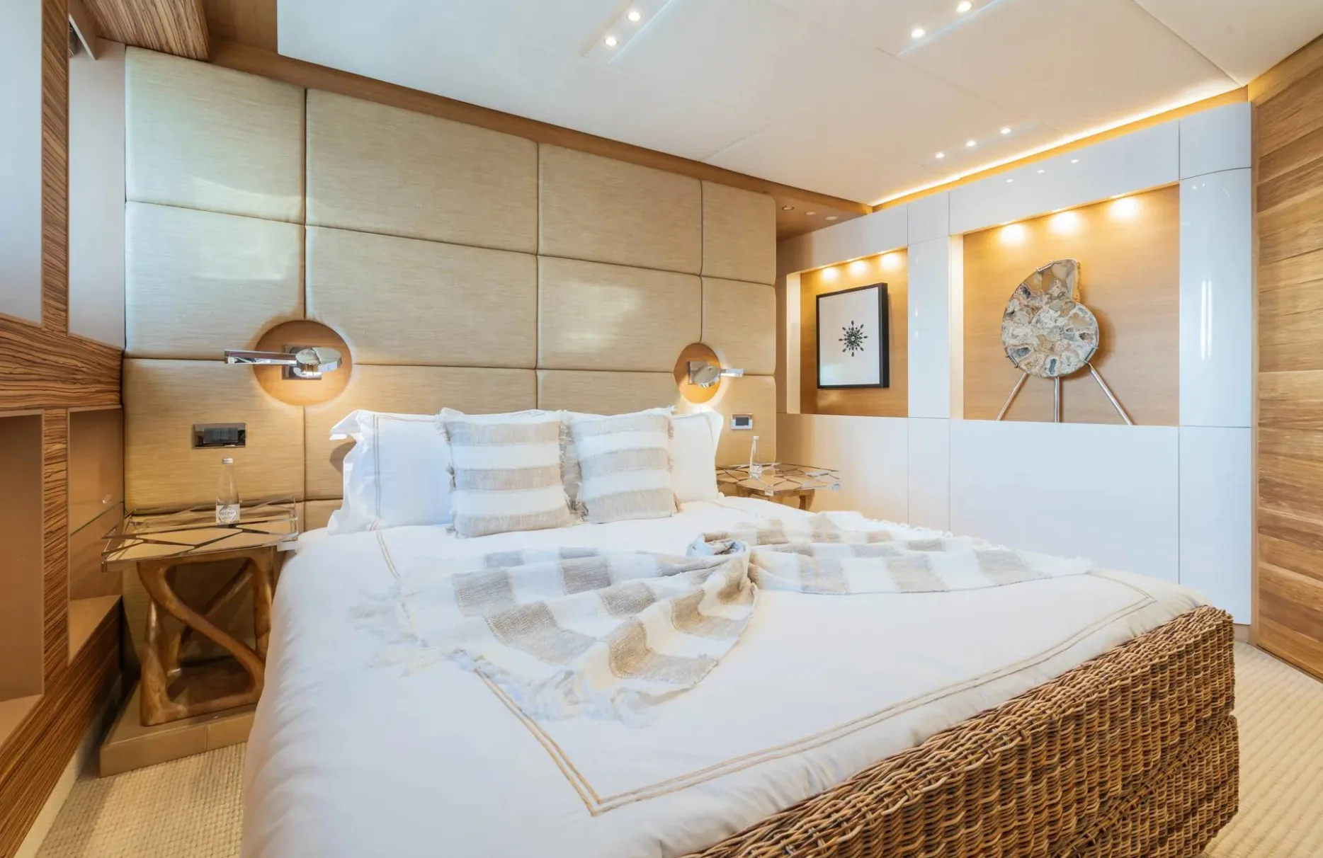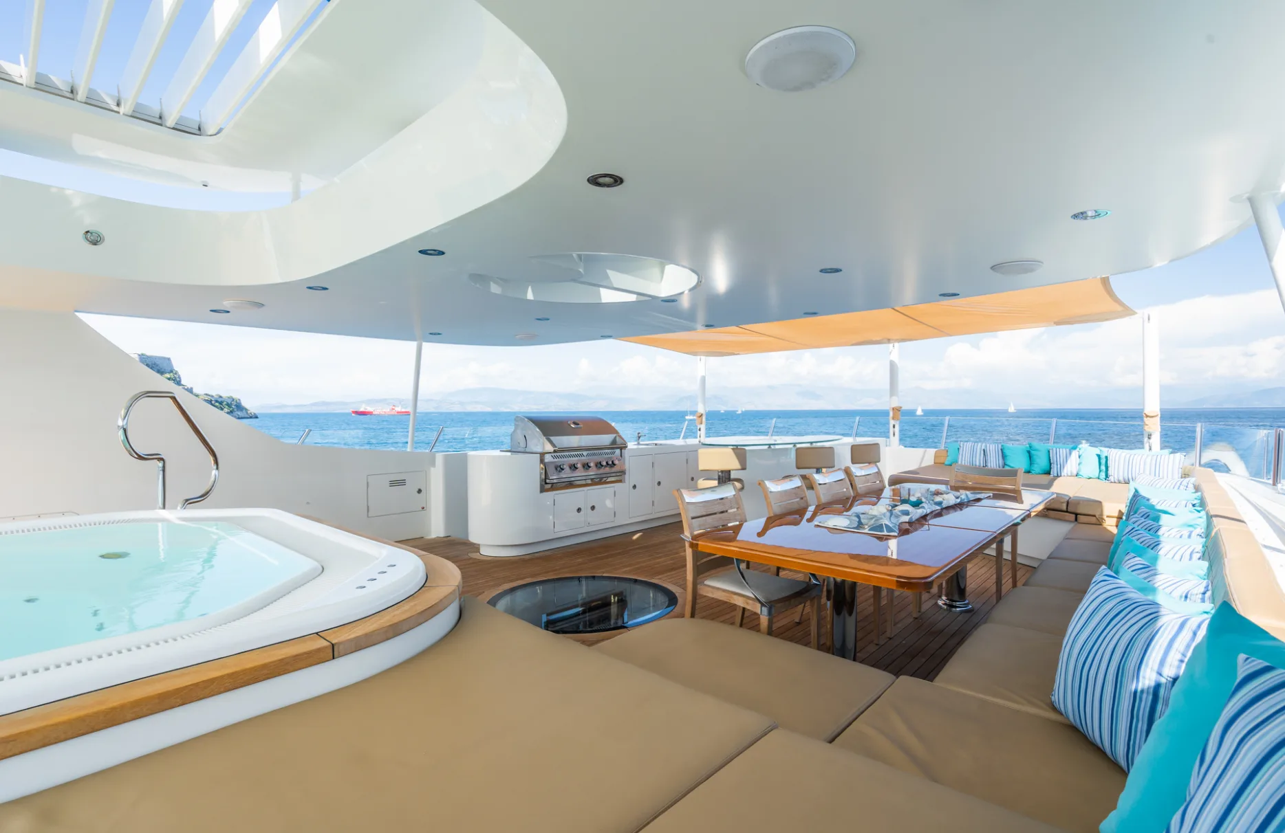 Aboard Serenity, every moment is an invitation to unwind. Relax in the deck jacuzzi with your favorite drink while breathtaking vistas unfold before you. Stay connected with Wi-Fi and Starlink, or immerse yourself in entertainment with video on-demand and satellite TV. The sundeck, adorned with sunpads and an exterior bar, becomes the perfect setting for sunset gatherings, while the BBQ offers al fresco dining experiences under the stars. With air conditioning ensuring comfort throughout your journey, Serenity promises a haven of tranquility and elegance.